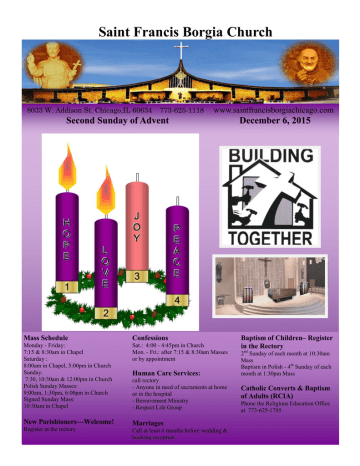 Saint Francis Borgia Church 8033 W. Addison St. Chicago,IL 60634 773-625-1118 www.saintfrancisborgiachicago.com Second Sunday of Advent Mass Schedule Confessions Monday - Friday: 7:15 & 8:30am in Chapel Saturday : 8:00am in Chapel, 5:00pm in Church Sunday: 7:30, 10:30am & 12:00pm in Church Polish Sunday Masses: 9:00am, 1:30pm, 6:00pm in Church Signed Sunday Mass: 10:30am in Chapel Sat.: 4:00 - 4:45pm in Church Mon. - Fri.: after 7:15 & 8:30am Masses or by appointment New Parishioners—Welcome! Marriages Register at the rectory Human Care Services: call rectory - Anyone in need of sacraments at home or in the hospital - Bereavement Ministry - Respect Life Group Call at least 6 months before wedding & booking reception December 6, 2015 Baptism of Children– Register in the Rectory 2nd Sunday of each month at 10:30am Mass Baptism in Polish - 4th Sunday of each month at 1:30pm Mass Catholic Converts & Baptism of Adults (RCIA) Phone the Religious Education Office at 773-625-1705 Za dusze s.p. Wojciecha Kowalskiego w 1 rocz. smierci Julian Strojny w 7 rocz. smierci 6:00 Saturday, December 5, 2015 8:00 Mary Baczewski 5:00 All Our Sick & Homebound Most Forgotten Souls in Purgatory 6:30 Gustawa Gunia Adella i Edward Matyjas Michal Owsiany Sunday, December 6, 2015 - Second Sunday of Advent 7:30 Health & Blessings for Conziglio Panzica Mary Baczewski Patricia Guida William Pestka Adolph & Victoria DeRousseau Josef & Elenor Bosten Paolo Scimeca 9:00 Do Matki Bozej Nieustajacej Pomocy z prosba o laski i pomoc dla naszej rodziny O szczesliwa podroz dla Zofii O Boze Blog. i Opieke Matki Bozej dla Marii z okazji urodzin i imienin O Blog. Boze dla wszystkich ofiarodawcow na renowacje naszego kosciola O zdrowie i Boze Blog. dla Pauli w dniu 5 urodzin oraz o Dary Ducha Sw. dla jej siostr Kamili i Julii Modlimy sie w intencji Ks. Marcina—niech Eucharystia ktora sprawuje, umacnia go i daje mu sile do codziennego ofiarowania sie sluzbie Bogu Mieczyslaw Zabawa w 5 rocz. smierci Kaloyan Gueorguiev o spokoj duszy w 1 rocz. smierci Czeslaw Kita o wieczne zbawienie w 9 rocz. smierci Czeslaw Sepko Zofia Dobosz Jan Balys Stanislaw i Maria Mucha Aleksander Chrzascik Janina i Marian Czaplinski Leokadia i Jan Kopiczko Lukasz Garbacz w 5 rocz. smierci Jan, Maria, Tadeusz i Anna Wlekierak Wladyslaw Komperda w 80 rocz. smierci Michal Owsiany Jadwiga Lipska 10:30 Birthday Blessings for Carolyn Shafer Camille Allegretti Thomas Lytle George Paris 12:00 Melquiades Dorado Gaetano Urbanio Peter Pacyna John O’Hagan 1:30 Przez wstawiennictwo Ojca Pio o potrzebne laski dla Barbary Bochenek z okazji imienin O Blog. Boze dla wszystkich ofiarodawcow na renowacje naszego kosciola Ks. Michal Plakut Jadwiga Makowska Gustawa Gunia Leszek Lewandowski w 37 rocz. smierci Przez wstawiennictwo Sw. Jana Pawla II o zdrowie i potrzebne laski dla Tomasza z okazji urodzin Przez wstawiennictwo Sw. Szarbela o zdrowie i potrzebne laski dla Felicji i Czeslawa z rodzina O Blog. Boze dla wszystkich ofiarodawcow na renowacje naszego kosciola Monday, December 7, 2015 - St. Ambrose 7:15 Francis Fleckinger & Falduto Family 8:30 Gustawa Gunia Michael Owsiany 7:00 Gregory Caruso Tuesday, December 8, 2015 The Immaculate Conception of the Blessed Virgin Mary 6:30 John & Sally Lemker 8:30 John, Mary, & John Jr. Povraznik Alex Kornas Evelyn & Edward McDermot 10:30 Za wszystkich parafian 6:00 For All Parishioners 7:30 Gustawa Gunia Michal Owsiany Wednesday, December 9, 2015 7:15 Sophie Szeszol 8:30 Gustawa Gunia Michael Owsiany Emma Santiago Thursday, December 10, 2015 7:15 All Our Sick & Homebound 8:30 Gustawa Gunia Michael Owsiany Friday, December 11, 2015 7:15 All Our Sick & Homebound 8:30 Tom Schultz Gustawa Gunia Michael Owsiany Saturday, December 12, 2015 - Our Lady of Guadalupe 8:00 Mary Baczewski Gustawa Gunia Michael Owsiany 5:00 Eugene Smuda Sunday, December 13, 2015 - Third Sunday of Advent 7:30 Health & Blessings for Conziglio Panzica Mary Baczewski Tom & Monica Grabowski Paolo Scimeca 9:00 Czeslaw Sepko Zofia Dobosz Anna i Kazimierz Sak - intencja od rodziny Starzyk Michal Owsiany Monika Mrozowska w 3 rocz. smierci 10:30 Giuseppe & Onelia Settefrati 12:00 Enrique T. Esparza Gaetano Urbanio Giacomo Sturiano on 1st ann. of death 1:30 Ks. Francis Plakut Wieslaw Fetela o spokoj duszy Gustawa Gunia Genowefa Podpora Josef Majka i zmarli z rodziny Majka 6:00 Za wszystkich parafian C.W.C. would like to thank all the Bakers, Volunteers, and all the people that purchased baked goods from our Bake Sale. Our profit was $1260.00. We could not have done it without you. Thank You! St. Francis Borgia Mission Statement “St. Francis Borgia nurtures the Roman Catholic Faith and fosters the gifts of the Holy Spirit in all by: Welcoming everyone into our faith community; Celebrating the sacraments together; Providing faith education; Providing an environment for prayerful meditation; Utilizing our time, talents and treasures. We resolve to develop, support, empower, and encourage individuals to reach their spiritual potential for the greater glory of God and the good of His people.” Members of our church community are serving our country in the various branches of the military. Please pray for all of them and their families and especially for those listed below. Matthew J. Albanese James Allision Paul Raymond Barthel Rev. Marcin Bulinski Christopher R. Burdulinski Joseph Vito Burdulinski Luciano Cammuca Sr. James D. Campis Jasper Catalano Kevin Chesney Robert Curtis Tamara DeCaro Shawn Gaffney Gerald Giovannelli Slawomir Glownia Michael Granadon Daniel Jarosz Joseph Patrick Kinney Frank Joseph Klimas James Labbe Tom Lewandowski Michael Labek Matt Manzano Tim McManus ALENDAR VENT C PARISH E SUNDAY, December 6 9:00 Deaf Ministry ........................ Chapel/SC2/Mayall 10:30 CWC Mass ............................................... Church MONDAY, December 7 9:00 Crafters ........................................................... SC3 7:30 Knights of Columbus ....