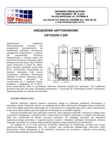 TECHNIKA INSTALACYJNA "TOP-PROJEKT" SP. Z O.O. 54-426 WROCŁAW, UL. OTYŃSKA 8 tel./fax:(0-71) 3550175; 3550980 fax.: 355-45-30 e-mail:[email protected] URZĄDZENIE ANTYODOROWE OXYOZON 2 000 Antyodorowe urządzenie filtrowentylacyjne Oxyozon jest urządzeniem przeznaczonym do neutralizacji substancji złowonnych, odciąganych bezpośrednio z rejonów ich powstawania. Powietrze transportowane z miejsca emisji jest kierowane do komory reakcyjnej, gdzie przepuszczane jest przez silny strumień ozonu emitowany w ilości ok. 40g/h, przez specjalny generator ozonu typu EC-6, umieszczony bezpośrednio na komorze reakcyjnej. Cały proces neutralizacji substancji złowonnych zachodzi w komorze reakcyjnej, gdzie zanieczyszczone powietrze po wymieszaniu się z cząstkami ozonu, przepływa z prędkością ok. 0,78m/s, przez poszczególne złoża co gwarantuje całkowite utlenienie uciążliwych substancji. Tak uzdatnione powietrze tłoczone jest przez wentylator promieniowy i wyrzucane do wytłumionej komory wentylatora, skąd bezpośrednio na zewnątrz do atmosfery. ZASADA DZIAŁANIA: Metoda eliminacji zapachu poprzez ozonizację polega na utlenianiu substancji złowonnych w atmosferze ozonu. Cząsteczki odorów są rozkładane przez silne właściwości utleniające ozonu. Cząsteczka ozonu (O3) oddaje atom tlenu zamieniając się w tym procesie w cząsteczką tlenu (O2), a silnie reaktywujący wolny atom tlenu rozbija cząsteczki zapachu i przekształca je w produkty łagodne. Ozon jest produkowany przez generator ozonu EC, przez specjalne elektrody z użyciem zwykłego tlenu z powietrza zaciąganego z pomieszczenia i wpuszczany do komory reakcyjnej w centrali wentylacyjnej, która jest usytuowana na drodze wywiewu powietrza. Tu następuje mieszanie się strumienia zanieczyszczonego powietrza z wygenerowanym ozonem i utlenianie substancji złowonnych. Komora reakcyjna utrzymuje czas retencji zanim produkty łagodne zostaną wpuszczone do środowiska. Ze względu na to, że ozon, jeśli jest swobodnie wpuszczany do środowiska, uważany jest za gaz zanieczyszczający, konfiguracja złóż, ich wymiary oraz możliwości dodatkowego sterowania ilości dozowanego ozonu, gwarantują, że do atmosfery wyrzucane jest powietrze o stężeniu ozonu poniżej poziomu maksymalnego dopuszczalnego. Dziedziny zastosowania urządzenia Oxyozon to: Oczyszczalnie i pompownie ścieków, Wysypiska i sortownie śmieci, Przetwórstwo żywności (produkcja i obróbka mięsa, przetwórstwo ryb, przetwórstwo mleka), Hodowla zwierząt, przeróbka odpadów zwierzęcych; Inne źródła emisji przykrych zapachów (instalacje mogą być wykonywane organicznych do wszystkich typu: bary, emisji restauracje, produkcyjne, magazyny i inne); Przemysł farmaceutyczny; Przemysł plastykowy i gumowy; Przemysł garbowania skóry; Laboratoria, szpitale; Pralnie. PODSTAWOWE DANE TECHNICZNE Generator ozonu EC-6 wraz z wentylatorem dozującym ozon wydajność urządzenia produkcja ozonu 30-64g/h ilość powietrza 600-1200m3/h wentylator wentylator dozujący ozon do centrali LFS-2160/62-018S wykon. specj. Jednofazowy silnik elektryczny rodzaj zabezpiecze nia napięcie robocze pobór mocy natężenie ilość obrotów klasa szczelności masa gabaryty SxDxW Wentylator główny strumień powietrza ok. 2600 m3/h wentylator promieniowy RVISP/2-25-300T Trójfazowy presostaty rozłączający napięcie w przypadku braku podciśnienia w generatorze lub wzrostu podciśnienia powyżej wartości zadanej 230 V; 50 Hz presostat sprężu wentylatora 0,54 kW generator ozonu EC-6 0,18kW wentylator 3,0A generator ozonu EC-6 1,5A wentylator 2800obr./min. 3,0kW IP65 generator ozonu EC-6 IP 55 wentylator 30kg generator ozonu EC-6 7,8kg wentylator 540x750x300mm 400V; 50 Hz 6,5A 2835obr./min. IP55 29kg 500x640x590mm odorów zakłady