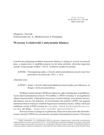 Filo–Sofija Nr 20 (2013/1), s. 89-100 ISSN 1642-3267 Zbigniew Tworak Uniwersytet im. A. Mickiewicza w Poznaniu Wczesny Leśniewski i antynomia kłamcy Leśniewski podejmuje problem antynomii kłamcy w jednej ze swych wczesnych prac, a mianowicie w opublikowanym sto lat temu artykule „Krytyka logicznej zasady wyłączonego środka” (1913). Tytułowa zasada ma postać: (LPEM) Przynajmniej jedno z dwóch zdań kontradyktorycznych musi być prawdziwe (Leśniewski 1913, s. 323). Alternatywnie: (LPEM´) Jeżeli z dwóch zdań kontradyktorycznych jedno jest fałszywe, to drugie z nich jest prawdziwe. Według Leśniewskiego LPEM jest fałszywa, gdyż istnieją pary współfałszywych zdań kontradyktorycznych. W konflikt z LPEM wchodzą w szczególności zdania antynomialne. Zaproponowane przez Leśniewskiego rozwiązanie antynomii kłamcy ma na celu pokazać, że kwestionuje ona jedynie LEPM, nie zagraża natomiast innym ważnym zasadom logicznym (semantycznym). Jedną z nich jest osłabiona wersja LPEM (zwana też z a s a d ą z d a ń k o n t r a d y k t o r y c z n y c h ), zaś drugą – l o g i c z n a z a s a d a s p r z e c z n o ś c i .1 Pewna kwestia wymaga tu wyjaśnienia. Kluczowe znaczenie dla sformułowania i krytyki LPEM ma rozumienie stosunku kontradyktoryczności. Dziwnym 1 Należy wspomnieć, że w późniejszym okresie twórczości, logistycznym, Leśniewski kwestionował wartość naukową swych wczesnych prac (1911–1914). Publikacje z tego okresu opierają się na logice tradycyjnej i charakteryzują się przesadną wręcz precyzją, utrudniającą niekiedy ich przyswojenie. Przedmiotem analiz są wyłącznie zdania o strukturze podmiotowo-orzecznikowej oraz zdania, które można sprowadzić do takich zdań. 90 Zbigniew Tworak więc wydaje się fakt, że przy całej swojej pedanterii Leśniewski nie wyjaśnia, na czym ów stosunek polega. Z podanych przez niego przykładów wnosimy, że zachodzi on pomiędzy przeczącymi sobie zdaniami typu „A jest B” i „A nie jest B”, np. „Centaur posiada ogon” i „Centaur nie posiada ogona”2. Zdanie „Centaur posiada ogon” zwykle traktuje się jako eliptyczną postać zdania „Każdy centaur posiada ogon”. Analogicznie zdanie „Centaur nie posiada ogona” będzie eliptyczną postacią zdania „Żaden centaur nie posiada ogona”. Sugeruje to, że kontradyktoryczność jest słabszym od sprzeczności stosunkiem wykluczania (przeciwieństwa). Jednak wtedy krytyka LPEM byłaby chybiona.3 Leśniewski mówiąc o zdaniach typu „A jest B” i „A nie jest B” jako kontradyktorycznych wypowiada się w sposób skrótowy. W logice tradycyjnej kontradyktorycznymi (contradictoriae) nazywano zdania leżące na przekątnych kwadratu opozycji, które nie mogą być (w tym samym czasie) ani zarazem prawdziwe, ani zarazem fałszywe. Odwołując się do pewnych idei Kazimierza Twardowskiego, można powiedzieć, że przymiotnik „kontradyktoryczne” pełni w przytoczonym kontekście funkcję determinującą: spośród par złożonych ze zdania twierdzącego i zdania przeczącego (bez wyraźnej kwalifikacji jakościowej) wyróżnia on pary, które tradycyjnie uznaje się za kontradyktoryczne (sprzeczne), czyli pary takie, jak: „Chiron posiada ogon” – „Chiron nie posiada ogona” lub „Każdy centaur posiada ogon” – „Pewien centaur nie posiada ogona” (przedmiotem uwagi Leśniewskiego obok zwykłych zdań kategorycznych były jeszcze zdania jednostkowe). Celem Leśniewskiego jest więc pokazanie, że istnieją zdania tradycyjnie uważane – ze względu na formę – za kontradyktoryczne (sprzeczne), które po bliższej analizie semantycznej okazują się współfałszywe, co falsyfikuje LPEM. Dodajmy przy okazji, że pojęcie sprzeczności było przez Leśniewskiego używane raczej w odniesieniu do przedmiotów. Sprzeczność utożsamiał z „mieć [cechę] c i zarazem nie mieć c” (Leśniewski 1912, s. 211). Istotnym składnikiem krytyki LPEM są konwencje dotyczące f u n k c j i s y m b o l i c z n e j (semantycznej) zdań. Ogólnie, funkcja symboliczna wyrażenia jest to cecha polegająca na tym, iż wyrażenie to coś oznacza. Pierwsza ze wspomnianych konwencji ustala, co może symbolizować jakiekolwiek zdanie twierdzące, tj. typu „A jest B” (Leśniewski 1912, s. 216; 1913, s. 324): (K1) 2 Dowolne zdanie typu „A jest B”, o ile posiada funkcję symboliczną, symbolizuje posiadanie przez przedmiot, oznaczany przez podmiot A, cech współoznaczanych przez orzeczenie B. Zwrot „posiada ogon” zastępuje niezręczne „jest ogoniasty”. Dodajmy, że w klasyfikacji zdań kategorycznych Arystotelesa zdania bez wyraźnej kwalifikacji ilościowej nazywa się z d a n i a m i n i e o k r e ś l o n y m i . Zdania postaci „A jest B” kwalifikuje się jako t w i e r d z ą c e n i e o k r e ś l o n e , zaś zdania postaci „A nie jest B” jako p r z e c z ą c e n i e o k r e ś l o n e . Arystoteles twierdzi, że zdania nieokreślone i szczegółowe są wzajemnie zastępowalne w kontekstach sylogistycznych, chociaż nie stwierdza ich równoważności. Uczynił to dopiero Aleksander z Afrodyzji, komentator dzieł Arystotelesa. Zob. Arystoteles Analityki pierwsze I, 4, 26a oraz 7, 29a; Łukasiewicz 1988, s. 14. 3 Wczesny Leśniewski i antynomia kłamcy 91 Podana konwencja wymaga pewnych wyjaśnień i komentarzy. Dotyczy ona tylko zdań twierdzących, co może budzić zdziwienie. Za pewne wyjaśnienie może posłużyć to, że Leśniewski uważał zdania twierdzące za podstawowe. Wskazywał, iż każde zdanie przeczące daje się sprowadzić do zdania twierdzącego z negatywnym orzecznikiem (Leśniewski 1912, s. 204-205).4 Ponadto (K1) należy rozpatrywać wraz z pozostałymi konwencjami, które dotyczą roli wyrazu „nie” i tym samym stanowią pewne jej uzupełnienie. Generalnie, zdania twierdzące są rozumiane jako orzeczenia atrybucji w tym sensie, że mogą oznaczać jedynie stosunki