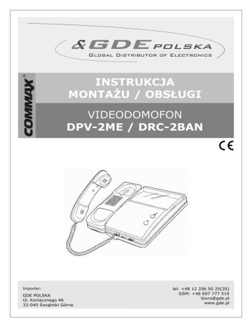 INSTRUKCJA MONTAśU / OBSŁUGI VIDEODOMOFON DPV-2ME / DRC-2BAN Importer: GDE POLSKA Ul. Koniecznego 46 32-040 Świątniki Górne tel. +48 12 256 50 25(35) GSM: +48 697 777 519 [email protected] www.gde.pl DPV 2ME / DRC 2BAN Wygląd zewnętrzny 1. Słuchawka 7. Przełącznik - regulacja głośności sygnału wywołania 2. Głośnik 8. Przełącznik Stand By – włącz. / wyłącz. monitora /systemu/ 3. Ekran CRT 4” czarno - biały 4. Dioda LED - wskazuje czy monitor 9. Przełącznik obrazu jest włączony 5. Przycisk przed wejścia - regulacja ostrości - podgląd obrazu z 10. Przewód zasilający 11. Terminal (schemat poniŜej) 6. Przycisk / dodatkowej stacji otwieranie drzwi -wywołanie (interkom) / -2- DPV 2ME / DRC 2BAN ZANIM ROZPOCZNIESZ MONTAś! Nie montuj monitora i kamery w miejscu naraŜonym na kurz, bezpośrednie promieniowanie słoneczne (lub inne oświetlenie), wysokie temperatury (powyŜej 40 stopni) lub duŜą wilgotność. Nie uszczelniaj silikonem kamery, zaleca się wyłoŜyć wnękę pod kamerę warstwą cienkiego styropianu (tył i ścianki boczne). W miejscach zacieków i duŜej wilgotności koniecznie stosować obudowę z daszkiem typu ODRC. Nie lokuj urządzenia w miejscach naraŜonych na wibracje lub wstrząsy. Monitor powinien być ulokowany w pobliŜu gniazda 220 V. MontaŜ • Wybierz miejsce dla instalacji monitora. • Zamocuj na ścianie uchwyt do montaŜu monitora. Wywierć otwór pośrodku uchwytu. Otwór powinien być wystarczająco duŜy dla przeprowadzenia przewodów elektrycznych. Połącz przewody kamery z monitorem. • Podłącz przewód słuchawki do monitora. • Umieść monitor w uchwytach poprzez ustawienie go ponad hakami znajdującymi się na uchwycie i zsunięcie monitora w dół. Zamocuj monitor do uchwytu wkręcając śrubkę w otwór na górze uchwytu. • Podłącz monitor do gniazdka 220V. • Ustaw przełącznik STAND BY "ON/OFF" w pozycji ON. -3- DPV 2ME / DRC 2BAN Schemat połączeń - przykłady PODSTAWOWE POŁĄCZENIE - kamera + monitor * NIE WCHODZI W SKŁAD ZESTAWU WERSJA I - kamera + monitor +słuchawka *DP-2RV * NIE WCHODZI W SKŁAD ZESTAWU -4- DPV 2ME / DRC 2BAN WERSJA II - kamera + 2 monitory + 2 słuchawki * SŁUCHAWKA DP 2RV MONITOR 1 MONITOR 2 * SŁUCHAWKA DP 2RV KAMERA DRC 2BAN * ZAMEK ELEKTRYCZNY * ZASILANIE ZAMKA * NIE WCHODZI W SKŁAD ZESTAWU UWAGA!!! NALEśY ZWRÓCIĆ POLARYZACJĘ POŁĄCZENIE KABLEM KONCENTRYCZNYM UWAGĘ NA 1 W zestawie nie ma przewodów do połączenia monitora z kamerą. Preferowane jest zastosowanie kabla koncentrycznego (75 Ω) lub parowanego w ekranie. 1 –masa ( - ); Dla połączenia jednej kamery z jednym 2 – wizja, fonia, zasilanie ( + ) monitorem (lub innej kombinacji kamery i dodatkowych monitorów), przy zastosowaniu standardowego kabla telefonicznego (0,5 mm), optymalna odległość wynosi 50 m. Proponowanym przewodem jest YTDY n x 0,5÷1,2 EKW (n – ilość Ŝył) -5- 2 DPV 2ME / DRC 2BAN !!! Przed przystąpieniem do instalacji zaleca się sprawdzenie i podłączenie skonfigurowanego sprzętu w warunkach warsztatowych !!! Podczas montaŜu naleŜy ściśle stosować się do odpowiedniego ze schematów. Nie naleŜy mieszać Ŝył innych instalacji (telefonicznych, alarmowych itp.) z instalacją videodomofonu. Zaleca się prowadzenie obwodu elektrozaczepu osobnym przewodem. OBSŁUGA VIDEODOMOFONU Ustaw przełącznik POWER w pozycji "ON". Wyreguluj siłę dźwięku i głośności. ODWIEDZAJĄCY 1. Odwiedzający naciska przycisk CALL na zewnętrznej kamerze. Przez głośnik monitora rozlega się sygnał -znak czyjejś obecności przed wejściem. 2. Po podniesieniu słuchawki odwiedzający moŜe komunikować się bez konieczności stałego naciskania przycisku. STACJA GŁÓWNA 1. W momencie usłyszenia dźwięku odwiedzający automatycznie ukazuje się na ekranie monitora. 2. Podnieść słuchawkę aby skomunikować się z odwiedzającym. 3. OdłoŜenie słuchawki powoduje powrót do stanu początkowego. ZAMEK ELEKTRYCZNY W celu otwarcia drzwi nacisnąć przycisk uaktywniający zamek elektryczny. OBSERWACJA Po naciśnięciu przycisku MONITOR, obraz na ekranie monitora będzie się ukazywał przez 20 sekund. -6- DPV 2ME / DRC 2BAN Dane techniczne Zasilanie Pobór mocy Monitor Temperatura pracy Waga Wymiary AC 100 ÷ 240 V; 50/60 Hz max 45 VA; w stanie czuwania 15 VA Czarno-biały – 4” płaski - 10°C do + 40°C 1,7kg 196 x 232 x 64 mm Pozbywanie się starych urządzeń elektrycznych Europejska Dyrektywa 2002/96/EC dotycząca ZuŜytych Elektrycznych i Elektronicznych Urządzeń (WEEE) zakłada zakaz pozbywania się starych urządzeń domowego uŜytku jako nieposortowanych śmieci komunalnych. ZuŜyte urządzenia muszą być osobno zbierane i sortowane w celu zoptymalizowania odzyskiwania oraz ponownego przetworzenia pewnych komponentów i materiałów. Przekreślony symbol „kosza” umieszczony na produkcie przypomina klientowi o obowiązku specjalnego sortowania. Konsumenci powinni kontaktować się z władzami lokalnymi lub sprzedawcą w celu uzyskania informacji dotyczących postępowania z ich zuŜytymi urządzeniami elektrycznymi i elektronicznymi. -7- DPV 2ME / DRC 2BAN (TŁUMACZENIE DEKLARACJI ZGODNOŚCI) DEKLARACJA ZGODNOŚCI Wyprodukowane przez: Nazwa & adres fabryki: COMMAX Co.,Ltd. 513-11 Sangdaewon Dong, Jungwon Gu, Sung, Kyunggi Do 462-120, KOREA Oświadcza się, Ŝe produkty: Typ produktu: 4” B/W videodomofon Model: DPV-2ME, DRC-2BAN Spełniają następujące normy: Safety: EMC: EN60065:’1998 EN55022:’1998+A1:’2000 EN55024:’1998+A1:’2001 EN61000-3-2:’2000 EN61000-3-3:’1995 Certyfikowane i raportowane przez: CE certyfikowane wg standardów EN, TUV Pheinland Produkt Safety GmbH. CE EMC raportowane wg standardów EN, ERI CE LVD certyfikowane wg EN60065:’1998, TUV Pheinland Produkt Safety GmbH. Dodatkowe informacje Niniejszym oświadczamy, Ŝe zgodnie z wytycznymi Rady UE są spełnione wszystkie główne wymagania bezpieczeństwa dotyczące następujących
