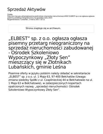 Sprzedaż Aktywów Źródło: http://se.msp.gov.pl/se/ogloszenia-podmiotow-n/sprzedaz-nieruchomosci/4567,ELBEST-sp-z-oo-oglasza-oglaszapisemny-przetarg-nieograniczony-na-sprzedaz-nieru.html Wygenerowano: Czwartek, 2 marca 2017, 02:11 Strona znajduje się w archiwum. „ELBEST” sp. z o.o. ogłasza ogłasza pisemny przetarg nieograniczony na sprzedaż nieruchomości zabudowanej - Ośrodek Szkoleniowo Wypoczynkowy „Złoty Sen” mieszczący się w Złotnikach Lubańskich, gminie Leśna Pisemne oferty w języku polskim należy składać w sekretariacie „ELBEST” sp. z o.o. ul. 1 Maja 63, 97-400 Bełchatów (Uwaga: zmiana siedziby Spółki z ul. Czaplinieckiej 44 w Bełchatowie na ul. 1 Maja 63 w Bełchatowie), w zabezpieczonych kopertach opatrzonych nazwą: „sprzedaż nieruchomości: Ośrodek Szkoleniowo Wypoczynkowy Złoty Sen”. Zarząd Spółki „ELBEST” sp. z o.o. z siedzibą w Bełchatowie ul. 1 Maja 63, 97-400 Bełchatów (zwany dalej Zbywcą) ogłasza pisemny przetarg nieograniczony na sprzedaż nieruchomości zabudowanej - Ośrodek Szkoleniowo Wypoczynkowy „Złoty Sen” mieszczący się w Złotnikach Lubańskich, gminie Leśna, woj. dolnośląskie i jednocześnie ZAPRASZA do zapoznania się z przedmiotową nieruchomością i składania ofert na zakup nieruchomości. I. PRZEDMIOT PRZETARGU. Opis przedmiotu przetargu: Przedmiotem przetargu jest nieruchomość zabudowana, położona w Złotnikach Lubańskich, gmina Leśna , powiat lubański , woj. dolnośląskie, na którą składają się: a. przysługujące „ELBEST” sp. z o.o. do 23.08.2089r. prawo użytkowania wieczystego gruntu Skarbu Państwa, oznaczonego w ewidencji jako działki: ● nr 344/4 (o pow. 8 377,00m2, Obręb 0015 Złotniki Lubańskie), dla której Sąd Rejonowy w Lubaniu V Wydział Ksiąg Wieczystych prowadzi księgę wieczystą KW nr JG1L/00024253/2, ● nr 344/3 (o pow. 1 746 ,00m2, Obręb 0015 Złotniki Lubańskie) , dla której Sąd Rejonowy w Lubaniu V Wydział Ksiąg Wieczystych prowadzi księgę wieczystą KW nr JG1L/00024253/2, a. przysługujące „ELBEST” sp. z o.o. do 05.12.2089r. prawo użytkowania wieczystego gruntu Skarbu Państwa, oznaczonego w ewidencji jako działka: ● nr 324/2 (o pow. 3 900 ,00m2, Obręb 0010 Stankowice ) , dla której Sąd Rejonowy w Lubaniu V Wydział Ksiąg Wieczystych prowadzi księgę wieczystą KW nr JG1L/00013688/0, a. przysługujące „ELBEST” sp. z o.o. prawo własności do działki, oznaczonej w ewidencji jako działka: ● nr 324/6 (o pow. 500 ,00m2, Obręb 0010 Stankowice ), dla której Sąd Rejonowy w Lubaniu V Wydział Ksiąg Wieczystych prowadzi księgę wieczystą KW nr JG1L/00018817/9, a. prawo własności budynków wchodzących w skład OSW „Złoty Sen”, w tym: ● budynek konferencyjno – hotelowy. Budynek stanowi zaplecze hotelowo - konferencyjne z salą na 120 osób, wyposażoną w dźwiękoszczelną ruchomą ścianę pozwalającą na wydzielenie dwóch niezależnych pomieszczeń, każde z osobnym wejściem i holem. Sala wyposażona jest w profesjonalny sprzęt audio - wizualny, nagłaśniający oraz zintegrowany system sterowania wszystkimi mediami, ekranem oraz oświetleniem. W budynku konferencyjno – hotelowym znajduje się także 2-torowa kręgielnia, bar oraz stół bilardowy. Budynek posiada stolarkę okienną i drzwiową z drewna klejonego, ściany zewnętrzne murowane z pustaków, ścianki działowe z płyt kartonowo gipsowych, dach pokryty blachodachówką. Powierzchnia użytkowa budynku wynosi 939 m2, ● budynek recepcji. W budynku, oprócz recepcji ośrodka, znajduje się gabinet konferencyjny dla 24 os. Budynek posiada stolarkę okienną i drzwiową z PCV, ściany zewnętrzne z cegły, obłożone kamieniem w dolnej części, w górnej obłożone panelami typu siding, posadzki wykonane z płytek ceramicznych, ściany gipsowe, dach pokryty blachodachówką. Powierzchnia użytkowa budynku wynosi 168 m2, ● kawiarnia. Ogólna powierzchnia budynku wynosi 208,4 m2 w tym: sala kawiarni, bufet i toalety 104 m2. Kawiarnia dysponuje 35 miejscami konsumpcyjnymi. Budynek posiada stolarkę okienną i drzwiową z PCV, ściany zewnętrzne z cegły, obłożone kamieniem w dolnej części, w górnej obłożone panelami typu siding, posadzki wykonane z płytek ceramicznych, ściany gipsowe, dach pokryty blachodachówką. ● budynek restauracyjny. W budynku restauracji mieści się sala bankietowa z zapleczem kuchenno- magazynowym o powierzchni 306,6 m2 w tym sala restauracyjna o powierzchni 130 m2, mieszcząca 120 os. Oprócz restauracji w budynku znajdują się również pomieszczenia, które były wykorzystywane jako Gabinety Odnowy Biologicznej. ● domki „Brda” (5 szt.). 4-osobowe dwukondygnacyjne górskie chaty wyposażone w: salon, dwie sypialnie, aneks kuchenny oraz pełny węzeł sanitarny z własnym ogrzewaniem wodnym i piecem c.o. Podłoga z paneli, w łazience z prysznicem wyłożona płytkami. Stolarka okienna i drzwiowa drewniana, ściany zewnętrzne i wewnętrzne drewniane, pokrycie dachu blacha dachówkowa. Łączna powierzchnia użytkowa domków wynosi 272 m2, ● domki „Legar” (8 szt.). Dwukondygnacyjne domki z salonem, jedną, dwiema lub trzema sypialniami, aneksem kuchennym oraz pełnym węzłem sanitarnym. Budynki z dachem dwuspadowym o konstrukcji drewnianej pokryte blachodachówką, elewacja –okładzina z desek, stolarka okienna i drzwiowa drewniana. Powierzchnia użytkowa domków wynosi od 45 do 100 m2, ● domek „Bungalow”. 3-pokojowy domek letni z własnym ogrzewaniem wodnym i piecem c.o. Podłoga z paneli, w łazience z prysznicem wyłożona płytkami. Dach czterospadowy w konstrukcji drewniano-krokwiowej, pokryty blachodachówką, elewacja - okładzina z paneli winylowych, stolarka drzwiowa i okienna z aluminium. Powierzchnia budynku 60 m2. ● baszta. Kamienna baszta znajduje się w pobliżu budynku konferencyjno-hotelowego. Jest to miejsce widokowe na okoliczne tereny, ale również daje mo
