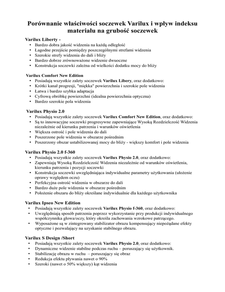 Porównanie właściwości soczewek Varilux i wpływ indeksu materiału na grubość soczewek Varilux Liberty • • • • • Bardzo dobra jakość widzenia na każdą odległość Łagodne przejście pomiędzy poszczególnymi strefami widzenia Szerokie strefy widzenia do dali i bliży Bardzo dobrze zrównoważone widzenie dwuoczne Konstrukcja soczewki zależna od wielkości dodatku mocy do bliży Varilux Comfort New Edition • Posiadają wszystkie zalety soczewek Varilux Libery, oraz dodatkowo: • Krótki kanał progresji, "miękka" powierzchnia i szerokie pole widzenia • Łatwa i bardzo szybka adaptacja • Cyfrową obróbkę powierzchni (idealna powierzchnia optyczna) • Bardzo szerokie pola widzenia Varilux Physio 2.0 • Posiadają wszystkie zalety soczewek Varilux Comfort New Edition, oraz dodatkowo: • Są to innowacyjne soczewki progresywne zapewniające Wysoką Rozdzielczość Widzenia niezależnie od kierunku patrzenia i warunków oświetlenia • Większa ostrość i pole widzenia do dali • Poszerzone pole widzenia w obszarze pośrednim • Poszerzony obszar ustabilizowanej mocy do bliży - większy komfort i pole widzenia Varilux Physio 2.0 f-360 • Posiadają wszystkie zalety soczewek Varilux Physio 2.0, oraz dodatkowo: • Zapewniają Wysoką Rozdzielczość Widzenia niezależnie od warunków oświetlenia, kierunku patrzenia i pozycji soczewki • Konstrukcja soczewki uwzględniająca indywidualne parametry użytkowania (ułożenie oprawy względem oczu) • Perfekcyjna ostrość widzenia w obszarze do dali • Bardzo duże pole widzenia w obszarze pośrednim • Położenie obszaru do bliży określane indywidualnie dla każdego użytkownika Varilux Ipseo New Edition • • • Posiadają wszystkie zalety soczewek Varilux Physio f-360, oraz dodatkowo: Uwzględniają sposób patrzenia poprzez wykorzystanie przy produkcji indywidualnego współczynnika głowa/oczy, który określa zachowania wzrokowe patrzącego. Wyposażone są w zintegrowany stabilizator obrazu kompensujący niepożądane efekty optyczne i pozwalający na uzyskanie stabilnego obrazu. Varilux S Design /Short • • • • • Posiadają wszystkie zalety soczewek Varilux Physio 2.0, oraz dodatkowo: Dynamiczne widzenie stabilne podczas ruchu – poruszający się użytkownik. Stabilizację obrazu w ruchu – poruszający się obraz Redukcja efektu pływania nawet o 90% Szeroki (nawet o 50% większy) kąt widzenia Varilux S f-360 • • Posiadają wszystkie zalety soczewek Varilux S Design / Short, oraz dodatkowo: Konstrukcja soczewki uwzględniająca indywidualne parametry użytkowania (ułożenie oprawy względem oczu) co zapewnia jeszcze szerszy kąt widzenia i jeszcze lepszą stabilizację obrazu Varilux S 4D • • • Posiadają wszystkie zalety soczewek Varilux S f-360, oraz dodatkowo: Poprzez uwzględnienie specyfiki oka dominującego uzyskujemy wpływ na 4-ty wymiar – czas, uzyskując znaczne skrócenie czasu reakcji na bodźce wzrokowe Uwzględniają sposób patrzenia poprzez wykorzystanie przy produkcji indywidualnego współczynnika głowa/oczy, który określa zachowania wzrokowe patrzącego (podobnie jak w Varilux Ipseo New Edition) Varilux Comfort New Edition, Physio 2.0, Physio 2.0 f-360, Ipseo New Edition oraz Varilux S Design / Short i Varilux S f-360 są również dostępne z opcją Eyecode Varilux S 4D ma opcję Eyecode w standardzie Zalety Eyecode: • Znaczne skrócenie adaptacji do nowych okularów • Natychmiastowe - po założeniu okularów - komfort i precyzja widzenia we wszystkich kierunkach patrzenia Orientacyjne porównanie grubości soczewek w odniesieniu do materiału podstawowego: Materiał Grubość w odniesieniu do materiału podstawowego Orma index 1,5 100% Ormix index 1,6 80% Stylis index 1,67 72% Lineis index 1,74 65% Podane w tabeli wartości są przybliżone i poddane dla soczewek o tej samej średnicy. Im większa moc soczewek, tym wpływ indeksu materiału na grubość jest większy.