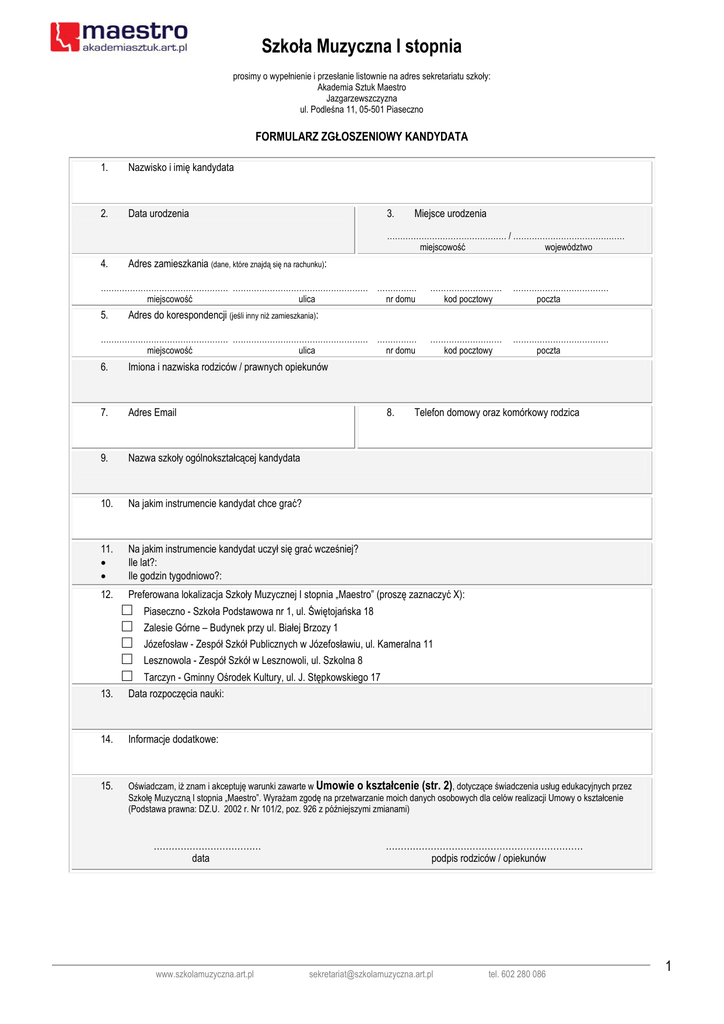 Szkoła Muzyczna I stopnia prosimy o wypełnienie i przesłanie listownie na adres sekretariatu szkoły: Akademia Sztuk Maestro Jazgarzewszczyzna ul. Podleśna 11, 05-501 Piaseczno FORMULARZ ZGŁOSZENIOWY KANDYDATA 1. Nazwisko i imię kandydata 2. Data urodzenia 3. Miejsce urodzenia ……………………………………… / …………………………………… miejscowość województwo 4. Adres zamieszkania (dane, które znajdą się na rachunku): ………………………………………… …………………………………………… …………… miejscowość ulica nr domu 5. ……………………………… poczta ……………………… kod pocztowy ……………………………… poczta Adres do korespondencji (jeśli inny niż zamieszkania): ………………………………………… …………………………………………… …………… miejscowość ulica nr domu 6. Imiona i nazwiska rodziców / prawnych opiekunów 7. Adres Email 9. Nazwa szkoły ogólnokształcącej kandydata 10. Na jakim instrumencie kandydat chce grać? 11. • • Na jakim instrumencie kandydat uczył się grać wcześniej? Ile lat?: Ile godzin tygodniowo?: 12. ……………………… kod pocztowy 8. Telefon domowy oraz komórkowy rodzica Preferowana lokalizacja Szkoły Muzycznej I stopnia „Maestro” (proszę zaznaczyć X): Piaseczno - Szkoła Podstawowa nr 1, ul. Świętojańska 18 □ □ □ □ □ Zalesie Górne – Budynek przy ul. Białej Brzozy 1 Józefosław - Zespół Szkół Publicznych w Józefosławiu, ul. Kameralna 11 Lesznowola - Zespół Szkół w Lesznowoli, ul. Szkolna 8 Tarczyn - Gminny Ośrodek Kultury, ul. J. Stępkowskiego 17 13. Data rozpoczęcia nauki: 14. Informacje dodatkowe: 15. Oświadczam, iż znam i akceptuję warunki zawarte w Umowie o kształcenie (str. 2), dotyczące świadczenia usług edukacyjnych przez Szkołę Muzyczną I stopnia „Maestro”. Wyrażam zgodę na przetwarzanie moich danych osobowych dla celów realizacji Umowy o kształcenie (Podstawa prawna: DZ.U. 2002 r. Nr 101/2, poz. 926 z późniejszymi zmianami) ……………………………… data www.szkolamuzyczna.art.pl ………………………………………………………… podpis rodziców / opiekunów [email protected] tel. 602 280 086 1 UMOWA O KSZTAŁCENIE Zawarta w dniu …………….………….. w …………………….……….…………. pomiędzy Szkołą Muzyczną I stopnia „Maestro” reprezentowaną przez Dyrektora Andrzeja Gozdeckiego, zwaną dalej Szkołą, a Panią/Panem ……………………………………..…………………….……………..…….……………..…....………… zwanym/zwaną w dalej Rodzicem, zamieszkałą/zamieszkałym (adres zameldowania) …..………...……….…………………….….……….…………..……….……………………………………….….…….., …..………………………….….…………............ Rodzicem ucznia: tel. ………………...…….…………, adres email ………………………………..……………..……………………………..……………………………….………….……….………. urodzonego/urodzonej dnia ………..……………………………….. w (miejsce urodzenia) …….………...…..…………......................................................… . §1 Przedmiotem Umowy jest świadczenie usług edukacyjnych następującego rodzaju: Szkoła Muzyczna I-go Stopnia, sześcioletni cykl nauczania. Usługa dodatkowa (proszę zaznaczyć X): □ Dojazd do domu ucznia 1 x tygodniowo □ Dojazd do domu ucznia 2 x tygodniowo §2 Umowa niniejsza zawarta zostaje na czas określony, to jest od …………………………... do dnia 30.06.2017 r. lub w przypadku wcześniejszej rezygnacji do dnia, w którym uczeń przestaje (data rozpoczęcia nauki) uczęszczać do Szkoły, w trybie nauki wskazanym w § 1. O terminie rezygnacji ze szkoły Rodzice powiadomią dyrektora szkoły na piśmie, z co najmniej miesięcznym wyprzedzeniem. §3 1. Szkoła zobowiązuje się do nauki muzyki według ramowego planu nauczania, zgodnego z nim szkolnego planu nauczania oraz podstaw programowych dla Szkół Muzycznych I stopnia określonych przez Ministra Kultury. 2. Zajęcia szkolne odbywają się zgodnie z ustalonym przez Szkołę tygodniowym harmonogramem zajęć z uwzględnieniem kalendarza roku szkolnego obowiązującego w woj. mazowieckim. Organizacja roku szkolnego dotycząca dni wolnych od nauki prowadzona jest w oparciu o zarządzenia odpowiednich organów administracji państwowej regulujących pracę w roku szkolnym i przebiega analogicznie jak we wszystkich szkołach publicznych. 3. Dojazd do domu ucznia to usługa polegająca na dojeździe nauczyciela do domu ucznia celem przeprowadzenia lekcji instrumentu głównego. Usługa dostępna po potwierdzeniu przez Szkołę. 4. O zmianach w toku pracy Szkoły wynikających z realizacji programu nauczania, w tym o dniach wolnych w przypadku przeprowadzania egzaminów, przesłuchań, audycji i koncertów Rodzic będzie powiadamiany z siedmiodniowym wyprzedzeniem. §4 1. Rodzic powinien zapewnić regularne uczęszczanie dziecka na zajęcia szkolne oraz motywować i dopilnować systematycznego przygotowywania ucznia do zajęć szkolnych. 2. Rodzic powinien zapewnić uczniowi Szkoły stały dostęp do informacji zamieszczanych przez Szkołę na szkolnej witrynie internetowej oraz w poczcie elektronicznej. 3. Rodzic zobowiązany jest do powiadomienia Szkoły o zmianach danych teleadresowych niezbędnych do kontaktu z nim. 4. Rodzice zobowiązani są do dostarczenia dokumentów niezbędnych do przyjęcia i uczęszczania dziecka do Szkoły, w tym zaświadczenia lekarskiego o braku przeciwwskazań do nauki. 5. Rodzic ponosi odpowiedzialność za szkody wyrządzone przez dziecko oraz zobowiązany jest do ich naprawienia lub pokr
