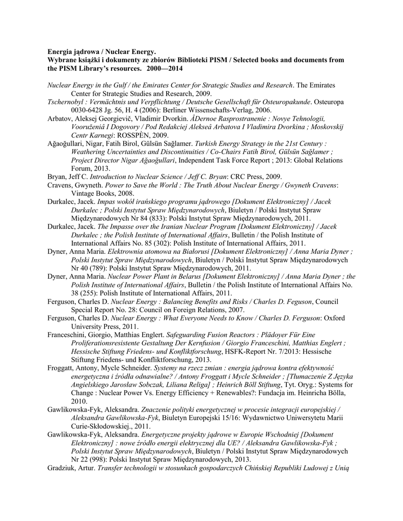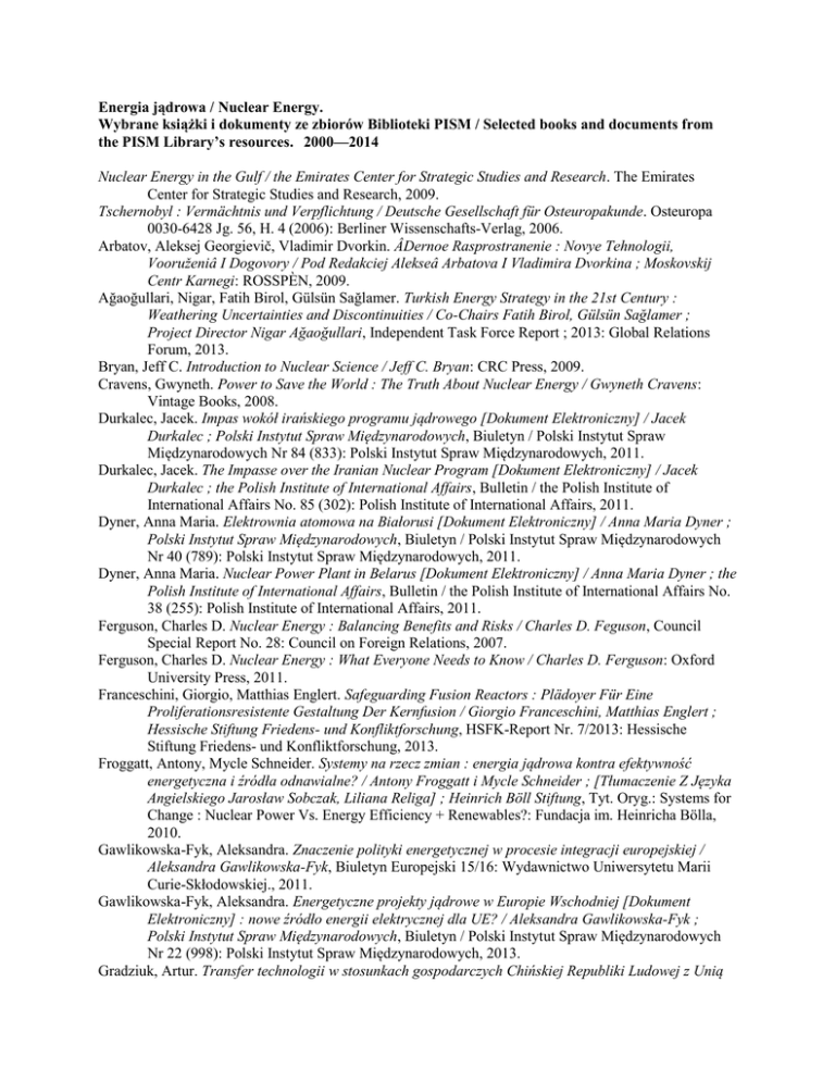 Energia jądrowa / Nuclear Energy. Wybrane książki i dokumenty ze zbiorów Biblioteki PISM / Selected books and documents from the PISM Library’s resources. 2000—2014 Nuclear Energy in the Gulf / the Emirates Center for Strategic Studies and Research. The Emirates Center for Strategic Studies and Research, 2009. Tschernobyl : Vermächtnis und Verpflichtung / Deutsche Gesellschaft für Osteuropakunde. Osteuropa 0030-6428 Jg. 56, H. 4 (2006): Berliner Wissenschafts-Verlag, 2006. Arbatov, Aleksej Georgievič, Vladimir Dvorkin. ÂDernoe Rasprostranenie : Novye Tehnologii, Vooruženiâ I Dogovory / Pod Redakciej Alekseâ Arbatova I Vladimira Dvorkina ; Moskovskij Centr Karnegi: ROSSPÈN, 2009. Ağaoğullari, Nigar, Fatih Birol, Gülsün Sağlamer. Turkish Energy Strategy in the 21st Century : Weathering Uncertainties and Discontinuities / Co-Chairs Fatih Birol, Gülsün Sağlamer ; Project Director Nigar Ağaoğullari, Independent Task Force Report ; 2013: Global Relations Forum, 2013. Bryan, Jeff C. Introduction to Nuclear Science / Jeff C. Bryan: CRC Press, 2009. Cravens, Gwyneth. Power to Save the World : The Truth About Nuclear Energy / Gwyneth Cravens: Vintage Books, 2008. Durkalec, Jacek. Impas wokół irańskiego programu jądrowego [Dokument Elektroniczny] / Jacek Durkalec ; Polski Instytut Spraw Międzynarodowych, Biuletyn / Polski Instytut Spraw Międzynarodowych Nr 84 (833): Polski Instytut Spraw Międzynarodowych, 2011. Durkalec, Jacek. The Impasse over the Iranian Nuclear Program [Dokument Elektroniczny] / Jacek Durkalec ; the Polish Institute of International Affairs, Bulletin / the Polish Institute of International Affairs No. 85 (302): Polish Institute of International Affairs, 2011. Dyner, Anna Maria. Elektrownia atomowa na Białorusi [Dokument Elektroniczny] / Anna Maria Dyner ; Polski Instytut Spraw Międzynarodowych, Biuletyn / Polski Instytut Spraw Międzynarodowych Nr 40 (789): Polski Instytut Spraw Międzynarodowych, 2011. Dyner, Anna Maria. Nuclear Power Plant in Belarus [Dokument Elektroniczny] / Anna Maria Dyner ; the Polish Institute of International Affairs, Bulletin / the Polish Institute of International Affairs No. 38 (255): Polish Institute of International Affairs, 2011. Ferguson, Charles D. Nuclear Energy : Balancing Benefits and Risks / Charles D. Feguson, Council Special Report No. 28: Council on Foreign Relations, 2007. Ferguson, Charles D. Nuclear Energy : What Everyone Needs to Know / Charles D. Ferguson: Oxford University Press, 2011. Franceschini, Giorgio, Matthias Englert. Safeguarding Fusion Reactors : Plädoyer Für Eine Proliferationsresistente Gestaltung Der Kernfusion / Giorgio Franceschini, Matthias Englert ; Hessische Stiftung Friedens- und Konfliktforschung, HSFK-Report Nr. 7/2013: Hessische Stiftung Friedens- und Konfliktforschung, 2013. Froggatt, Antony, Mycle Schneider. Systemy na rzecz zmian : energia jądrowa kontra efektywność energetyczna i źródła odnawialne? / Antony Froggatt i Mycle Schneider ; [Tłumaczenie Z Języka Angielskiego Jarosław Sobczak, Liliana Religa] ; Heinrich Böll Stiftung, Tyt. Oryg.: Systems for Change : Nuclear Power Vs. Energy Efficiency + Renewables?: Fundacja im. Heinricha Bölla, 2010. Gawlikowska-Fyk, Aleksandra. Znaczenie polityki energetycznej w procesie integracji europejskiej / Aleksandra Gawlikowska-Fyk, Biuletyn Europejski 15/16: Wydawnictwo Uniwersytetu Marii Curie-Skłodowskiej., 2011. Gawlikowska-Fyk, Aleksandra. Energetyczne projekty jądrowe w Europie Wschodniej [Dokument Elektroniczny] : nowe źródło energii elektrycznej dla UE? / Aleksandra Gawlikowska-Fyk ; Polski Instytut Spraw Międzynarodowych, Biuletyn / Polski Instytut Spraw Międzynarodowych Nr 22 (998): Polski Instytut Spraw Międzynarodowych, 2013. Gradziuk, Artur. Transfer technologii w stosunkach gospodarczych Chińskiej Republiki Ludowej z Unią Europejską = Technology Transfer in the Economic Relations between the People's Republic of China and the European Union / Artur Gradziuk ; Polski Instytut Spraw Międzynarodowych. Polski Instytut Spraw Międzynarodowych, 2009. Gradziuk, Artur, Ernest Wyciszkiewicz. Energy Security and Climate Change : Double Challenge for Policymakers / Edited by Artur Gradziuk and Ernest Wyciszkiewicz ; the Polish Institute of International Affairs: Polski Instytut Spraw Międzynarodowych, 2009. Granvaud, Raphaël, Odile Tobner. Areva en Afrique : une face cachée du nucléaire français / Raphaёl Granvaud ; Préface D'Odile Tobner, Dossiers Noirs 24: Agone, 2012. Gresh, Alain, Harry Forster. Planet in Peril : An Atlas of Current Threats to People and the Environment / Editorial Management Alain Gresh [Et Al.] ; English Translation Harry Forster: UNEP/GRID-Arendal ; Le Monde diplomatique, 2006. Gupta, Arvind. India in a Changing Global Nuclear Order / Editor Arvind Gupta: Academic Foundation, 2009. Hore-Lacy, Ian. Nuclear Energy in the 21st Century / Ian Hore-Lacy ; the World Nuclear University Primer: World Nuclear University Press, 2012. Irvine, John Maxwell. Nuclear Power : A Very Short Introduction / Maxwell Irvine, Very Short Introductions ; 268: Oxford University Press, 2011. Joyner, Daniel. Interpreting the Nuclear Non-Proliferation Treaty / Daniel H. Joyner: Oxford University Press, 2011. Kulesa, Łukasz. Light at the End of the Tunnel [Dokument Elektroniczny] : Prospects for Reaching a Comprehensive Deal on the Iranian Nuclear Programme / Łukasz Kulesa ; the Polish Institute of International Affairs, Bulletin / the Polish Institute of International Affairs No. 7 (602): Polish Institute of International Affairs, 2014. Kulesa, Łukasz. Światełko w tunelu [Dokument Elektroniczny] : szanse na całościowe porozumienie w sprawie irańskiego programu nuklearnego / Łukasz Kulesa ; Polski Instytut Spraw Międzynarodowych, Biuletyn / Polski Instytut Spraw Międzynarodowych Nr 7 (1119): Polski Instytut Spraw Międzynarodowych, 2014. Mukherjee, Pranab, Atish Sinha, Madhup Mohta. Indian Forei