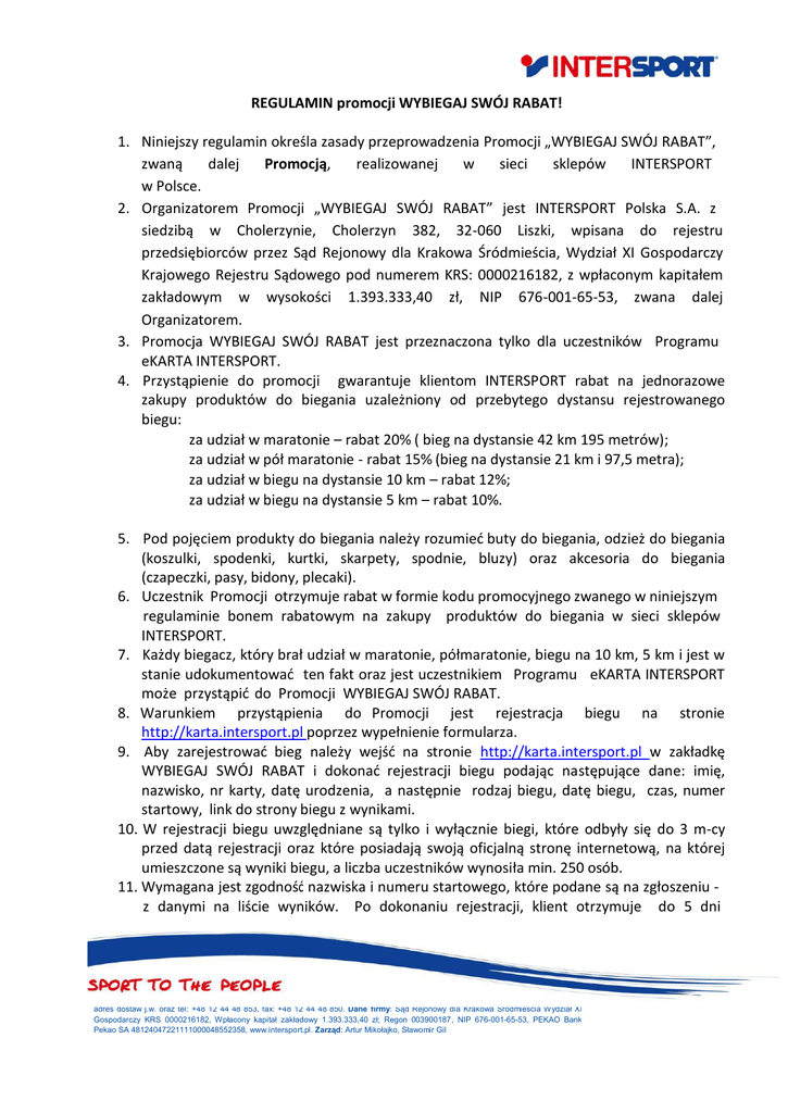 REGULAMIN promocji WYBIEGAJ SWÓJ RABAT! 1. Niniejszy regulamin określa zasady przeprowadzenia Promocji „WYBIEGAJ SWÓJ RABAT”, zwaną dalej Promocją, realizowanej w sieci sklepów INTERSPORT w Polsce. 2. Organizatorem Promocji „WYBIEGAJ SWÓJ RABAT” jest INTERSPORT Polska S.A. z siedzibą w Cholerzynie, Cholerzyn 382, 32-060 Liszki, wpisana do rejestru przedsiębiorców przez Sąd Rejonowy dla Krakowa Śródmieścia, Wydział XI Gospodarczy Krajowego Rejestru Sądowego pod numerem KRS: 0000216182, z wpłaconym kapitałem zakładowym w wysokości 1.393.333,40 zł, NIP 676-001-65-53, zwana dalej Organizatorem. 3. Promocja WYBIEGAJ SWÓJ RABAT jest przeznaczona tylko dla uczestników Programu eKARTA INTERSPORT. 4. Przystąpienie do promocji gwarantuje klientom INTERSPORT rabat na jednorazowe zakupy produktów do biegania uzależniony od przebytego dystansu rejestrowanego biegu: za udział w maratonie – rabat 20% ( bieg na dystansie 42 km 195 metrów); za udział w pół maratonie - rabat 15% (bieg na dystansie 21 km i 97,5 metra); za udział w biegu na dystansie 10 km – rabat 12%; za udział w biegu na dystansie 5 km – rabat 10%. 5. Pod pojęciem produkty do biegania należy rozumieć buty do biegania, odzież do biegania (koszulki, spodenki, kurtki, skarpety, spodnie, bluzy) oraz akcesoria do biegania (czapeczki, pasy, bidony, plecaki). 6. Uczestnik Promocji otrzymuje rabat w formie kodu promocyjnego zwanego w niniejszym regulaminie bonem rabatowym na zakupy produktów do biegania w sieci sklepów INTERSPORT. 7. Każdy biegacz, który brał udział w maratonie, półmaratonie, biegu na 10 km, 5 km i jest w stanie udokumentować ten fakt oraz jest uczestnikiem Programu eKARTA INTERSPORT może przystąpić do Promocji WYBIEGAJ SWÓJ RABAT. 8. Warunkiem przystąpienia do Promocji jest rejestracja biegu na stronie http://karta.intersport.pl poprzez wypełnienie formularza. 9. Aby zarejestrować bieg należy wejść na stronie http://karta.intersport.pl w zakładkę WYBIEGAJ SWÓJ RABAT i dokonać rejestracji biegu podając następujące dane: imię, nazwisko, nr karty, datę urodzenia, a następnie rodzaj biegu, datę biegu, czas, numer startowy, link do strony biegu z wynikami. 10. W rejestracji biegu uwzględniane są tylko i wyłącznie biegi, które odbyły się do 3 m-cy przed datą rejestracji oraz które posiadają swoją oficjalną stronę internetową, na której umieszczone są wyniki biegu, a liczba uczestników wynosiła min. 250 osób. 11. Wymagana jest zgodność nazwiska i numeru startowego, które podane są na zgłoszeniu z danymi na liście wyników. Po dokonaniu rejestracji, klient otrzymuje do 5 dni Siedziba: INTERSPORT Polska S.A. Cholerzyn 382, 32-060 LISZKI, tel: +48 12 44 48 100, 44 48 103, fax: +48 12 44 48 000, Magazyn: adres dostaw j.w. oraz tel: +48 12 44 48 853, fax: +48 12 44 48 850. Dane firmy: Sąd Rejonowy dla Krakowa Śródmieścia Wydział XI Gospodarczy KRS 0000216182, Wpłacony kapitał zakładowy 1.393.333,40 zł; Regon 003900187, NIP 676-001-65-53, PEKAO Bank Pekao SA 48124047221111000048552358, www.intersport.pl. Zarząd: Artur Mikołajko, Sławomir Gil roboczych od daty rejestracji potwierdzenie rejestracji drogą mailową i SMS wraz z informacją o przyznanym rabacie określonym w pkt. 4 niniejszego regulaminu. W przypadku gdy weryfikacja zgłoszenia przebiegnie negatywnie wówczas klient otrzyma na podany adres e-mail informację, dlaczego rejestracja jego biegu jest niemożliwa. INTERSPORT zastrzega sobie prawo do wydłużenia terminu weryfikacji w przypadku dużej ilości zgłoszeń. 12. W formularzu rejestracyjnym biegu wymagane jest podanie aktualnego numeru telefonu komórkowego oraz adresu e-mail. 13. Jeden klient (na którego jest zarejestrowana karta w programie eKARTA INTERSPORT) może zgłosić max. 4 osoby do jednego biegu: siebie i/lub trzech członków rodziny. Nazwisko osoby posiadającej kartę oraz zgłoszonych osób musi być tożsame. 14. Bon rabatowy WYBIEGAJ SWÓJ RABAT może być zrealizowany tylko i wyłącznie na zakup produktów do biegania określonych w pkt. 5 niniejszego regulaminu. 15. Bon rabatowy może być realizowany na produkty objęte przeceną. 16. Bon rabatowy jest ważny 3 miesiące od momentu jego wygenerowania. Jeżeli uczestnik Promocji nie zrealizuje bonu w terminie jego ważności, bon jest anulowany. 17. Na 3 dni przed upływem terminu ważności bonu, klient może otrzymywać SMS-em przypomnienie o bonie do zrealizowania, pod warunkiem podania w formularzu poprawnego numeru telefonu komórkowego. 18. Klient może sprawdzić po zalogowaniu się na swoim koncie jakie bony rabatowe posiada do realizacji, jakie biegi są zarejestrowane na jego koncie i jaki jest ich status (do akceptacji, odrzucony, zaakceptowany). 19. Bon rabatowy może być wykorzystany na jednorazowy zakup (jeden paragon) produktów do biegania. Klient może zakupić dowolną ilość produktów do biegania na jeden paragon z użyciem bonu rabatowego. 20. Warunkiem otrzymania nowego bonu rabatowego jest zarejestrowanie kolejnego udziału w imprezie biegowej (wielkość rabatu i rodzaj biegu określone w pkt 4). Klient może przystąpić do promocji WYBIEGAJ SWÓJ RABAT dowolną ilość razy pod warunkiem rejestracji za każdym razem innego biegu. 21. Płatność za zakup produktów do biegania uwzględniający bon rabatowy może być realizowana poprzez bony systemu lojalnościowego. 22. Od zakupów z użyciem bonu rabatowego WYBIEGAJ SWÓJ RABAT naliczane są bony zgodnie z regulaminem eKARTA INTERSPORT. 23. Klient, który będzie miał największą ilość zaakceptowanych biegów na swoją kartę do dnia 31.12.2014, otrzyma dodatkowo kartę podarunkową INTERSPORT o wartości 700zł na zakup dowolnych produktów w sieci sklepów INTERSPORT POLSKA SA 24. Zwycięzca promocji o którym mowa w pkt. 23 niniejszego regulaminu zostanie wyłoniony w dniu 7.01.2015 25. Zwycięzca zostanie powiadomiony o przyznanej karcie e-mailem bą