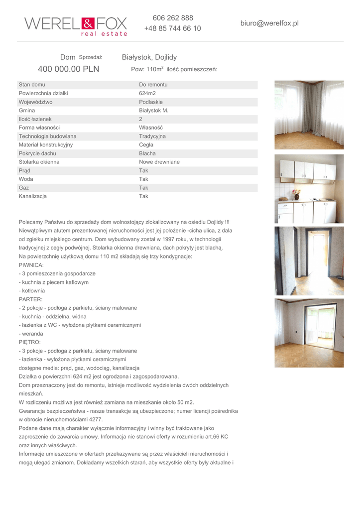606 262 888 +48 85 744 66 10 Dom Sprzedaż Białystok, Dojlidy 400 000.00 PLN Pow: 110m2 ilość pomieszczeń: Stan domu Do remontu Powierzchnia działki 624m2 Województwo Podlaskie Gmina Białystok M. Ilość łazienek 2 Forma własności Własność Technologia budowlana Tradycyjna Materiał konstrukcyjny Cegła Pokrycie dachu Blacha Stolarka okienna Nowe drewniane Prąd Tak Woda Tak Gaz Tak Kanalizacja Tak Polecamy Państwu do sprzedaży dom wolnostojący zlokalizowany na osiedlu Dojlidy !!! Niewątpliwym atutem prezentowanej nieruchomości jest jej położenie -cicha ulica, z dala od zgiełku miejskiego centrum. Dom wybudowany został w 1997 roku, w technologii tradycyjnej z cegły podwójnej. Stolarka okienna drewniana, dach pokryty jest blachą. Na powierzchnię użytkową domu 110 m2 składają się trzy kondygnacje: PIWNICA: - 3 pomieszczenia gospodarcze - kuchnia z piecem kaflowym - kotłownia PARTER: - 2 pokoje - podłoga z parkietu, ściany malowane - kuchnia - oddzielna, widna - łazienka z WC - wyłożona płytkami ceramicznymi - weranda PIĘTRO: - 3 pokoje - podłoga z parkietu, ściany malowane - łazienka - wyłożona płytkami ceramicznymi dostępne media: prąd, gaz, wodociąg, kanalizacja Działka o powierzchni 624 m2 jest ogrodzona i zagospodarowana. Dom przeznaczony jest do remontu, istnieje możliwość wydzielenia dwóch oddzielnych mieszkań. W rozliczeniu możliwa jest również zamiana na mieszkanie około 50 m2. Gwarancja bezpieczeństwa - nasze transakcje są ubezpieczone; numer licencji pośrednika w obrocie nieruchomościami 4277. Podane dane mają charakter wyłącznie informacyjny i winny być traktowane jako zaproszenie do zawarcia umowy. Informacja nie stanowi oferty w rozumieniu art.66 KC oraz innych właściwych. Informacje umieszczone w ofertach przekazywane są przez właścicieli nieruchomości i mogą ulegać zmianom. Dokładamy wszelkich starań, aby wszystkie oferty były aktualne i [email protected] odpowiadały stanowi rzeczywistemu. data wydruku: 2017-03-02 02:11:21