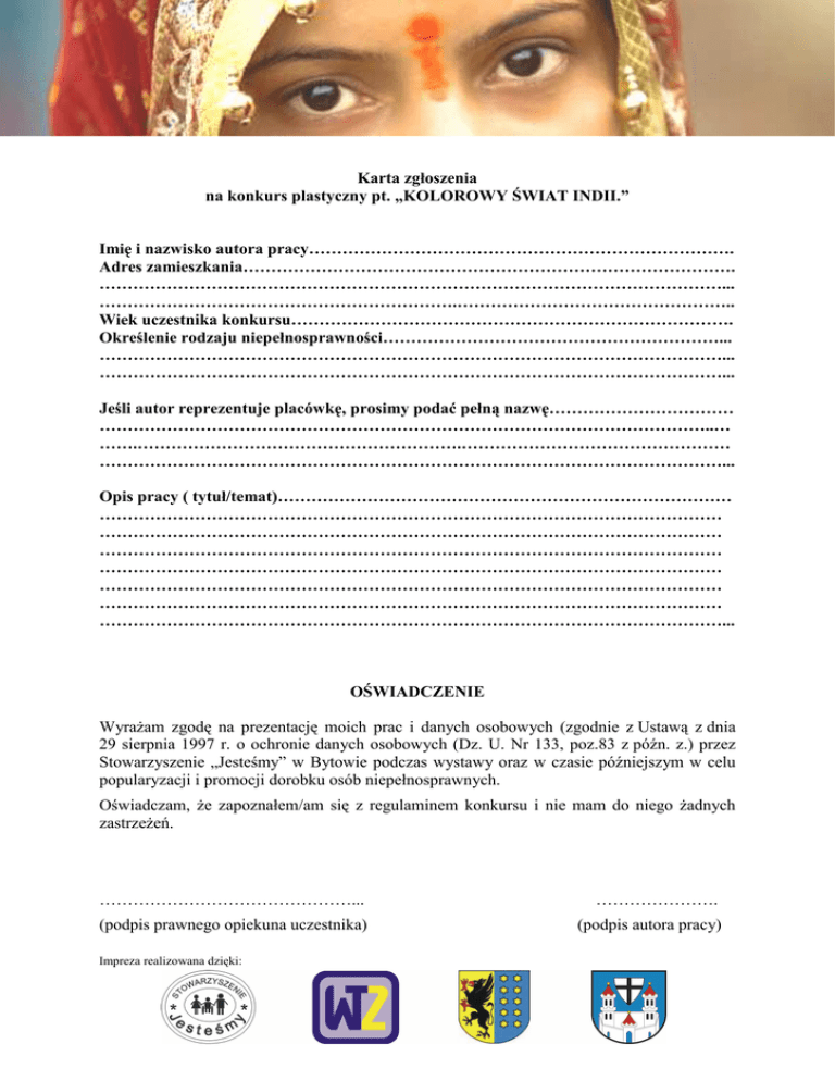 Karta zgłoszenia na konkurs plastyczny pt. „KOLOROWY ŚWIAT INDII.” Imię i nazwisko autora pracy…………………………………………………………………. Adres zamieszkania……………………………………………………………………………. …………………………………………………………………………………………………... ……………………………………………………….………………………………………….. Wiek uczestnika konkursu……………………………………………………………………. Określenie rodzaju niepełnosprawności……………………………………………………... …………………………………………………………………………………………………... …………………………………………………………………………………………………... Jeśli autor reprezentuje placówkę, prosimy podać pełną nazwę…………………………… ………………………………………………………………………………………………..… …….………………………………………………….………………………………………… …………………………………………………………………………………………………... Opis pracy ( tytuł/temat)……………………………………………………………………… ………………………………………………………………………………………………… ………………………………………………………………………………………………… ………………………………………………………………………………………………… ………………………………………………………………………………………………… ………………………………………………………………………………………………… ………………………………………………………………………………………………… …………………………………………………………………………………………………... OŚWIADCZENIE Wyrażam zgodę na prezentację moich prac i danych osobowych (zgodnie z Ustawą z dnia 29 sierpnia 1997 r. o ochronie danych osobowych (Dz. U. Nr 133, poz.83 z późn. z.) przez Stowarzyszenie „Jesteśmy” w Bytowie podczas wystawy oraz w czasie późniejszym w celu popularyzacji i promocji dorobku osób niepełnosprawnych. Oświadczam, że zapoznałem/am się z regulaminem konkursu i nie mam do niego żadnych zastrzeżeń. ………………………………………... …………………. (podpis prawnego opiekuna uczestnika) (podpis autora pracy) Impreza realizowana dzięki: Regulamin konkursu plastycznego „KOLOROWY ŚWIAT INDII” I. Organizator: 1. Organizatorem konkursu jest Stowarzyszenie „Jesteśmy” i Warsztat Terapii Zajęciowej w Bytowie przy ul. Szarych Szeregów 13. II. Cel konkursu: 1. Odnalezienie i dotarcie do osób niepełnosprawnych, utalentowanych nigdzie nie zrzeszonych oraz podopiecznych placówek i organizacji działających na rzecz osób niepełnosprawnych. 2. Propagowanie terapii poprzez sztukę. 3. Pokazywanie aspektów, autoekspresji, czyli wyrażania wnętrza twórcy, jego myśli, snów i wyobraźni, określenie siebie i swoich emocji. 4. Promowanie dorobku artystycznego osób niepełnosprawnych. 5. Dowartościowanie osób niepełnosprawnych. III Zasady konkursu: 1. Uczestnikami konkursu mogą być wyłącznie osoby niepełnosprawne, zarówno dzieci jak i osoby dorosłe. 2. Technika i format prac jest dowolny. 3. Prace w miarę możliwości przygotować do ekspozycji (nie oprawiać w antyramy). 4. Treść pracy powinna być związana z tematem konkursu. 5. Prace muszą być wykonywane samodzielnie. 6. Placówki mogą zgłosić dowolną ilość prac swoich podopiecznych. 7. Każda praca musi zawierać na odwrocie pracy przytwierdzony na stałe załącznik nr.1 8. Do każdej pracy należy dołączyć kartę zgłoszenia. IV. Termin nadsyłania prac: 1. Prace należy dostarczyć osobiście lub nadesłać do dnia 20 maja 2013r. na adres: Stowarzyszenie „Jesteśmy” 77-100 Bytów, ul. Szarych Szeregów 13. V. Komisja konkursowa 1. Organizator powoła Komisję Konkursową – jury, która wytypuje najciekawsze prace i zwycięzców konkursu. VI. Podsumowanie konkursu, otwarcie wystawy i wręczenie nagród: 1. Wyniki konkursu zostaną ogłoszone dnia 28 maja 2013r. w trakcie zorganizowanej imprezy integracyjnej z okazji „Dnia Godności Osoby Niepełnosprawnej”. 2. Po rozstrzygnięciu konkursu prace stają się własnością Organizatora. 3. Autorzy wyróżnionych prac otrzymają nagrody w trakcie trwania imprezy. Impreza realizowana dzięki: Załącznik nr 1: Tytuł pracy: Imię i nazwisko: Adres do korespondencji: Załącznik nr 1: Tytuł pracy: Imię i nazwisko: Adres do korespondencji: Załącznik nr 1: Tytuł pracy: Imię i nazwisko: Adres do korespondencji: Załącznik nr 1: Tytuł pracy: Imię i nazwisko: Adres do korespondencji: