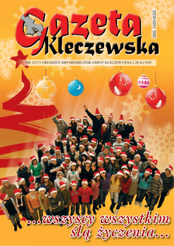 15*58'=,(ē0,(6,ĉ&=1,.*0,1<./(&=(:&(1$]á]9$7 ...wszyscy wszystkim ślą życzenia... Na nadchodzące Święta Bożego Narodzenia: – nowych pokładów nadziei – nowej wrażliwości – nowego dialogu… To jest najprawdziwszy świąteczny czas, kiedy w naszych sercach rodzi się na nowo cząstka Bożego planu! Z serdecznymi życzeniami: Burmistrz Marek Wesołowski Przewodniczący RM Maciej Trzewiczyński oraz Redakcja „Gazety Kleczewskiej” Świąteczni goście „Gazety Kleczewskiej” Rozmowa z przedszkolakami i uczniami zerówki z Zespołu Szkolno-Przedszkolnego w Kleczewie. Lubicie Święta Bożego Narodzenia? Tak! To nasze ulubione święta. Dlaczego? Bo są kochane i milutkie. Bo tata i mama są w domu i przyjeżdża ciocia. A do mnie kuzyn, co robi wszystko co chcę! Bo jest mniejszy! A ja dostaję dużo prezentów! Lubię święta, bo jest śnieg i oglądam bajki. Dlaczego obchodzimy te Święta? To są urodziny Pana Jezusa. Kim był Pan Jezus? Dobrym człowiekiem. Chodzicie na Pasterkę do kościoła? Czy wiecie co to jest Pasterka? Nie chodzę, ale moja mama tak. Ja chodzę, ale nie wiem, co to jest. Jaką potrawę lubicie najbardziej jeść w Wigilię? Kruche ciasteczka i zupę pomidorową. Zupę pomidorową? Jesteś pewna? Tak. Jest najpyszniejsza! Ja wolę rybę. Taką białą... A ja opłatek! Opłatek to się daje innym i mówi się życzenia. A czego życzycie rodzicom przy wigilijnym stole? Dużo pieniędzy! Zdrowia i pomyślności! Żeby kupili mi w końcu komputer! Jak pomagacie rodzicom w przygotowaniach do świąt? Zapalam lampki na choince. LISTOPAD 2009 A ja pomagam mamie piec ciasteczka. Ja się ubieram. Tak pięknie. Wiecie kto przynosi prezenty? Święty Mikołaj! Kim jest św. Mikołaj? To jest taki święty dziadunio. Jak wygląda? Ma brodę, czerwoną czapkę i dłuuuugi płaszcz. I duże zawijane buty, a na czapce biały pimponik. Co chcielibyście dostać od Mikołaja? Notes na hasło, żeby nikt nie przeczytał moich tajemnic. To już umiesz pisać? Nie. To jak opiszesz swoje sekrety? No teraz, to już nie wiem... Możesz narysować! Tak będę rysować! Ja bym chciała lalkę, jak największą. I żeby miała długie włosy i sukienkę w kratkę. Ja chcę misia, który tańczy i śpiewa. Wiecie, co Mikołaj przynosi niegrzecznym dzieciom i jak to wygląda? Rózgę. To jest taki patyk. Kto dostał z was rózgę? Ja! Tata pobił mnie nią po łapach. Czym przyjeżdża do was Mikołaj? Sankami, ciągną je renifery. Jest ich dużo i mają światełka na rogach, żeby nie zabłądziły. Ja widziałem jak Mikołaj jechał na reniferach i wjechał do bloku obok. Ja też go widziałam i to wiele razy. Pomachał mi z nieba. A renifery mają takie czerwone nosy. I Mikołaj też, ale większy. c.d. na str. 4 NA ŚWIECIE: Dotychczasowy prezydent Hamid Karzaj ogłoszony został zwycięzcą wyborów prezydenckich w Afganistanie • W 101 roku życia zmarł słynny myśliciel francuski Claude Lévi-Strauss • Rządy Szwecji i Finlandii zgodziły się na budowę po dnie Bałtyku gazociągu z Rosji do Niemiec • W Berlinie uroczyście obchodzono 20. rocznicę upadku muru berlińskiego • Prezydent Rosji Dmitrij Miedwiediew mianował prorosyjskiego prezydenta Czeczenii Ramzana Kadyrowa generałem-majorem milicji • szef agencji ONZ ds. żywności (FAO) Jacques Diout głodował przez 24 godziny, by zwrócić uwagę na miliony ludzi cierpiących głód • Prezydent USA Barack Obama przebywał z wizytą w Chinach • Na szczycie w Brukseli przywódcy Unii Europejskiej zdecydowali, że pierwszym przewodniczącym Rady Europejskiej (prezydentem Unii) będzie dotychczasowy premier Belgii HermanVan Rompuy, a szefem unijnej dyplomacji - była komisarz ds. handlu Catherine Ashton z Wielkiej Brytanii • Szwajcarski sąd zgodził się na wypuszczenie z aresztu znanego reżysera Romana Polańskiego za kaucją w wysokości 3 mln euro • Miliony muzułmanów z całego świata pielgrzymowało do Mekki w Arabii Saudyjskiej, by wypełnić jeden z najważniejszych obowiązków islamu • Janusz Lewandowski, europoseł z Platformy Obywatelskiej, został komisarzem ds. budżetu Unii Europejskiej • W Rosji doszło do zamachu na luksusowy pociąg „Newski Ekspres” jadący z Moskwy do Sankt Petersburga; zginęło około 30 osób • W Monachium rozpoczął się proces sądowy pochodzącego z Ukrainy 89-letniego Johna Demianiuka, który w czasie II wojny światowej był strażnikiem w obozach między innymi w Sobiborze, Treblince i na Majdanku i jest oskarżony o pomoc przy zamordowaniu prawie 30 tysięcy więźniów; W KRAJU: Ministerstwo Zdrowia wstrzymało się z zakupem szczepionki przeciwko grypie A/H1N1 • Fundacja na Rzecz Nauki Polskiej przyznała tzw. „Polskie Noble”, które otrzymali profesorowie: Jerzy Strzelczyk, Józef Barnaś, Bogdan Marciniec - wszyscy z Uniwersytetu im. Adama Mickiewicza w Poznaniu i Andrzej Koliński z Uniwersytetu Warszawskiego • Sejm powołał komisję do zbadania tzw. „afery hazardowej” • Nagrodę w konkursie na „najlepszą książkę naukową opisującą losy Polski i Polaków w XX w.”, organizowanym przez IPN, TVP i Polskie Radio, otrzymała Agata Mirek za pracę „Siostry zakonne w obozach pracy PRL w latach 1954-56” • Polska podpisała z Hiszpanią umowę o sprzedaży uprawnień do emisji dwutlenku węgla • Uroczyście obc.d. na str. 4 c.d. ze str. 3 c.d. ze str. 3 chodzono Święto Niepodległości • Mieszkańcy Częstochowy odwołali w referendum prezydenta miasta Tadeusza Wronę • Krakowski sąd umorzył postępowanie wobec emerytowanej lekarki Ilony Rosiek-Konieczny, która w latach 1998-1999 wypisywała bezdomnym bezpłatne recepty • Premier Donald Tusk przedstawił propozycje zmian w konstytucji, dotyczące między innymi odpowiedzialności rządu i wyboru prezydenta • Po bezbłędnym napisaniu dyktanda w Katowicach Jan Chwalewski z Pabianic zdobył tytuł Mistrza Polskiej Ortografii 2009 • Do dym