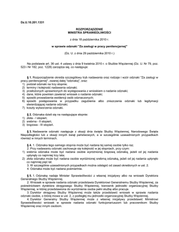 Dz.U.10.201.1331 ROZPORZĄDZENIE MINISTRA SPRAWIEDLIWOŚCI z dnia 18 października 2010 r. w sprawie odznaki "Za zasługi w pracy penitencjarnej" (Dz. U. z dnia 29 października 2010 r.) Na podstawie art. 36 ust. 4 ustawy z dnia 9 kwietnia 2010 r. o Służbie Więziennej (Dz. U. Nr 79, poz. 523 i Nr 182, poz. 1228) zarządza się, co następuje: § 1. Rozporządzenie określa szczegółowy tryb nadawania oraz rodzaje i wzór odznaki "Za zasługi w pracy penitencjarnej", zwanej dalej "odznaką", oraz: 1) podział odznaki na trzy stopnie; 2) terminy i kolejność nadawania odznaki; 3) przełożonych uprawnionych do występowania z wnioskiem o nadanie odznaki; 4) dane, które powinien zawierać wniosek o nadanie odznaki; 5) sposób prowadzenia ewidencji osób odznaczonych; 6) sposób postępowania w przypadku zagubienia albo zniszczenia odznaki lub legitymacji stwierdzającej nadanie odznaki; 7) koszty wytworzenia odznaki. § 2. Odznaka dzieli się na następujące stopnie: 1) złota - I stopień; 2) srebrna - II stopień; 3) brązowa - III stopień. § 3. Nadawanie odznaki następuje z okazji dnia święta Służby Więziennej, Narodowego Święta Niepodległości lub z okazji innych świąt państwowych, a w szczególnie uzasadnionych przypadkach również w innych terminach. § 4. 1. Odznaka tego samego stopnia może być nadana tej samej osobie tylko raz. 2. Przy nadawaniu odznaki zachowuje się kolejność w jej stopniach, przy czym: 1) srebrna odznaka może być nadana osobie wyróżnionej brązową odznaką, jeżeli od jej nadania upłynęły co najmniej trzy lata; 2) złota odznaka może być nadana osobie wyróżnionej srebrną odznaką, jeżeli od jej nadania upłynęło co najmniej pięć lat. 3. W szczególnie uzasadnionych przypadkach można odstąpić od zasad określonych w ust. 2. 4. Odznaka może być nadana pośmiertnie. § 5. 1. Odznakę nadaje Minister Sprawiedliwości z własnej inicjatywy albo na wniosek Dyrektora Generalnego Służby Więziennej. 2. Wniosek w sprawie nadania odznaki przedstawia Dyrektorowi Generalnemu Służby Więziennej, za pośrednictwem dyrektora okręgowego Służby Więziennej, kierownik jednostki organizacyjnej Służby Więziennej, w której przedstawiona do wyróżnienia osoba pełni służbę albo pracuje. 3. Dyrektor okręgowy Służby Więziennej może także przedstawić wniosek w sprawie nadania odznaki osobie, o której mowa w ust. 2, z podległej mu jednostki organizacyjnej Służby Więziennej. 4. Dyrektor Generalny Służby Więziennej może z własnej inicjatywy przedstawić Ministrowi Sprawiedliwości wniosek w sprawie nadania odznaki funkcjonariuszom lub pracownikom Służby Więziennej oraz innym osobom. § 6. Wniosek o nadanie odznaki powinien w szczególności zawierać: 1) dane personalne osoby przedstawianej do wyróżnienia; 2) informacje o osiągnięciach uzasadniających nadanie odznaki, o których mowa w art. 36 ust. 2 ustawy z dnia 9 kwietnia 2010 r. o Służbie Więziennej; 3) opinię uprawnionego przełożonego, o którym mowa w § 5 ust. 2-4. § 7. 1. Odznaka ma kształt okrągłego medalu o średnicy 35 mm wykonanego w tombaku, odpowiednio patynowanego, posrebrzanego i pozłacanego. Na licowej stronie, w otoku, znajduje się napis dwoma łukami: "MINISTER SPRAWIEDLIWOŚCI ZASŁUŻONEMU", a pośrodku, na tle ciemnoczerwonej emalii, wizerunek godła państwowego ustawowego wzoru, w kolorze srebrnym. Na odwrotnej stronie odznaki, w środkowej części, na tle stylizowanej odznaki Służby Więziennej, składającej się z pochodni skrzyżowanej z mieczem na tle wieńca z liści dębowych, umieszczony jest w trzech wierszach napis: "PENITENCJA/PRACA, OŚWIATA/KULTURA". 2. Odznaka jest zawieszona na wstążce o szerokości 35 mm, granatowej, obrzeżonej prążkami szerokości 3 mm, czerwono-białym i biało-czerwonym, z dwoma paskami białymi szerokości 4 mm w równych odstępach 7 mm. 3. Wzór odznaki wraz ze wstążką określa załącznik do rozporządzenia. § 8. 1. Odznakę wraz z legitymacją stwierdzającą jej nadanie wręcza Minister Sprawiedliwości lub osoba przez niego upoważniona. 2. Odznakę wraz z legitymacją wręcza się w sposób i w okolicznościach zapewniających uroczysty charakter aktu wręczenia. 3. Na legitymacji w sprawie nadania odznaki powinny być zamieszczone: godło Rzeczypospolitej Polskiej, numer i data wystawienia legitymacji, podstawa nadania odznaki, imię i nazwisko osoby wyróżnionej odznaką, imię jej ojca i stopień przyznanej odznaki oraz podpis i pieczęć organu przyznającego odznakę. § 9. Ewidencję osób odznaczonych prowadzi Centralny Zarząd Służby Więziennej. § 10. 1. W razie zgubienia albo zniszczenia odznaki wydaje się, na wniosek osoby odznaczonej, odznakę tego samego stopnia. Ponowne wydanie odznaki następuje za zwrotem kosztów jej wytworzenia. 2. W razie zgubienia albo zniszczenia legitymacji stwierdzającej nadanie odznaki przepis ust. 1 stosuje się odpowiednio, z tym że ponowne wydanie legitymacji następuje nieodpłatnie. § 11. 1. Osobom, którym nadano brązową lub srebrną odznakę "W Służbie Penitencjarnej" lub odznakę "Za zasługi w pracy penitencjarnej" na podstawie dotychczas obowiązujących przepisów, może być nadana odpowiednio odznaka II lub I stopnia - z uwzględnieniem terminów przewidzianych w § 4 ust. 2. 2. Osoby, którym nadano odznakę, o której mowa w ust. 1, zachowują prawo do jej noszenia. § 12. Rozporządzenie wchodzi w życie po upływie 14 dni od dnia ogłoszenia. 1) ______ 1) Rozporządzenie było poprzedzone rozporządzeniem Ministra Sprawiedliwości z dnia 25 marca 2003 r. w sprawie szczegółowego trybu nadawania oraz wzoru odznaki "Za zasługi w pracy penitencjarnej" (Dz. U. Nr 95, poz. 871), które traci moc z dniem wejścia w życie niniejszego rozporządzenia na podstawie art. 272 ustawy z dnia 9 kwietnia 2010 r. o Służbie Więziennej (Dz. U. Nr 79, poz. 523 i Nr 182, poz. 1228). ZAŁĄCZNIK WZÓR ODZNAKI 