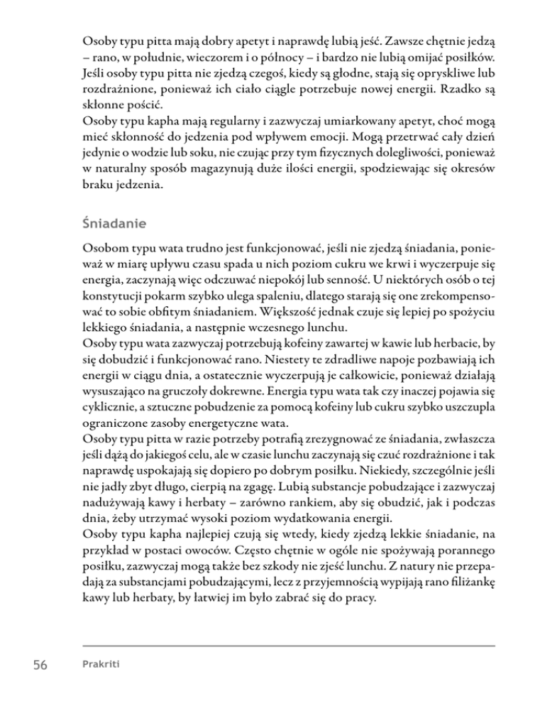 Osoby typu pitta mają dobry apetyt i naprawdę lubią jeść. Zawsze chętnie jedzą – rano, w południe, wieczorem i o północy – i bardzo nie lubią omijać posiłków. Jeśli osoby typu pitta nie zjedzą czegoś, kiedy są głodne, stają się opryskliwe lub rozdrażnione, ponieważ ich ciało ciągle potrzebuje nowej energii. Rzadko są skłonne pościć. Osoby typu kapha mają regularny i zazwyczaj umiarkowany apetyt, choć mogą mieć skłonność do jedzenia pod wpływem emocji. Mogą przetrwać cały dzień jedynie o wodzie lub soku, nie czując przy tym fizycznych dolegliwości, ponieważ w naturalny sposób magazynują duże ilości energii, spodziewając się okresów braku jedzenia. Śniadanie Osobom typu wata trudno jest funkcjonować, jeśli nie zjedzą śniadania, ponieważ w miarę upływu czasu spada u nich poziom cukru we krwi i wyczerpuje się energia, zaczynają więc odczuwać niepokój lub senność. U niektórych osób o tej konstytucji pokarm szybko ulega spaleniu, dlatego starają się one zrekompensować to sobie obfitym śniadaniem. Większość jednak czuje się lepiej po spożyciu lekkiego śniadania, a następnie wczesnego lunchu. Osoby typu wata zazwyczaj potrzebują kofeiny zawartej w kawie lub herbacie, by się dobudzić i funkcjonować rano. Niestety te zdradliwe napoje pozbawiają ich energii w ciągu dnia, a ostatecznie wyczerpują je całkowicie, ponieważ działają wysuszająco na gruczoły dokrewne. Energia typu wata tak czy inaczej pojawia się cyklicznie, a sztuczne pobudzenie za pomocą kofeiny lub cukru szybko uszczupla ograniczone zasoby energetyczne wata. Osoby typu pitta w razie potrzeby potrafią zrezygnować ze śniadania, zwłaszcza jeśli dążą do jakiegoś celu, ale w czasie lunchu zaczynają się czuć rozdrażnione i tak naprawdę uspokajają się dopiero po dobrym posiłku. Niekiedy, szczególnie jeśli nie jadły zbyt długo, cierpią na zgagę. Lubią substancje pobudzające i zazwyczaj nadużywają kawy i herbaty – zarówno rankiem, aby się obudzić, jak i podczas dnia, żeby utrzymać wysoki poziom wydatkowania energii. Osoby typu kapha najlepiej czują się wtedy, kiedy zjedzą lekkie śniadanie, na przykład w postaci owoców. Często chętnie w ogóle nie spożywają porannego posiłku, zazwyczaj mogą także bez szkody nie zjeść lunchu. Z natury nie przepadają za substancjami pobudzającymi, lecz z przyjemnością wypijają rano filiżankę kawy lub herbaty, by łatwiej im było zabrać się do pracy. 56 Prakriti Trawienie i wydalanie Każdy, kto nie wypróżnia się regularnie przynajmniej raz dziennie bez trudu lub z użyciem środków przeczyszczających, może uznać, że ma zaparcia. Biegunka to stan, kiedy wydala się luźne stolce trzy razy dziennie lub częściej. W przypadku zdrowych jelit wypróżnienie następuje samoistnie jeden lub dwa razy dziennie. Niektóre osoby o konstytucji wata przez całe życie cierpią na zaparcia, mają też tendencję do wydalania twardych, ciemnych stolców oraz częstych wzdęć i odbijania. U innych osób tego typu wydalanie jest zmienne – po okresach zaparć następują okresy z biegunkami lub luźnymi stolcami. Wiele osób typu wata wie z doświadczenia, że zdrowe nawyki żywieniowe są niezwykle ważne, aby mieć dobre trawienie. Osobom o czystej konstytucji wata w przypadku zaparć często pomagają tylko silne środki przeczyszczające, takie jak senes lub olej rycynowy. Osoby typu pitta rzadko miewają zaparcia, toteż zazwyczaj wypróżniają się regularnie i często. Ich stolec ma zazwyczaj żółtawy odcień i jest dobrze uformowany, choć niekiedy może też być luźny i powodować uczucie gorąca lub pieczenia, zwłaszcza po spożyciu ostrych, pikantnych posiłków. Intensywnie żółty lub pomarańczowy odcień stolca wskazuje na nadmiar pitta w ciele. Na wiele osób tego typu przeczyszczająco działają takie pokarmy jak mleko, figi, rodzynki lub daktyle. Osoby typu kapha wypróżniają się regularnie i zazwyczaj raz dziennie. Niekiedy wypróżnianie się jest powolne. Ich kał jest zazwyczaj dobrze uformowany, lecz rzadko twardy. W przypadku zaparcia skuteczne są dla nich średnio silne środki przeczyszczające. Menstruacja Kobiety typu wata zazwyczaj mają bardzo nieregularne cykle. Niekiedy miesiączka może w ogóle nie wystąpić, szczególnie jeśli dużo ćwiczą lub mają małą wagę. Odstęp pomiędzy miesiączkami często jest dłuższy niż miesiąc. Upływ krwi bywa skąpy, mogą też pojawiać się skrzepy. Oba te objawy są spowodowane suchością wata. Ich krew zazwyczaj ma ciemny kolor. Tuż przed krwawieniem mogą się pojawiać zaparcia i silne skurcze, niekiedy występujące naprzemiennie. Podbrzusze może być napięte i twarde. U kobiet typu wata skurcze są zazwyczaj bardziej intensywne niż u pitta lub kapha, ponieważ są one wywoływane przez wata. W przypadku zaburzeń wata przed miesiączką mogą się pojawić Cechy poszczególnych konstytucji 57 niepokój, zaburzenia snu, napięcie nerwowe, huśtawka nastrojów oraz poczucie dezorientacji. Kobiety typu pitta zazwyczaj mają regularne cykle, lecz krwawią dłużej i obficiej ze względu na wrodzone gorąco. Odstęp między okresami bywa krótszy niż cztery tygodnie. Krew, która może wydawać się „gorąca”, zazwyczaj ma intensywny, jasny kolor, lecz w przypadku zaburzeń pitta może mieć odcień sinawy, żółty lub czarny. Kobiety typu pitta tuż przed miesiączką lub w jej trakcie mogą mieć biegunkę oraz średnio silne skurcze. Przedmiesiączkowe zaburzenia typu pitta mogą wywoływać rozdrażnienie, intensywną chęć na jakiś pokarm, wysypkę lub wypryski skórne oraz ból głowy (zwłaszcza migrenowy). Kobiety typu kapha zwykle miewają bezproblemowe, regularne okresy, ze średnim upływem krwi dość jasnego koloru. Zaburzenia kapha mogą sprawiać, iż we krwi pojawi się śluz. Skurcze są raczej łagodne i tępe niż intensywne. Kobiety typu kap