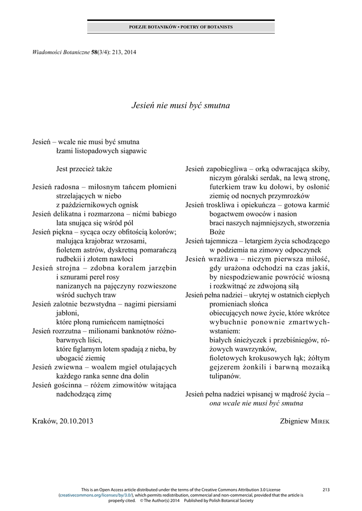 Polish Botanical Society Elektronicznie podpisany przez Polish Botanical Society DN: c=IE, st=Warszawa, o=ditorPolish Bot, ou=Standard Certificate, ou=anical SocietySupport, serialNumber=PT2110520970.1, title=Managing E, sn=Otreba, givenName=org.plPiotr, email=p.otreba@pbsociety., cn=Polish Botanical Society Data: 2015.03.29 18:03:51 +02'00' POEZJE BOTANIKÓW • POETRY OF BOTANISTS Wiadomości Botaniczne 58(3/4): 213, 2014 Jesień nie musi być smutna Jesień – wcale nie musi być smutna łzami listopadowych siąpawic Jest przecież także Jesień radosna – miłosnym tańcem płomieni strzelających w niebo z październikowych ognisk Jesień delikatna i rozmarzona – nićmi babiego lata snująca się wśród pól Jesień piękna – sycąca oczy obfitością kolorów; malująca krajobraz wrzosami, fioletem astrów, dyskretną pomarańczą rudbekii i złotem nawłoci Jesień strojna – zdobna koralem jarzębin i sznurami pereł rosy nanizanych na pajęczyny rozwieszone wśród suchych traw Jesień zalotnie bezwstydna – nagimi piersiami jabłoni, które płoną rumieńcem namiętności Jesień rozrzutna – milionami banknotów różnobarwnych liści, które figlarnym lotem spadają z nieba, by ubogacić ziemię Jesień zwiewna – woalem mgieł otulających każdego ranka senne dna dolin Jesień gościnna – różem zimowitów witająca nadchodzącą zimę Kraków, 20.10.2013 Jesień zapobiegliwa – orką odwracająca skiby, niczym góralski serdak, na lewą stronę, futerkiem traw ku dołowi, by osłonić ziemię od nocnych przymrozków Jesień troskliwa i opiekuńcza – gotowa karmić bogactwem owoców i nasion braci naszych najmniejszych, stworzenia Boże Jesień tajemnicza – letargiem życia schodzącego w podziemia na zimowy odpoczynek Jesień wrażliwa – niczym pierwsza miłość, gdy urażona odchodzi na czas jakiś, by niespodziewanie powrócić wiosną i rozkwitnąć ze zdwojoną siłą Jesień pełna nadziei – ukrytej w ostatnich ciepłych promieniach słońca obiecujących nowe życie, które wkrótce wybuchnie ponownie zmartwych‑ wstaniem: białych śnieżyczek i przebiśniegów, różowych wawrzynków, fioletowych krokusowych łąk; żółtym gejzerem żonkili i barwną mozaiką tulipanów. Jesień pełna nadziei wpisanej w mądrość życia – ona wcale nie musi być smutna Zbigniew Mirek This is an Open Access article distributed under the terms of the Creative Commons Attribution 3.0 License (creativecommons.org/licenses/by/3.0/), which permits redistribution, commercial and non-commercial, provided that the article is properly cited. © The Author(s) 2014 Published by Polish Botanical Society 213