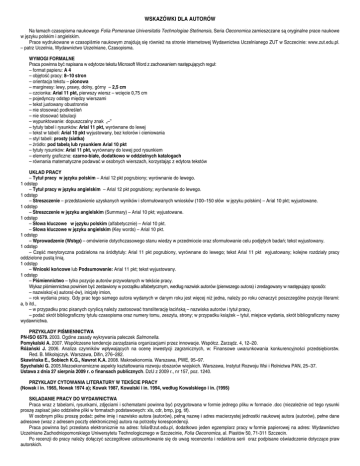 WSKAZÓWKI DLA AUTORÓW Na łamach czasopisma naukowego Folia Pomeranae Universitatis Technologiae Stetinensis, Seria Oeconomica zamieszczane są oryginalne prace naukowe w języku polskim i angielskim. Prace wydrukowane w czasopiśmie naukowym znajdują się równieŜ na stronie internetowej Wydawnictwa Uczelnianego ZUT w Szczecinie: www.zut.edu.pl. – patrz Uczelnia, Wydawnictwo Uczelniane, Czasopisma. WYMOGI FORMALNE Praca powinna być napisana w edytorze tekstu Microsoft Word z zachowaniem następujących reguł: – format papieru: A 4 – objętość pracy: 8–10 stron – orientacja tekstu – pionowa – marginesy: lewy, prawy, dolny, górny – 2,5 cm – czcionka: Arial 11 pkt, pierwszy wiersz – wcięcie 0,75 cm – pojedynczy odstęp między wierszami – tekst justowany obustronnie – nie stosować podkreśleń – nie stosować tabulacji – wypunktowanie: dopuszczalny znak „–” – tytuły tabel i rysunków: Arial 11 pkt, wyrównane do lewej – tekst w tabeli: Arial 10 pkt wyjustowany, bez kolorów i cieniowania – styl tabeli: prosty (siatka) – źródło: pod tabelą lub rysunkiem Arial 10 pkt – tytuły rysunków: Arial 11 pkt, wyrównany do lewej pod rysunkiem – elementy graficzne: czarno-białe, dodatkowo w oddzielnych katalogach – równania matematyczne podawać w osobnych wierszach, korzystając z edytora tekstów UKŁAD PRACY – Tytuł pracy w języku polskim – Arial 12 pkt pogrubiony; wyrównanie do lewego. 1 odstęp – Tytuł pracy w języku angielskim – Arial 12 pkt pogrubiony; wyrównanie do lewego. 1 odstęp – Streszczenie – przedstawienie uzyskanych wyników i sformułowanych wniosków (100–150 słów w języku polskim) – Arial 10 pkt; wyjustowane. 1 odstęp – Streszczenie w języku angielskim (Summary) – Arial 10 pkt; wyjustowane. 1 odstęp – Słowa kluczowe w języku polskim (alfabetycznie) – Arial 10 pkt. – Słowa kluczowe w języku angielskim (Key words) – Arial 10 pkt. 1 odstęp – Wprowadzenie (Wstęp) – omówienie dotychczasowego stanu wiedzy w przedmiocie oraz sformułowanie celu podjętych badań; tekst wyjustowany. 1 odstęp – Część merytoryczna podzielona na śródtytuły: Arial 11 pkt pogrubiony, wyrównane do lewego; tekst Arial 11 pkt wyjustowany; kolejne rozdziały pracy oddzielone pustą linią. 1 odstęp – Wnioski końcowe lub Podsumowanie: Arial 11 pkt; tekst wyjustowany. 1 odstęp – Piśmiennictwo – tylko pozycje autorów przywołanych w tekście pracy. Wykaz piśmiennictwa powinien być zestawiony w porządku alfabetycznym, według nazwisk autorów (pierwszego autora) i zredagowany w następujący sposób: – nazwisko(-a) autora(-ów), inicjały imion, – rok wydania pracy. Gdy prac tego samego autora wydanych w danym roku jest więcej niŜ jedna, naleŜy po roku oznaczyć poszczególne pozycje literami: a, b itd., – w przypadku prac pisanych cyrylicą naleŜy zastosować transliterację łacińską – nazwiska autorów i tytuł pracy, – podać skrót bibliograficzny tytułu czasopisma oraz numery tomu, zeszytu, strony; w przypadku ksiąŜek – tytuł, miejsce wydania, skrót bibliograficzny nazwy wydawnictwa. PRZYKŁADY PIŚMIENNICTWA PN-ISO 6579. 2003. Ogólne zasady wykrywania pałeczek Salmonella. Pomykalski A. 2007. Współczesne tendencje zarządzania organizacjami przez innowacje. Współcz. Zarządz. 4, 12–20. RóŜański J. 2006. Analiza czynników wpływających na ocenę inwestycji zagranicznych, w: Finansowe uwarunkowania konkurencyjności przedsiębiorstw. Red. B. Mikołajczyk. Warszawa, Difin, 276–282. Skawińska E., Sobiech K.G., Nawrot K.A. 2008. Makroekonomia. Warszawa, PWE, 95–97. Spychalski G. 2005.Mezoekonomiczne aspekty kształtowania rozwoju obszarów wiejskich. Warszawa, Instytut Rozwoju Wsi i Rolnictwa PAN, 25–37. Ustawa z dnia 27 sierpnia 2009 r. o finansach publicznych. DzU z 2009 r., nr 157, poz. 1240. PRZYKŁADY CYTOWANIA LITERATURY W TEKŚCIE PRACY (Nowak i in. 1965, Nowak 1974 a); Kowak 1987, Kowalski i in. 1994, według Kowalskiego i in. (1995) SKŁADANIE PRACY DO WYDAWNICTWA Praca wraz z tabelami, rysunkami, zdjęciami i schematami powinna być przygotowana w formie jednego pliku w formacie .doc (niezaleŜnie od tego rysunki proszę zapisać jako oddzielne pliki w formatach podstawowych: xls, cdr, bmp, jpg, tif). W osobnym pliku proszę podać: pełne imię i nazwisko autora (autorów), pełną nazwę i adres macierzystej jednostki naukowej autora (autorów), pełne dane adresowe (wraz z adresem poczty elektronicznej) autora na potrzeby korespondencji. Praca powinna być przesłana elektronicznie na adres: [email protected], dodatkowo jeden egzemplarz pracy w formie papierowej na adres: Wydawnictwo Uczelniane Zachodniopomorskiego Uniwersytetu Technologicznego w Szczecinie, Folia Oeconomica, al. Piastów 50, 71-311 Szczecin. Po recenzji do pracy naleŜy dołączyć szczegółowe ustosunkowanie się do uwag recenzenta i redaktora serii oraz podpisane oświadczenie dotyczące praw autorskich.