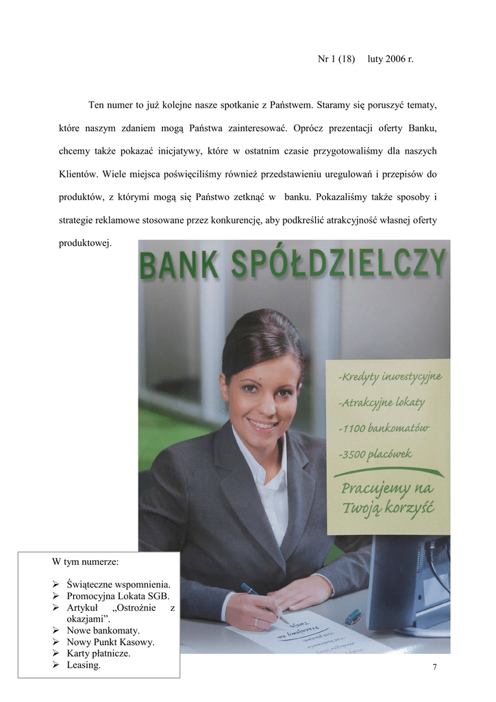 Nr 1 (18) luty 2006 r. Ten numer to juŜ kolejne nasze spotkanie z Państwem. Staramy się poruszyć tematy, które naszym zdaniem mogą Państwa zainteresować. Oprócz prezentacji oferty Banku, chcemy takŜe pokazać inicjatywy, które w ostatnim czasie przygotowaliśmy dla naszych Klientów. Wiele miejsca poświęciliśmy równieŜ przedstawieniu uregulowań i przepisów do produktów, z którymi mogą się Państwo zetknąć w banku. Pokazaliśmy takŜe sposoby i strategie reklamowe stosowane przez konkurencję, aby podkreślić atrakcyjność własnej oferty produktowej. W tym numerze: Świąteczne wspomnienia. Promocyjna Lokata SGB. Artykuł „OstroŜnie z okazjami”. Nowe bankomaty. Nowy Punkt Kasowy. Karty płatnicze. Leasing. 7 Świąteczne wspomnienia... ZaleŜało nam, aby ubiegłoroczne święta BoŜego Narodzenia, dla Państwa jako naszych Klientów były jeszcze bardziej świąteczne. Dlatego odwiedzając nas w tym gorącym okresie mogli Państwo zobaczyć wiele akcentów nierozerwalnie związanych z tym najbardziej oczekiwanych ze świąt. Stąd między innymi pomysł z Gwiazdorem, a dokładniej mówiąc Gwiazdorką, która pomimo tego, iŜ nie przyjechała do nas z dalekiej Laponii, spotkała się z bardzo serdecznym Państwa przyjęciem. Mogli ją zobaczyć Klienci odwiedzający zarówno siedzibę Banku w Mosinie jak i nasze oddziały. Klienci korzystający w tym okresie z naszych usług, przy odrobinie szczęścia, mogli opuścić Placówkę banku z drobnym upominkiem. Mamy nadzieję, Ŝe wręczane przez nas bombki ze świątecznymi Ŝyczeniami od banku, były dla Państwa miłą niespodzianką. Tym sposobem pragniemy nawiązać do tradycji wzajemnego obdarowywania się prezentami przy okazji świąt BoŜego Narodzenia. *** Promocyjna Lokata SGB Z dniem 09.01.2006r. rozpoczęła się kolejna edycja Lokaty Terminowej SGB. Organizowana wespół z Bankami zrzeszonymi w Spółdzielczej Grupie Bankowej promocja cieszy się jak zwykle duŜym zainteresowaniem. Nie uległy zmianie główne załoŜenia lokaty. Minimalna kwota wkładu wynosi 500 zł. Lokata jest zakładana na okres 6-miesięczny. Oprocentowanie jest stałe i wynosi 3,10 % w skali rocznej. Jak w kaŜdej z edycji czekają na Państwa cenne nagrody. Tym razem są to: • Ciągnik rolniczy URSUS 4514 AGRO BIS. • 10 nagród pienięŜnych w wysokości 1000 zł. Promocja Lokaty potrwa do 31.03.2006r. Warunkiem wzięcia udziału w loterii jest utrzymanie wkładu przez cały okres umowny. 2 04.07.2006r. odbędzie się losowanie nagród VI edycji Promocyjnej Lokaty SGB, która zakończyła się 16.12.2005r. Nagrody stanowią: samochód osobowy VW Polo, 3 nagrody pienięŜne w wysokości 10.000,00 zł oraz sprzęt RTV. Miło nam poinformować, Ŝe jednym z laureatów V edycji Promocyjnej Lokaty SGB została Klientka GBS Mosinie Pani w Urszula Marciniak, która stała się szczęśliwą posiadaczką kuchenki mikrofalowej De Longhi. Przekazanie nagrody zwycięŜczyni nastąpiło w Centrali Banku w Mosinie. Fot. Laureatka Pani Urszula Marciniak wraz z rodziną podczas wręczania nagrody w obecności Prezesa Zarządu GBS w Mosinie – Przemysława Pilarskiego (drugi z lewej) oraz Dyrektora Pionu Obsługi Klientów – Krzysztofa Malechy (wręczający nagrodę). *** OstroŜnie z „okazjami”. W dobie narastającej konkurencji między bankami oraz instytucjami parabankowymi jesteśmy często świadkami róŜnych form promocji swoich produktów. Determinacja w zdobywaniu nowych Klientów przez wiele instytucji finansowych jest często tak wysoka, iŜ zdarza się, Ŝe rzetelność treści reklamowych budzić moŜe spore zastrzeŜenia. Nierzadko mamy do czynienia ze stosowaniem przysłowiowego „drobnego druku” w celu ukrycia wysokiej prowizji lub niepopularnych zapisów w umowie. Prawo usiłuje nadąŜyć za szybko zmieniającą się rzeczywistością gospodarczą (Ustawa o Kredycie Konsumenckim, tzw. Ustawa antylichwiarska), choć niejednokrotnie przepisy te są niedoskonałe. W przypadku bardzo wysokiej stopy procentowej lokat terminowych naleŜy zwracać uwagę czy oprocentowanie to występuje przez cały okres umowny czy jedynie przez dany okres rozliczeniowy. Przykładem moŜe być propozycja jednego z banków, lokaty o oprocentowaniu 6 % w skali rocznej, w przypadku której okazało się, iŜ po pewnym przyjętym okresie rozliczeniowym stopa procentowa uległa istotnemu zmniejszeniu. Zdarzają się takŜe przypadki powiązania wkładu z funduszami inwestycyjnymi. Wtedy naleŜy zadać pytanie czy kapitał, który wpłacił Klient jest gwarantowany, czy moŜe 3 się zdarzyć, iŜ w przypadku niekorzystnego splotu wydarzeń nie odzyskamy nawet całości kapitału od zdeponowanych środków. Bardzo często takŜe w przypadku inwestycji w róŜne instrumenty inwestycyjne pobierana jest opłata za wykup i zbycie jednostek uczestnictwa. (wtedy to zdeponowany kapitał jest zamieniany na jednostki uczestnictwa po kursie obowiązującym w dniu transakcji). Fundusze są instrumentami długoterminowymi zorientowanymi na osiągnięcie zysku w dłuŜszym, z reguły kilkuletnim horyzoncie czasowym. Notowania jednostek poszczególnych funduszy są w mniejszym lub większym stopniu powiązane z koniunkturą na Giełdach, stąd spadek wartości Indeksów Giełdowych powoduje umniejszenie posiadanego przez nas kapitału. Nie naleŜy równieŜ bezkrytycznie podchodzić do informacji o często kilkunastoprocentowych zwrotach z inwestycji w fundusze zrealizowanych w okresach półrocznych, rocznych, itp. Banki i instytucje zajmujące się ich dystrybucją wskazują najczęściej w materiałach reklamowych najkorzystniejszy z ich punktu widzenia okres rozliczeniowy. Nie ma więc Ŝadnych gwarancji, iŜ w analogicznym, przyszłym okresie stopa zwrotu będzie taka sama lub chociaŜby zbliŜona. Klient powinien być rzetelnie poinformowany o zasadach danego produktu i związanym z nim ryzyku. W ostatnim czasie jak grzyby po deszczu powstają 