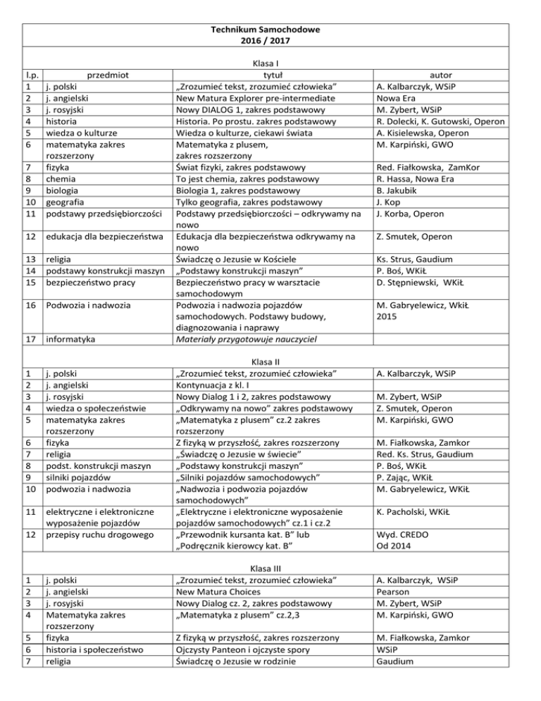 Technikum Samochodowe 2016 / 2017 l.p. 1 2 3 4 5 6 7 8 9 10 11 przedmiot j. polski j. angielski j. rosyjski historia wiedza o kulturze matematyka zakres rozszerzony fizyka chemia biologia geografia podstawy przedsiębiorczości 12 edukacja dla bezpieczeństwa 13 14 15 religia podstawy konstrukcji maszyn bezpieczeństwo pracy 16 Podwozia i nadwozia 17 informatyka 1 2 3 4 5 6 7 8 9 10 11 12 1 2 3 4 5 6 7 j. polski j. angielski j. rosyjski wiedza o społeczeństwie matematyka zakres rozszerzony fizyka religia podst. konstrukcji maszyn silniki pojazdów podwozia i nadwozia elektryczne i elektroniczne wyposażenie pojazdów przepisy ruchu drogowego j. polski j. angielski j. rosyjski Matematyka zakres rozszerzony fizyka historia i społeczeństwo religia Klasa I tytuł „Zrozumieć tekst, zrozumieć człowieka” New Matura Explorer pre-intermediate Nowy DIALOG 1, zakres podstawowy Historia. Po prostu. zakres podstawowy Wiedza o kulturze, ciekawi świata Matematyka z plusem, zakres rozszerzony Świat fizyki, zakres podstawowy To jest chemia, zakres podstawowy Biologia 1, zakres podstawowy Tylko geografia, zakres podstawowy Podstawy przedsiębiorczości – odkrywamy na nowo Edukacja dla bezpieczeństwa odkrywamy na nowo Świadczę o Jezusie w Kościele „Podstawy konstrukcji maszyn” Bezpieczeństwo pracy w warsztacie samochodowym Podwozia i nadwozia pojazdów samochodowych. Podstawy budowy, diagnozowania i naprawy Materiały przygotowuje nauczyciel Klasa II „Zrozumieć tekst, zrozumieć człowieka” Kontynuacja z kl. I Nowy Dialog 1 i 2, zakres podstawowy „Odkrywamy na nowo” zakres podstawowy „Matematyka z plusem” cz.2 zakres rozszerzony Z fizyką w przyszłość, zakres rozszerzony „Świadczę o Jezusie w świecie” „Podstawy konstrukcji maszyn” „Silniki pojazdów samochodowych” „Nadwozia i podwozia pojazdów samochodowych” „Elektryczne i elektroniczne wyposażenie pojazdów samochodowych” cz.1 i cz.2 „Przewodnik kursanta kat. B” lub „Podręcznik kierowcy kat. B” autor A. Kalbarczyk, WSiP Nowa Era M. Zybert, WSiP R. Dolecki, K. Gutowski, Operon A. Kisielewska, Operon M. Karpiński, GWO Red. Fiałkowska, ZamKor R. Hassa, Nowa Era B. Jakubik J. Kop J. Korba, Operon Z. Smutek, Operon Ks. Strus, Gaudium P. Boś, WKiŁ D. Stępniewski, WKiŁ M. Gabryelewicz, WkiŁ 2015 A. Kalbarczyk, WSiP M. Zybert, WSiP Z. Smutek, Operon M. Karpiński, GWO M. Fiałkowska, Zamkor Red. Ks. Strus, Gaudium P. Boś, WKiŁ P. Zając, WKiŁ M. Gabryelewicz, WKiŁ K. Pacholski, WKiŁ Wyd. CREDO Od 2014 Klasa III „Zrozumieć tekst, zrozumieć człowieka” New Matura Choices Nowy Dialog cz. 2, zakres podstawowy „Matematyka z plusem” cz.2,3 A. Kalbarczyk, WSiP Pearson M. Zybert, WSiP M. Karpiński, GWO Z fizyką w przyszłość, zakres rozszerzony Ojczysty Panteon i ojczyste spory Świadczę o Jezusie w rodzinie M. Fiałkowska, Zamkor WSiP Gaudium 8 podwozia i nadwozia 9 elektryczne i elektroniczne wyposażenie pojazdów organizacja i zarządzanie przedsięb. samochodowym 10 1 2 3 4 5 6 7 8 9 j. polski j. angielski j. rosyjski matematyka zakres rozszerzony fizyka zakres rozszerzony historia i społeczeństwo religia j. angielski w warsztacie samochodowym organizacja i zarządzanie przedsiębiorstwem samochodowym „Nadwozia i podwozia pojazdów samochodowych” cz.2 „Elektryczne i elektroniczne wyposażenie pojazdów samochodowych” cz.1 i cz.2 Podstawy działalności gospodarczej w branży samochodowej Klasa IV „Zrozumieć tekst, zrozumieć człowieka” Informacja we wrześniu Nowy Dialog 3 zakres podstawowy Matematyka III, zakres rozszerzony Z fizyką w przyszłość 2, zakres rozszerzony Historia i społeczeństwo Ojczysty panteon i ojczyste spory i kolejne wątki Z Chrystusem na drogach życia Informacja we wrześniu Podstawy działalności gospodarczej w branży samochodowej M. Gabryelewicz, WKiŁ K. Pocholski, WKiŁ U. Jastrzębska, WKiŁ A. Kalbarczyk, WSiP M. Zybert, WSiP M. Dobrowolska, M. Karpiński M. Fiałkowska, Zamkor M. Markowicz, O. Pytlińska, A. Wyroda Gaudium U. Jastrzębska, WKiŁ