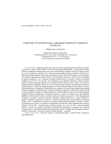 Acta Agrophysica, 2012, 19(3), 501-514 CZĘSTOŚĆ WYSTĘPOWANIA I GRUBOŚĆ POKRYWY ŚNIEŻNEJ W POLSCE Małgorzata Czarnecka Zakład Meteorologii i Klimatologii, Zachodniopomorski Uniwersytet Technologiczny w Szczecinie ul. Papieża Pawła VI, 3; 71-434 Szczecin e-mail: [email protected] S t r e s z c z e n i e . Podstawę opracowania stanowiły dobowe grubości pokrywy śnieżnej od listopada do marca w latach 1960/61-2009/10 z 40 stacji meteorologicznych IMGW, z wyłączeniem obszarów górskich. Zasadniczą charakterystykę czasowego i przestrzennego rozkładu liczby dni z pokrywą śnieżną, w tym o grubości co najmniej 5 cm, a także przeciętnej grubości pokrywy śnieżnej w dniach jej występowania, przeprowadzono dla miesięcy kalendarzowej zimy (XII-II). Stwierdzono, że na przeważającym obszarze kraju pokrywa śnieżna zalega w 30 do 60 dniach, ale tylko w około 50-70% przypadków jej grubość przekracza 5 cm. Natomiast przeciętna grubość pokrywy śnieżnej w dniach jej zalegania kształtuje się od 8 do 18 cm. Styczeń i luty charakteryzują się zbliżoną liczbą dni z pokrywą śnieżną, jednak w lutym jej przeciętna grubość we wschodnich rejonach kraju jest nieco większa. W okresie kalendarzowej zimy najbardziej śnieżną jest trzecia dekada stycznia, podczas gdy przeciętnie największe grubości pokrywy w dniach jej zalegania notuje się w trzeciej dekadzie lutego, ale także jeszcze w pierwszej dekadzie marca. Geograficzny rozkład liczby dni z pokrywą oraz jej przeciętne grubości potwierdzają rosnącą z zachodu na wschód surowość warunków termicznych, zarówno w całym okresie zimowym, jak i w poszczególnych miesiącach. W pięćdziesięcioleciu 1960/61-2009/10 zaznacza się niewielka tendencja spadkowa częstości występowania oraz grubości pokrywy śnieżnej, ale zmiany są na ogół nieistotne. Spadkowy trend liczby dni z pokrywą śnieżną, statystycznie istotny na poziomie α = 0,05, nastąpił przede wszystkim w grudniu i w styczniu, natomiast z pokrywą o grubości ponad 5 cm – niemal wyłącznie w grudniu. Wykazano statystycznie istotną rolę cyrkulacji atmosferycznej, odzwierciedloną wartościami indeksu NAO, w kształtowaniu zmienności wszystkich analizowanych cech pokrywy śnieżnej. Cyrkulacja atmosferyczna wyjaśnia, w zależności od rejonu kraju, od około 40 do 50% zmienności dni z pokrywą śnieżną, od 30 do 40% – zmienności dni z pokrywą ponad 5 cm i od 25 do 30% – zmian przeciętnej grubości w dniach jej zalegania. Największe współczynniki determinacji, wyrażające rolę warunków cyrkulacyjnych w wyjaśnianiu międzyrocznej zmienności częstości występowania oraz grubości pokrywy śnieżnej, wytestowano w styczniu i w lutym, wyraźnie mniejsze – w grudniu. S ł o w a k l u c z o w e : liczba dni, grubość, rozkład przestrzenny, wskaźnik NAO, współczynniki determinacji 502 M. CZARNECKA WSTĘP Pokrywa śnieżna jest produktem opadów w postaci śniegu, ale o jej uformowaniu i trwałości decydują głównie warunki termiczne, a w skali regionalnej i lokalnej ważnym czynnikiem deformacji pokrywy jest prędkość wiatru. Intensywne opady śniegu w nizinnej części Polski wiążą się z obecnością układów niskiego ciśnienia i adwekcją powietrza polarno-morskiego, podczas gdy o utrzymywaniu się pokrywy śnieżnej decyduje wschodnia cyrkulacja antycyklonalna i zaleganie suchych i mroźnych mas powietrza polarnego kontynentalnego (Bednorz 2010, Paczos 1982). Przeważająca częstość zalegania nad obszarem Polski mas powietrza polarno- morskiego, na zachodzie nawet od około 61% w kwietniu do 74% w grudniu (Bednorz i Więcław 2005) jest jedną z miar oceanizacji klimatu. Jednak adwekcja powietrza Pm w okresie zimowym skutkuje także występowaniem odwilży atmosferycznych, rejestrowanych w 30 do 50% dni potencjalnego okresu zimowego, które nie tylko nie sprzyjają uformowaniu pokrywy śnieżnej, ale także powodują całkowity lub częściowy zanik zalegającej pokrywy (Czarnecka i Nidzgorska-Lencewicz 2010). Czasowy i przestrzenny rozkład podstawowych cech pokrywy śnieżnej w skali całego kraju, w tym także ich cyrkulacyjne uwarunkowania, były przedmiotem licznych prac (m.in. Bednorz 2004, Czarnecka 2011, Falarz 2004, 2007, 2010, Falarz i Marsz 2005, Kasprowicz i Farat 2010). Pełniejszej ocenie zmienności i zmian parametrów pokrywy śnieżnej w Polsce posłużą wyniki satelitarnego monitoringu prowadzone w Centrum Badań Kosmicznych PAN w oparciu o dane gromadzone w ramach Interactive Multisensor Snow and Ice Mapping (Kotarba 2011). Bardzo duża zmienność trwałości i grubości pokrywy śnieżnej, decydujących o jej gospodarczym znaczeniu, a także jej rola jako ,,wskaźnika" zmian klimatu okresu zimowego ((Falarz i Marsz 2005, Marsz 1999), skłania do podejmowania badań nad jej rozkładem w możliwie najdłuższych seriach pomiarowych. Celem niniejszej pracy była ocena czasowej i przestrzennej zmienności częstości występowania i wysokości pokrywy śnieżnej, a także próba wyjaśnienia roli Oscylacji Północnego Atlantyku (NAO) w kształtowaniu fluktuacji charakteryzowanych cech zjawiska, w pięćdziesięcioleciu obejmującym także pierwszą dekadę XXI wieku. MATERIAŁY I METODY Jako materiały podstawowe wykorzystano średnie dobowe grubości pokrywy śnieżnej z okresu od listopada do marca w latach 1960/61-2009/10 z 40 stacji meteorologicznych IMGW. Przedmiotem analizy była czasowa i przestrzenna zmienność występowania pokrywy śnieżnej, w tym także o grubości co najmniej 5 cm na terenie kraju, z wyłączeniem obszarów górskich. Ze względu na niecią- CZĘSTOŚĆ WYSTĘPOWANIA I GRUBOŚĆ POKRYWY ŚNIEŻNEJ 503 głość i zmienność pokrywy śnieżnej problemem jest ocena jej przeciętnej miąższości. Jak dotąd w krajowej literaturze ta cecha pokrywy była charakteryzowana za pomocą grubości maksymalnych, sum dobowych grubości, a także gr
