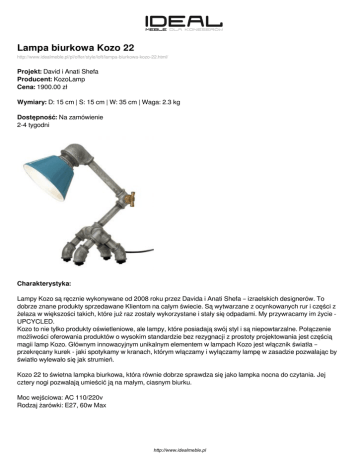 Lampa biurkowa Kozo 22 http://www.idealmeble.pl/pl/offer/style/loft/lampa-biurkowa-kozo-22.html/ Projekt: David i Anati Shefa Producent: KozoLamp Cena: 1900.00 zł Wymiary: D: 15 cm | S: 15 cm | W: 35 cm | Waga: 2.3 kg Dostępność: Na zamówienie 2-4 tygodni Charakterystyka: Lampy Kozo są ręcznie wykonywane od 2008 roku przez Davida i Anati Shefa – izraelskich designerów. To dobrze znane produkty sprzedawane Klientom na całym świecie. Są wytwarzane z ocynkowanych rur i części z żelaza w większości takich, które już raz zostały wykorzystane i stały się odpadami. My przywracamy im życie UPCYCLED. Kozo to nie tylko produkty oświetleniowe, ale lampy, które posiadają swój styl i są niepowtarzalne. Połączenie możliwości oferowania produktów o wysokim standardzie bez rezygnacji z prostoty projektowania jest częścią magii lamp Kozo. Głównym innowacyjnym unikalnym elementem w lampach Kozo jest włącznik światła – przekręcany kurek - jaki spotykamy w kranach, którym włączamy i wyłączamy lampę w zasadzie pozwalając by światło wylewało się jak strumień. Kozo 22 to świetna lampka biurkowa, która równie dobrze sprawdza się jako lampka nocna do czytania. Jej cztery nogi pozwalają umieścić ją na małym, ciasnym biurku. Moc wejściowa: AC 110/220v Rodzaj żarówki: E27, 60w Max http://www.idealmeble.pl Dostępne wersje produktu: nazwa produktu warianty Lampa biurkowa Kozo kolor klosza do 22 uzgodnienia cena 1900.00zł http://www.idealmeble.pl dostępne Na zamówienie Zdjęcia produktu: http://www.idealmeble.pl Powered by TCPDF (www.tcpdf.org)