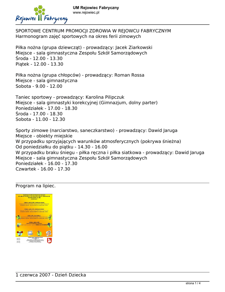 UM Rejowiec Fabryczny www.rejowiec.pl SPORTOWE CENTRUM PROMOCJI ZDROWIA W REJOWCU FABRYCZNYM Harmonogram zajęć sportowych na okres ferii zimowych Piłka nożna (grupa dziewcząt) - prowadzący: Jacek Ziarkowski Miejsce - sala gimnastyczna Zespołu Szkół Samorządowych Środa - 12.00 - 13.30 Piątek - 12.00 - 13.30 Piłka nożna (grupa chłopców) - prowadzący: Roman Rossa Miejsce - sala gimnastyczna Sobota - 9.00 - 12.00 Taniec sportowy - prowadzący: Karolina Pilipczuk Miejsce - sala gimnastyki korekcyjnej (Gimnazjum, dolny parter) Poniedziałek - 17.00 - 18.30 Środa - 17.00 - 18.30 Sobota - 11.00 - 12.30 Sporty zimowe (narciarstwo, saneczkarstwo) - prowadzący: Dawid Jaruga Miejsce - obiekty miejskie W przypadku sprzyjających warunków atmosferycznych (pokrywa śnieżna) Od poniedziałku do piątku - 14.30 - 16.00 W przypadku braku śniegu - piłka ręczna i piłka siatkowa - prowadzący: Dawid Jaruga Miejsce - sala gimnastyczna Zespołu Szkół Samorządowych Poniedziałek - 16.00 - 17.30 Czwartek - 16.00 - 17.30 Program na lipiec. 1 czerwca 2007 - Dzień Dziecka strona 1 / 4 UM Rejowiec Fabryczny www.rejowiec.pl Do realizacji imprezy włączyły się jednostki organizacyjne samorządu miasta: Zespół Szkół Samorządowych, Miejski Ośrodek Kultury "Dworek" oraz organizacja pozarządowa Uczniowski Klub Sportowy Spartakus. Imprezę włączono do Sportowego Turnieju Miast i Gmin oraz ogólnopolskiej Kampanii Profilaktycznej "Zachowaj Trzeźwy Umysł" łącząc treści o promocji aktywności ruchowej z profilaktyką uzależnień - zgodnie z założeniami Projektu. Rozdysponowano szereg materiałów informacyjnych (ulotki, plakaty, pocztówki, naklejki) wśród uczniów miejscowych szkół, prowadzono pogadanki. W ramach imprezy odbył się szereg imprez sportowych, w tym: * Grupa wiekowa - uczniowie szkoły podstawowej, klasy I-III Multidyscyplinarne gry zespołowe realizowali Roman Rossa i Kamil Góra - członkowie kadry trenerskiej SCPZ. Za udział w zajęciach dzieci nagrodzono drobnymi upominkami oraz artykułami spożywczymi. * Grupa wiekowa - uczniowie szkoły podstawowej, klasy IV-VI - Międzyklasowe rozgrywki w piłkę nożną chłopców - Mistrzostwa w piłkę ręczną dziewcząt - Turniej siatkonogi chłopców - Turniej unihoca klas IV * Grupa wiekowa - uczniowie gimnazjum - Turniej piłki nożnej chłopców - Turniej piłki ręcznej - dziewczęta contra chłopcy Ponadto w ramach imprezy przeprowadzono turniej tenisa ziemnego oraz godzinny marszobieg poświęcony pamięci zmarłego przed rokiem popularyzatora biegów, trenera i założyciela Ludowego Klubu Sportowego Agros w Rejowcu Fabryczny Zbigniewa Szczepańskiego. W marszobiegu uczestniczyło łącznie około 100 osób w różnym wieku - od lat pięciu do prawie pięćdziesięciu z terenu całego powiatu. Głównym podmiotem odpowiedzialnym za sprawy związane z prawidłowym przebiegiem marszobiegu była UKS "Spartakus". Galeria zdjęć strona 2 / 4 UM Rejowiec Fabryczny www.rejowiec.pl 18 maja 2007 - Wiosenny Turniej w Mini Piłkę Ręczną Dziewcząt o puchar Burmistrza Miasta Rejowiec Fabryczny Sportowe Centum Promocji Zdrowia w Rejowcu Fabrycznym - projekt realizowany z udziałem środków finansowych Mechanizmu Finansowego Europejskiego Obszaru Gospodarczego i Norweskiego Mechanizmu Finansowego stało się niejako platformą wydarzeń sportowych w mieście. Po "turniejowym starcie" podczas majowego długiego weekendu w piątek 18 maja na boisku zmierzyły się piłkarki ręczne rocznika 1995.Wiosenny Turniej w Mini Piłkę Ręczną Dziewcząt o Puchar Burmistrza Miasta Rejowiec Fabryczny zorganizowano we współpracy z Uczniowskim Klubem Sportowym "Spartakus" i Szkołą Podstawową w Rejowcu Fabrycznym. Wszystkie drużyny zaprezentowały wysoki poziom umiejętności, ale ostatecznie wyniki ukształtowały się następująco: - I miejsce - SP w Rejowcu pod opieką p. M. Batejko i D. Cebrat - II miejsce . SP Łuków Nr 1 pod opieką E. Kozaczuk - III miejsce . SP Cyców pod opieką p. D. Bednarczuka - IV miejsce . SP Rejowiec Fabryczny UKS Spartakus pod opieką p. M. Ożoga - V miejsce . SP Nr 7 Chełm pod opieką p. A. Mochnieja Tytuł króla strzelców zdobyła Aldona Rutka - reprezentantka SP Rejowiec. Zdobywczyni tytułu najlepszej bramkarki to Alicja Kowalczyk z UKS Spartakus i SP w Rejowcu Fabrycznym. Wiosenny puchar - galeria strona 3 / 4 UM Rejowiec Fabryczny www.rejowiec.pl strona 4 / 4 Powered by TCPDF (www.tcpdf.org)