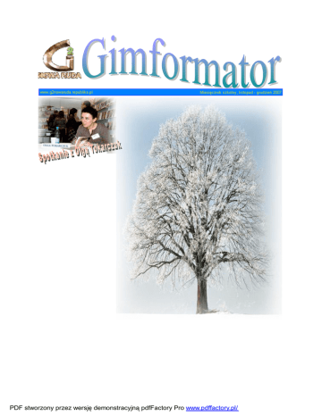PDF stworzony przez wersję demonstracyjną pdfFactory Pro www.pdffactory.pl/ Za nami prawie połowa roku szkolnego, już tylko 2, dwa, DWA, D- W-A tygodnie dzielą nas od Świąt Bożego Narodzenia!!! Rozpoczęło się finałowe odliczanie. To specjalne, jesienne wydanie „Gimformatora” jest właśnie dla Was ;). Wszystkim naszym Czytelnikom życzymy radosnych, Wesołych Świąt i prawdziwej, szampańskiej zabawy w Sylwestra J. A w tym numerze: 1. Spotkanie z Olgą Tokarczuk - to niewiarygodne, że tuż obok nas rozkwita taki talent; chyba jesteśmy świadkami jakiegoś niezwykłego wydarzenia literackiego, ale nie do końca zdajemy sobie z tego sprawę. 2. Felieton ‘...i pozwól mi spróbować jeszcze raz...” 3. W Redakcyjnej Kuchni 4. Imiennik 5. Felieton – (czyżbyśmy stali się felietonistami?) Koniecznie przeczytajcie ten felieton, nieco ostry, ale to nic w porównaniu z talentem, jaki odsłania. Oczywiście nie musicie się zgadzać z felietonistą (ką)! A może jednak niektóre opinie krytyczne trafią do Was? PDF stworzony przez wersję demonstracyjną pdfFactory Pro www.pdffactory.pl/ UWAGA ! UWAGA! UWAGA ! Wszystkim Humanistom, miłośnikom literatury, zainteresowanym twórczością NASZEJ PISARKI – OLGI TOKARCZUK przypominamy, że 27 listopada o godz. 17 w czytelni Miejskiej Biblioteki Publicznej w Nowej Rudzie na ul. Bohaterów Getta miało miejsce spotkaniu z autorką. Tradycyjnie prowadził je nasz noworudzki poeta, krytyk literacki, nauczyciel języka polskiego w Szkole Podstawowej nr 3, wykładowca uniwersytecki KAROL MALISZEWSKI. Spotkanie z powieściopisarką miało na celu prezentację jej najnowszej powieści pt. „Bieguni”. Jak mówi o niej Jerzy Jastrzębski – „może najlepsza książka Olgi Tokarczuk”. A kim byli tytułowi bieguni? Odłamem prawosławnych starowierców. Odrzucali hierarchię kościelną, wierzyli, że świat jest przesiąknięty złem. Uważali, że zło ma największą moc, gdy człowiek stanie w miejscu. Jedynym sposobem ratunku przed złem jest podróż, ruch. Tylko nieustanny ruch, przemieszczanie się chroni nas przed władzą szatana. Pisarka zapytana w wywiadzie przez Kingę Dunin o to, czy sama jest takim biegunem, odpowiedziała twierdząco. Nie przejdźcie obok tego literackiego wydarzenia obojętnie! To nie Mickiewicz, spoglądający na Was z piedestału wieszcza i odległych epok, ale prawdziwa, żyjąca tu i teraz, nieopodal Was wspaniała, uznawana przez krytyków za jedną z największych współczesnych powieściopisarek – Olga Tokarczuk. Sięgnijcie po jej najnowszą powieść! PDF stworzony przez wersję demonstracyjną pdfFactory Pro www.pdffactory.pl/ Olga Tokarczuk urodziła się 29 stycznia 1962 roku w Sulechowie. Jest pisarką, eseistką, autorką scenariuszy, poetką. Ukończyła psychologię na Uniwersytecie Warszawskim. Uhonorowana wieloma nagrodami, m.in. nagrodą Polskiego Towarzystwa Wydawców Książek, nagrodą Fundacji im. Kościelskich, paszportem Polityki oraz kilkoma nominacjami do literackiej Nagrody Nike. Od 2004 roku organizuje we Wrocławiu i Jeleniej Górze Festiwal Opowiadań, na którym autorzy krótkich form literackich z różnych krajów świata prezentują swoje dokonania. Zadebiutowała w roku 1979 na łamach pisma „Na przełaj”, gdzie pod pseudonimem Natasza Borowin publikowała pierwsze opowiadania. Około stu osób gościło we wtorek (27.11.2007) w czytelni Miejskiej Biblioteki Publicznej na spotkaniu z Olgą Tokarczuk. Tak duże zainteresowanie wzbudziła zapewne sama pisarka, jak również jej najnowsza książka "Bieguni", której poświęcony był ów wieczór. Witając panią Olgę, dyrektor MBP, pan Sławomir Drogoś, odczytał list od burmistrza Nowej Rudy pana Tomasza Kilińskiego, w którym wyraził on uznanie zarówno dla twórczości pisarki jak również dla jej wkładu w promocję naszego miasta. Spotkanie prowadzone ...przez noworudzkiego poetę i krytyka literackiego Karola Maliszewskiego potrwało około 2 godzin. Jak przyznała Olga Tokarczuk, bardzo lubi spotykać się z noworudzianami, którzy są dobrą i dojrzałą publicznością. Tokarczuk pracowała nad Biegunami przez trzy lata. Wspomina, że większość notatek robiła w podróży: „Ale nie jest to książka o podróży. Nie ma w niej opisów zabytków i miejsc. Nie jest to dziennik podróży ani reportaż. Chciałam raczej przyjrzeć się temu, co to znaczy podróżować, poruszać się, przemieszczać. Jaki to ma sens? Co nam to daje? Co to znaczy” - pisze we wstępie autorka. „Bieguni” to literacka monografia zjawiska ruchliwości, poruszania się, niepokoju podróżnego. Zdaniem autorki, turystyka stała się współczesnym sposobem zaspokajania bardzo starego, atawistycznego, nomadycznego popędu. Osią, wokół której autorka zbudowała książkę, nie jest postać, jakaś historia, tylko fenomen, jakim jest podróżowanie. Tytuł książki „Bieguni” nawiązuje do nazwy rosyjskiej sekty z XVIII wieku, której członkowie uważali, że świat jest dziełem szatana, a kiedy się zatrzymujemy, szatan ma do nas najlepszy dostęp. Żeby uciec przed diabłem, musimy się cały czas poruszać. Tokarczuk pisze, że spotkała współczesnych biegunów, niedobitków tej sekty, którzy przez cały czas przemieszczają się metrem po Moskwie. Autorka opisuje świat współczesnych Biegunów, permanentnych podróżników, którzy mają swoje produkty, kosmetyki podróżne (małe tubki past, miniaturowe szamponiki, składane szczoteczki do zębów, jednorazowe kapcie), swoje choroby związane ze zmianami czasu, własny język: prosty, sfunkcjonalizowany angielski. Istnieje nawet odrębna gałąź psychologii, która ich opisuje - psychologia podróżna. PDF stworzony przez wersję demonstracyjną pdfFactory Pro www.pdffactory.pl/ Pierwszym tematem poruszonym przez Karola Maliszewskiego był tworzony przez pisarkę obraz kobiety. Prowokacyjnie zarzucił on Oldze Tokarczuk zbytnie dążenie