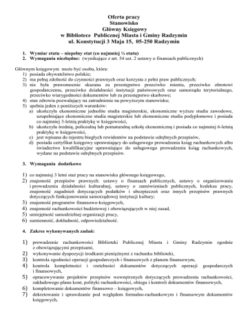 Oferta pracy Stanowisko Główny Księgowy w Bibliotece Publicznej Miasta i Gminy Radzymin ul. Konstytucji 3 Maja 15, 05-250 Radzymin 1. Wymiar etatu – niepełny etat (co najmniej ¼ etatu) 2. Wymagania niezbędne: (wynikające z art. 54 ust. 2 ustawy o finansach publicznych) Głównym księgowym może być osoba, która: 1) posiada obywatelstwo polskie; 2) ma pełną zdolność do czynności prawnych oraz korzysta z pełni praw publicznych; 3) nie była prawomocnie skazana za przestępstwo przeciwko mieniu, przeciwko obrotowi gospodarczemu, przeciwko działalności instytucji państwowych oraz samorządu terytorialnego, przeciwko wiarygodności dokumentów lub za przestępstwo skarbowe; 4) stan zdrowia pozwalający na zatrudnienie na powyższym stanowisku; 5) spełnia jeden z poniższych warunków: a) ukończyła ekonomiczne jednolite studia magisterskie, ekonomiczne wyższe studia zawodowe, uzupełniające ekonomiczne studia magisterskie lub ekonomiczne studia podyplomowe i posiada co najmniej 3-letnią praktykę w księgowości, b) ukończyła średnią, policealną lub pomaturalną szkołę ekonomiczną i posiada co najmniej 6-letnią praktykę w księgowości, c) jest wpisana do rejestru biegłych rewidentów na podstawie odrębnych przepisów, d) posiada certyfikat księgowy uprawniający do usługowego prowadzenia ksiąg rachunkowych albo świadectwo kwalifikacyjne uprawniające do usługowego prowadzenia ksiąg rachunkowych, wydane na podstawie odrębnych przepisów. 3. Wymagania dodatkowe 1) co najmniej 3 letni staż pracy na stanowisku głównego księgowego, 2) znajomość przepisów prawnych: ustawy o finansach publicznych, ustawy o organizowaniu 3) 4) 5) 6) i prowadzeniu działalności kulturalnej, ustawy o zamówieniach publicznych, kodeksu pracy, znajomość zagadnień dotyczących podatków i ubezpieczeń oraz innych przepisów prawnych dotyczących funkcjonowania samorządowej instytucji kultury; znajomość programów finansowo-księgowych, znajomość rachunkowości budżetowej i obowiązujących w niej zasad, umiejętność samodzielnej organizacji pracy, sumienność, dokładność, odpowiedzialność. 4. Zakres wykonywanych zadań: 1) prowadzenie rachunkowości Biblioteki Publicznej Miasta i Gminy Radzymin zgodnie 2) 3) 4) 5) 6) 7) z obowiązującymi przepisami, wykonywanie dyspozycji środkami pieniężnymi z rachunku biblioteki, kontrola zgodności operacji gospodarczych i finansowych z planem finansowym, kontrola kompletności i rzetelności dokumentów dotyczących operacji gospodarczych i finansowych, opracowywanie projektów przepisów wewnętrznych dotyczących prowadzenia rachunkowości, zakładowego planu kont, polityki rachunkowości, obiegu i kontroli dokumentów finansowych, kompletowanie dokumentów finansowo – księgowych, dekretowanie i sprawdzanie pod względem formalno-rachunkowym i finansowym dokumentów księgowych, 8) naliczania wynagrodzeń pracowniczych, zaliczek podatkowych, składek na ubezpieczenie społeczne i zdrowotne, potraceń oraz terminowości ich przekazywania, 9) obliczanie podatku dochodowego od osób fizycznych oraz sporządzanie deklaracji, 10) sporządzanie sprawozdań finansowych, prowadzenie spraw związanych z ZUS, Urzędem Skarbowym, Urzędem Statystycznym, Urzędem Gminy, 11) prowadzenie ewidencji księgowej środków trwałych , wyposażenia , sprzętu, księgozbioru, 12) wykonywanie innych czynności wynikających z zajmowanego stanowiska. 5. Informacja o warunkach pracy: 1) 2) 3) 4) norma dobowa czasu pracy wynosi co najmniej 2 godziny, norma tygodniowa czasu pracy wynosi co najmniej 10 godzin, wynagrodzenie za pracę wypłacane jest raz w miesiącu do 28-go dnia każdego miesiąca, możliwe rozpoczęcie pracy już od początku lipca 2016 r. 6. Wymagane dokumenty i oświadczenia 1) 2) 3) 4) 5) list motywacyjny, życiorys zawodowy – curriculum vitae, wypełniony kwestionariusz osobowy dla osób ubiegających się o zatrudnienie (załącznik do oferty) dokumenty potwierdzające wymagane kwalifikacje i umiejętności, świadectwa pracy, oświadczenie kandydata o braku prawomocnego skazania za przestępstwo przeciwko mieniu, przeciwko obrotowi gospodarczemu, przeciwko działalności instytucji państwowych oraz samorządu terytorialnego, przeciwko wiarygodności dokumentów lub za przestępstwo skarbowe, 6) oświadczenie o korzystaniu z pełnej zdolności do czynności prawnych oraz korzystaniu z pełni praw publicznych, 7) aktualne zaświadczenie o stanie zdrowia stwierdzające zdolność do pracy na wskazanym stanowisku (zaświadczenie wydane przez lekarza), 8) podpisane oświadczenie o treści - "wyrażam zgodę na przetwarzanie danych osobowych zawartych w mojej ofercie pracy, dla potrzeb niezbędnych do procesu rekrutacyjnego - zgodnie z ustawą z dnia 29.08.1997r. o ochronie danych osobowych (Dz. U. z 2002 r. Nr 101 poz. 926 z późn. zm.). 7. Informacje dodatkowe: 1) informacji dotyczących oferty pracy na stanowisko głównego księgowego udziela: Dyrektor Biblioteki Publicznej Miasta i Gminy Radzymin Artur Laskowski , tel. 691801220. DYREKTOR Artur Laskowski