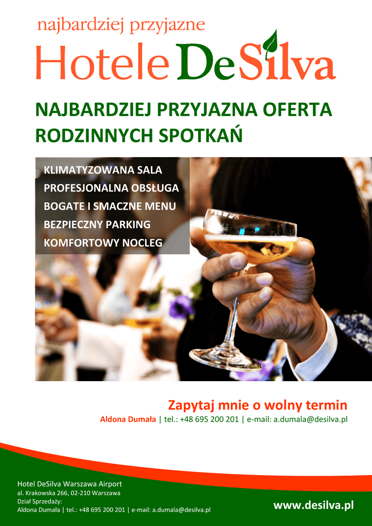 NAJBARDZIEJ PRZYJAZNA OFERTA RODZINNYCH SPOTKAŃ KLIMATYZOWANA SALA PROFESJONALNA OBSŁUGA BOGATE I SMACZNE MENU BEZPIECZNY PARKING KOMFORTOWY NOCLEG Zapytaj mnie o wolny termin Aldona Dumała | tel.: +48 695 200 201 | e-mail: [email protected] Hotel DeSilva Warszawa Airport al. Krakowska 266, 02-210 Warszawa Dział Sprzedaży: Aldona Dumała | tel.: +48 695 200 201 | e-mail: [email protected] www.desilva.pl Szanowni Paostwo, Dziękuję za zainteresowanie hotelem DeSilva Warszawa Airport. Nasza restauracja oraz sale bankietowe są doskonałym miejscem do organizacji przyjęd okolicznościowych. W ramach pakietu zapewniamy: wynajem sali restauracyjnej przygotowanie miejsc dla gości przy wspólnych stołach bankietowych eleganckie nakrycie stołów bogate menu: zakąski zimne, dania gorące, desery napoje bezalkoholowe zimne i gorące podawane bez ograniczeo preferencyjne ceny pokoi dla Paostwa gości Na Paostwa życzenie pomożemy wzbogacid pakiety o usługi towarzyszące: przygotowanie tortu okolicznościowego w cenie 10 pln od osoby patery ciast z naszej cukierni w cenie 10 pln od osoby dekoracje z żywych kwiatów w cenie od 65 pln za ikebanę pamiątkowe karty menu w cenie 5 pln za sztukę Koszt przyjęcia zależy od wybranego menu. Cena zawiera podatek VAT. Gorąco polecam organizację przyjęcia w hotelu DeSilva Warszawa Airport. Serdecznie pozdrawiam, Aldona Dumała tel.: +48 695 200 201 e-mail: [email protected] Hotel DeSilva Warszawa Airport al. Krakowska 266, 02-210 Warszawa Dział Sprzedaży: Aldona Dumała | tel.: +48 695 200 201 | e-mail: [email protected] www.desilva.pl MENU 1 cena 130 pln od osoby dzieci do lat 12 – 50 % zniżki Obiad podawany przez kelnerów: Sałatka nicejska Krem z brokułów z groszkiem ptysiowym Zraziki schabowe podawane w sosie pieczeniowym z ziemniakami i czerwoną zasmażaną kapustą Jabłecznik na kruchym cieście z lodami i sosem waniliowym Zimne dania na półmiskach ustawionych na stole: Rolada z kurczaka nadziewana śliwkami Terrina brokułowa Schab po warszawsku z musem chrzanowym Sandacz faszerowany Mięsa pieczone: szynka pieczona, schab środkowy pieczony, schab karkowy Wybór wędlin: salami, szynka, baleron, polędwica sopocka, kabanosy Sałatka z kurczakiem, selera naciowego z sosem imbirowym Sałatka „Grecka” z serem Feta, pomidorów, ogórka, cebuli i czarnych oliwek Świeże ogórki i pomidory Marynaty: pieczarki, ogórki, papryka, śliwki Sosy: koktajlowy, koperkowy, tatarski, chrzanowy, żurawinowy Pieczywo, masło Napoje: Napoje bezalkoholowe zimne i gorące bez ograniczeo Hotel DeSilva Warszawa Airport al. Krakowska 266, 02-210 Warszawa Dział Sprzedaży: Aldona Dumała | tel.: +48 695 200 201 | e-mail: [email protected] www.desilva.pl MENU 2 cena 155 pln od osoby dzieci do lat 12 – 50 % zniżki Obiad podawany przez kelnerów: Carpaccio z polędwicy wołowej z parmezanem i grzybami Krem z pomidorów z groszkiem ptysiowym Medaliony z indyka z dodatkiem szynki parmeoskiej podawane z kluseczkami gnocchi i gotowanymi szparagami Puchar lodów z owocami Zimne dania na półmiskach ustawionych na stole: Rolada z kurczaka nadziewana śliwkami Terrina brokułowa Schab po warszawsku z musem chrzanowym Sandacz faszerowany Mięsa pieczone: szynka pieczona, schab środkowy pieczony, schab karkowy Wybór wędlin: salami, szynka, baleron, polędwica sopocka, kabanosy Sałatka z kurczakiem, selera naciowego z sosem imbirowym Sałatka „Grecka” z serem Feta, pomidorów, ogórka, cebuli i czarnych oliwek Świeże ogórki i pomidory Marynaty: pieczarki, ogórki, papryka, śliwki Sosy: koktajlowy, koperkowy, tatarski, chrzanowy, żurawinowy Pieczywo, masło Napoje: Napoje bezalkoholowe zimne i gorące bez ograniczeo Hotel DeSilva Warszawa Airport al. Krakowska 266, 02-210 Warszawa Dział Sprzedaży: Aldona Dumała | tel.: +48 695 200 201 | e-mail: [email protected] www.desilva.pl MENU 3 cena 175 pln od osoby dzieci do lat 12 – 50 % zniżki Obiad podawany przez kelnerów: Tatar z łososia wędzonego przygotowany na tostach dekorowany cytryną i skropiony dressingiem z octu balsamicznego Kaczka z pieczonymi jabłkami, czerwoną kapustą, smażonymi ziemniakami i sosem żurawinowym. Deser z gruszką i sosem waniliowym Zimne dania na półmiskach ustawionych na stole: Rolada z kurczaka nadziewana śliwkami Terrina brokułowa Schab po warszawsku z musem chrzanowym Sandacz faszerowany Mięsa pieczone: szynka pieczona, schab środkowy pieczony, schab karkowy Wybór wędlin: salami, szynka, baleron, polędwica sopocka, kabanosy Sałatka z kurczakiem, selera naciowego z sosem imbirowym Sałatka „Grecka” z serem Feta, pomidorów, ogórka, cebuli i czarnych oliwek Świeże ogórki i pomidory Marynaty: pieczarki, ogórki, papryka, śliwki Sosy: koktajlowy, koperkowy, tatarski, chrzanowy, żurawinowy Pieczywo, masło Napoje: Napoje bezalkoholowe zimne i gorące bez ograniczeo Hotel DeSilva Warszawa Airport al. Krakowska 266, 02-210 Warszawa Dział Sprzedaży: Aldona Dumała | tel.: +48 695 200 201 | e-mail: [email protected] www.desilva.pl CENNIK ALKOHOLI BANKIETOWYCH DESILVA OPEN BAR - CZAS TRWANIA DO 4 GODZIN ( z możliwością przedłużenia ) opcja A - wino musujące, wino bankietowe, piwo, napoje bezalkoholowe 60 PLN od osoby opcja B - wino musujące, wino bankietowe, piwo, wódka krajowa, napoje bezalkoholowe 70 PLN od osoby opcja C - wino musujące, wino bankietowe, piwo, wódka krajowa, gin, rum, Campari, 90 PLN od osoby Martini, whisky Johnnie Walker red label, Ballantine’s, napoje bezalkoholowe DESILVA ALKOHOLE NA BUTELKI - ZAMAWIANE WEDŁUG POTRZEB Rodzaj napoju opakowanie objętośd Cena brutto za butelkę / keg Wino musujące butelka 0,75 L 75 PLN Wino bankietowe ( białe / czerwone ) butelka 0,75 L 45 PLN Piwo Carlsberg keg 20 L 400 PLN Piwo Carlsberg butelka 0,33 L 8 PLN Piwo Harnaś butelka 0,5 L 8 PLN Piwo Karmi butelka 0,4 L 8 PLN Wódka Wyborowa Exquisite butelka 0,7 L 280 PLN Wódka Absolut butelka 0,7 L 120 PLN Wódka Wyb