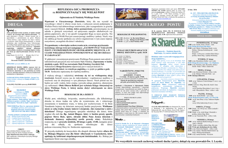REFLEKSJA OJCA PROBOSZCZA na ROZPOCZYNAJĄCY SIĘ WIELKI POST Organizacja katolickich kobiet pod nazwa DYNAMIC WOMEN OF FAITH zaprasza panie na swoja 7-mą doroczną konferencję w sobotę, 19 marca do Centrum J.P. II. w godz. 8:30 - 17:00. Dzień wcześniej, 18 marca odbędzie się specjalny wieczór dla matek i córek w Markland Wood Golf Club w Etobicoke.Oba spotkania są w j. ang. dynamicwomenfaith.com Ogłoszenia na II Niedzielę Wielkiego Postu: DRUGA Dzisiaj … Jezus powiedział swoim uczniom, że będzie cierpiał i umrze, ale trzeciego dnia zmartwychwstanie. To samo pouczenie o krzyżu i chwale zawarte jest w opowiadaniu o przemienieniu na górze: Mojżesz i Eliasz mówią o „Jego odejściu” tzn. męce i śmierci, a uczniowie widzą Jezusa przemienionego, w chwale niebieskiej, jako uwielbionego Syna człowieczego. Za niedługo będą oglądali tego samego Jezusa na Górze Oliwnej, jako cierpiącego Sługę Pańskiego. Tajemnice tragicznego „odejścia”, którego dokonano w Jerozolimie, uczniowie zrozumieją dopiero wtedy, gdy Jezus po zmartwychwstaniu otworzy ich oczy i serca. I czyt. Rodz.15,5-12.17-18 II czyt.: Flp 3,17-4,1 Ewangelia: Łk. 9,28b-36 Psalm responsorialny: Pan moim światłem i zbawieniem moim RÓŻANIEC prowadzi RÓŻA nr. 45. APOSTOLAT ZŁOTA RÓŻA zaprasza dziś do włączenia się w modlitwę w intencji kapłanów. Członkowie Apostolatu w sali parafialnej po każdej mszy św. udzielają informacji i dzielą się świadectwem uczestnictwa w Apostolacie. ZAŚWIADCZENIA PODATKOWE - Income Tax zostały wysłane, a donacje na Family of Faith wysyła Archidiecezja. NA KAWĘ i PĄCZKI zapraszają HARCERZE. MŁODZIEŻ wyjeżdżająca na ŚDM zaprasza na obiad przygotowany przez rodziców. Wśród smakołyków będą: *Kotlet schabowy *kotlet mielony *pierś z kurczaka *kiełbasa na gorąco z cebulką *bigos *surówka z białej kapusty *buraczki na ciepło *zapiekanka. WIECZOREM po Mszy św. zapraszamy młodzież na kolejne spotkanie, które poprowadzi Stephanie Glowacki: Tematem będzie: THE GIFTS OF THE HOLY SPIRIT Prosimy pamiętać o następnych spotkaniach: 13 III, - Bishop Gerald Wiesner OMI 3 IV, - Cardinal Zenon Grocholewski 17 IV, - Fr. Tom Rosica, Salt and light TV 8 V, - Sprawy Logistyczne - S.Reitmaier 22 V, - Sprawy Logistyczne -S.Reitmaier CHRZTY Mocą działania Ducha świętego i przez polanie wodą, dar chrztu świętego otrzyma: Maja Malachowski córka Sylwii i Andrzeja Mai, rodzicom i chrzestnym życzymy Bożego błogosławieństwa. Wpatrzeni w Ukrzyżowanego Zbawiciela, który dla nas wyrzekł się wszystkiego i złożył w ofierze swoje życie, z ochoczym sercem podejmujmy w Wielkim Poście trud dobrowolnego umartwienia, jako wynagrodzenie za grzechy nasze i naszych bliźnich. Zróbmy dobre postanowienia, powstrzymujmy się od udziału w głośnych rozrywkach, od spożywania napojów alkoholowych czy palenia papierosów, aby w ten sposób wynagrodzić Bogu za nasze grzechy. Nie zapominajmy, że Wielki Post jest czasem powagi, modlitwy i pokuty. Niech, więc nie zakłócą go huczne spotkania czy celowo organizowane w tym czasie imprezy rozrywkowe, szczególnie dla dzieci i młodzieży. Przypominamy o obowiązku zachowywania m.in. czwartego przykazania kościelnego, którego treść jest następująca: „ZACHOWYWAĆ NAKAZANE POSTY I WSTRZEMIĘŹLIWOŚĆ OD POKARMÓW MIĘSNYCH, A W CZASIE WIELKIEGO POSTU POWSTRZYMYWAĆ SIĘ OD UDZIAŁU W ZABAWACH”. W głębszym i owocniejszym przeżywaniu Wielkiego Postu pomoże nam udział w nabożeństwach pasyjnych oraz rozważanie Męki Pańskiej. Zapraszamy w każdą niedzielę o godz. 18:15 na rozważania Męki Pańskiej, Gorzkich Żali. Nabożeństwo Droga Krzyżowa odprawiana jest w naszym kościele w poniedziałki dla dzieci, we wtorki po angielsku, a w piątki po polsku o godz. 18:30. Serdecznie zapraszamy do wspólnej modlitwy. Z większą odwagą i radykalniej otwórzmy się też na wielkopostną akcję trzeźwości. Kościół wzywa nas do indywidualnej i wspólnotowej modlitwy o trzeźwość oraz do abstynencji w tym pokutnym okresie. Niech pośród nas nie będzie już osób i rodzin, które cierpią z powodu nałogu pijaństwa, nikotynizmu czy narkomanii. Obok Ołtarza Relikwii jest wyłożona Księga Abstynencji na okres Wielkiego Postu, w której można złożyć zobowiązanie na okres Wielkiego Postu. REKOLEKCJE DLA DZIECI! Wielki post, rekolekcje, święconka, zmartwychwstanie…dla kilkuletniego dziecka to słowa trudne nie tylko do wymówienia, ale i właściwego zrozumienia w kontekście wiary, w której jest wychowywane. O ile Boże Narodzenie kojarzy się dzieciom zazwyczaj bardzo pozytywnie, Wielkanoc niesie ze sobą trudne tematy śmierci i cierpienia. Jak rozmawiać o nich z dzieckiem? Dlatego organizujemy specjalne rekolekcje dla dzieci, które wygłosi dla nich ks. Bp. Antoni Długosz, który w bardzo prosty sposób, poprzez Słowo Boże, śpiew, obrazki zbliża Pana Jezusa dzieciom i doskonale tłumaczy najbardziej zawiłe prawdy wiary. Rekolekcje rozpoczną się w przyszła niedzielę, 28 lutego o godz. 13:00, następnie przez trzy dni odbędą się spotkania rekolekcyjne dla dzieci podczas wieczornej Mszy św. Serdecznie zapraszamy. W przyszłą niedzielę do koszyczków dla ubogich zbierana będzie ofiara dla ks. Biskupa Długosza oraz dla Sióstr Albertynek w Częstochowie, które opiekują się kobietami niepełnosprawnymi intelektualnie. Ks. Biskup jest kapelanem Sióstr oraz tego ośrodka. NIEDZIELA WIELKIEGO POSTU REKOLEKCJE WIELKOPOSTNE: 28 II, niedziela. MSZA ŚW. W INTENCJI PAR OBCHODZĄCYCH ROCZNICĘ SWOJEGO ŚLUBU o godz. 11:00. Zgłoszenia-biuro parafialne. 23 II, wtorek - Gr. Piątkowa 26 II, piątek - Grupa Pro-Life 4 III, piątek - Młodzież 8 III, wtorek - Rycerze Kolumba 11 III, piątek - K. Wyzwolenia Człowieka 18 III, piątek - 6:15 PM - Ministranci (ang.) (pol.) (pol.) (ang.) (pol.) (pol.) NABOŻEŃSTWA POKUTNE w naszej parafii: poniedziałek - 21 m