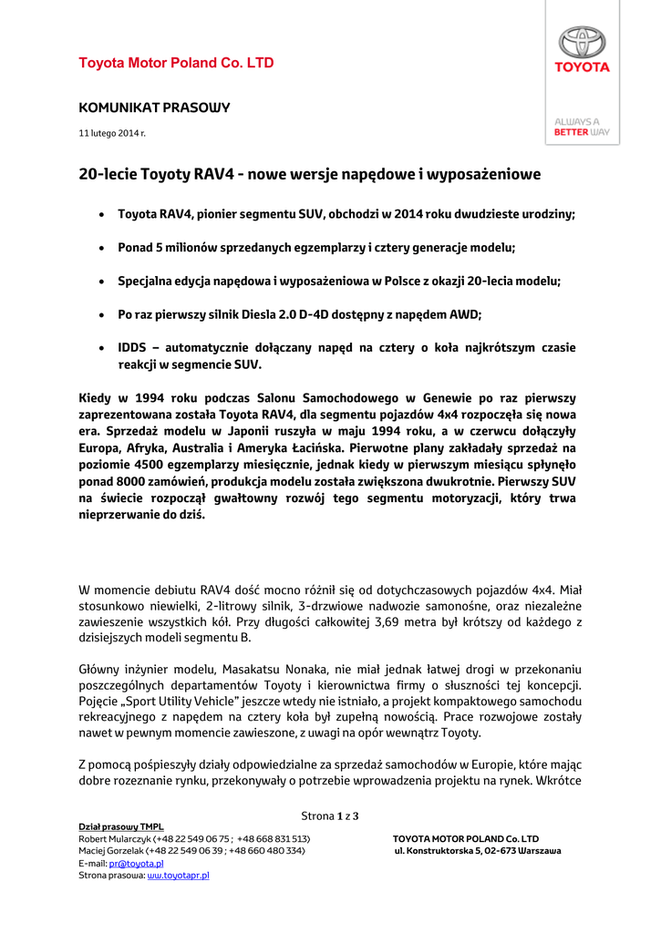 Toyota Motor Poland Co. LTD KOMUNIKAT PRASOWY 11 lutego 2014 r. 20-lecie Toyoty RAV4 - nowe wersje napędowe i wyposażeniowe Toyota RAV4, pionier segmentu SUV, obchodzi w 2014 roku dwudzieste urodziny; Ponad 5 milionów sprzedanych egzemplarzy i cztery generacje modelu; Specjalna edycja napędowa i wyposażeniowa w Polsce z okazji 20-lecia modelu; Po raz pierwszy silnik Diesla 2.0 D-4D dostępny z napędem AWD; IDDS – automatycznie dołączany napęd na cztery o koła najkrótszym czasie reakcji w segmencie SUV. Kiedy w 1994 roku podczas Salonu Samochodowego w Genewie po raz pierwszy zaprezentowana została Toyota RAV4, dla segmentu pojazdów 4x4 rozpoczęła się nowa era. Sprzedaż modelu w Japonii ruszyła w maju 1994 roku, a w czerwcu dołączyły Europa, Afryka, Australia i Ameryka Łacińska. Pierwotne plany zakładały sprzedaż na poziomie 4500 egzemplarzy miesięcznie, jednak kiedy w pierwszym miesiącu spłynęło ponad 8000 zamówień, produkcja modelu została zwiększona dwukrotnie. Pierwszy SUV na świecie rozpoczął gwałtowny rozwój tego segmentu motoryzacji, który trwa nieprzerwanie do dziś. W momencie debiutu RAV4 dość mocno różnił się od dotychczasowych pojazdów 4x4. Miał stosunkowo niewielki, 2-litrowy silnik, 3-drzwiowe nadwozie samonośne, oraz niezależne zawieszenie wszystkich kół. Przy długości całkowitej 3,69 metra był krótszy od każdego z dzisiejszych modeli segmentu B. Główny inżynier modelu, Masakatsu Nonaka, nie miał jednak łatwej drogi w przekonaniu poszczególnych departamentów Toyoty i kierownictwa firmy o słuszności tej koncepcji. Pojęcie „Sport Utility Vehicle” jeszcze wtedy nie istniało, a projekt kompaktowego samochodu rekreacyjnego z napędem na cztery koła był zupełną nowością. Prace rozwojowe zostały nawet w pewnym momencie zawieszone, z uwagi na opór wewnątrz Toyoty. Z pomocą pośpieszyły działy odpowiedzialne za sprzedaż samochodów w Europie, które mając dobre rozeznanie rynku, przekonywały o potrzebie wprowadzenia projektu na rynek. Wkrótce Strona 1 z 3 Dział prasowy TMPL Robert Mularczyk (+48 22 549 06 75 ; +48 668 831 513) Maciej Gorzelak (+48 22 549 06 39 ; +48 660 480 334) E-mail: [email protected] Strona prasowa: ww.toyotapr.pl TOYOTA MOTOR POLAND Co. LTD ul. Konstruktorska 5, 02-673 Warszawa Toyota Motor Poland Co. LTD KOMUNIKAT PRASOWY po debiucie, RAV4 stał się punktem odniesienia dla innych producentów i prawdziwym trendsetterem w motoryzacji. W pierwszym roku sprzedaży model znalazł 53 tysięcy klientów. Rok później liczba ta była dwukrotnie większa, dwa lata później trzykrotnie większa. W 2013 roku sprzedaż RAV4 dziesięciokrotnie przewyższyła wynik z pierwszego roku produkcji. Łącznie Toyota sprzedała ponad 5 milionów egzemplarzy RAV4 (1,3 mln w Europie). Dzięki najwyższemu poziomowi niezawodności, ponad 90% z nich jest nadal w ruchu – RAV4 od lat zajmuje najwyższe pozycje w zestawieniach bezawaryjności. Cztery generacje, 20 lat ewolucji modelu 1994-2000, I Generacja: pierwszy miejski samochód 4x4, początkowo oferowany z nadwoziem 3-drzwiowym. Kompaktowy i lekki: 3,69 m długości całkowitej, 2-litrowy silnik o mocy 129 KM, brak reduktora, niezależne zawieszenie. Dzięki małym rozmiarom i wyższej pozycji za kierownicą, wyróżniał się wyjątkową zwinnością i łatwością manewrowania. W 1996 roku do oferty dołączyła wersja pięciodrzwiowa i napęd 2WD. Dostępna była także wersja trzydrzwiowa z miękkim dachem. W latach 1997-2000 produkowana była pierwsza odmiana RAV4 EV, czyli samochodu z napędem elektrycznym. 2000-2006, II Generacja: dostępna od początku produkcji z nadwoziem 3- i 5-drzwiowym, dłuższymi odpowiednio o 5,5 i 4 cm od poprzednika. Dostępne były dwa silniki: 1,8 o mocy 123 KM, oraz 2,0 o mocy 150 KM. Pierwszy Diesel pojawił się pod maską w 2002 roku (2.0 D-4D). Model był wyposażony w stały napęd na cztery koła z mechanizmem różnicowym o ograniczony poślizgu LSD. 2006-2012, III Generacja: zupełnie nowa platforma, dostępna z dwoma rozstawami osi (dłuższa na rynek amerykański i rosyjski). Długość całkowita wzrosła o 19 cm w przypadku krótkiego rozstawu osi, oraz aż 47,5 cm w wersji długiej. Szeroka oferta silników: benzynowy 2,0; 2,4; 2,5; 3,5 V6; oraz Diesel 2,2. Nowa koncepcja rozwiązania napędu: automatycznie dołączany napęd na tylne koła, systemy wspomagania zjazdu i podjazdu. Od 2013 roku IV Gwarancja: Nadwozie pięciodrzwiowe z jednym rozstawem osi. Długość całkowita większa o 23,5 cm względem trzeciej generacji. Silniki benzynowe 2,0; 2,4; 2,5; 3,5 V6; silniki Diesla: 2,0 i 2,2. Nowe rozwiązanie napędu Integrated Dynamic Drive System, integrujące pracę wszystkich systemów elektronicznych. Strona 2 z 3 Dział prasowy TMPL Robert Mularczyk (+48 22 549 06 75 ; +48 668 831 513) Maciej Gorzelak (+48 22 549 06 39 ; +48 660 480 334) E-mail: [email protected] Strona prasowa: ww.toyotapr.pl TOYOTA MOTOR POLAND Co. LTD ul. Konstruktorska 5, 02-673 Warszawa Toyota Motor Poland Co. LTD KOMUNIKAT PRASOWY Edycja specjalna na 20-lecie modelu Z okazji 20-lecia Toyoty RAV4, od 2014 roku jest ona dostępna w wersji AWD w połączeniu z silnikiem 2.0 D-4D. Napęd o nazwie Integrated Dynamic Drive System (IDDS) jest najbardziej zaawansowanym rozwiązaniem technicznym w segmencie kompaktowych SUV-ów. Dzięki elektronicznie sterowanemu sprzęgłu ciernemu system dołącza napęd na cztery koła w najkrótszym czasie spośród wszystkich SUV-ów dostępnych na rynku. Konkurencyjne napędy pracują ponad dwukrotnie wolnej. RAV4 jest dzięki temu wzorem w dziedzinie bezpieczeństwa prowadzenia. Ponadto, napęd IDDS integruje pracę trzech systemów jednocześnie: dynamicznego rozdziału momentu obrotowego AWD, systemu stabilizacji toru jazdy VSC, oraz elektronicznego wspomagania kierownicy EPS. Moc może być przenoszona na oś przednią i tylną w proporcjach od 50/50 do 100/0. Ten drugi war