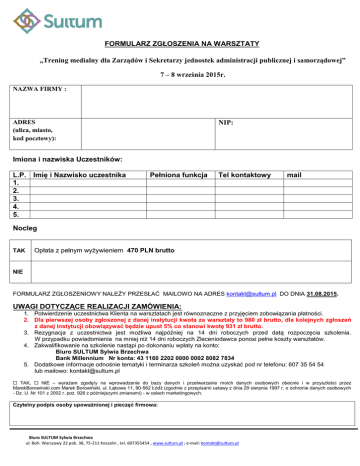 FORMULARZ ZGŁOSZENIA NA WARSZTATY „Trening medialny dla Zarządów i Sekretarzy jednostek administracji publicznej i samorządowej” 7 – 8 września 2015r. NAZWA FIRMY : ADRES (ulica, miasto, kod pocztowy): NIP: Imiona i nazwiska Uczestników: L.P. Imię i Nazwisko uczestnika 1. 2. 3. 4. 5. Pełniona funkcja Tel kontaktowy mail Nocleg TAK Opłata z pełnym wyżywieniem 470 PLN brutto NIE FORMULARZ ZGŁOSZENIOWY NALEŻY PRZESŁAĆ MAILOWO NA ADRES [email protected] DO DNIA 31.08.2015. UWAGI DOTYCZĄCE REALIZACJI ZAMÓWIENIA: 1. Potwierdzenie uczestnictwa Klienta na warsztatach jest równoznaczne z przyjęciem zobowiązania płatności. 2. Dla pierwszej osoby zgłoszonej z danej instytucji kwota za warsztaty to 980 zł brutto, dla kolejnych zgłoszeń z danej instytucji obowiązywać będzie upust 5% co stanowi kwotę 931 zł brutto. 3. Rezygnacja z uczestnictwa jest możliwa najpóźniej na 14 dni roboczych przed datą rozpoczęcia szkolenia. W przypadku powiadomienia na mniej niż 14 dni roboczych Zleceniodawca ponosi pełne koszty warsztatów. 4. Zakwalifikowanie na szkolenie nastąpi po dokonaniu wpłaty na konto: Biuro SULTUM Sylwia Brzechwa Bank Millennium Nr konta: 43 1160 2202 0000 0002 8082 7834 5. Dodatkowe informacje odnośnie tematyki i terminarza szkoleń można uzyskać pod nr telefonu: 607 35 54 54 lub mailowo: [email protected] TAK, NIE – wyrażam zgodę/y na wprowadzenie do bazy danych i przetwarzanie moich danych osobowych obecnie i w przyszłości przez MarekBorowinski.com Marek Borowiński, ul. Łąkowa 11, 90-562 Łódź (zgodnie z przepisami ustawy z dnia 29 sierpnia 1997 r. o ochronie danych osobowych - Dz. U. Nr 101 z 2002 r. poz. 926 z późniejszymi zmianami) - w celach marketingowych. Czytelny podpis osoby upoważnionej i pieczęć firmowa: Biuro SULTUM Sylwia Brzechwa ul. Boh. Warszawy 22 pok. 38, 75-211 Koszalin , tel. 607355454 , www.sultum.pl ; e-mail: [email protected] Biuro SULTUM Sylwia Brzechwa ul. Boh. Warszawy 22 pok. 38, 75-211 Koszalin , tel. 607355454 , www.sultum.pl ; e-mail: [email protected]