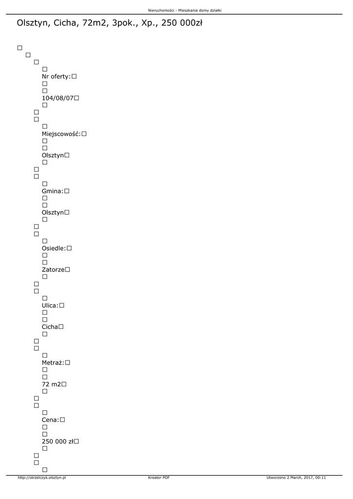 Nieruchomości - Mieszkania domy działki Olsztyn, Cicha, 72m2, 3pok., Xp., 250 000zł Nr oferty: 104/08/07 Miejscowość: Olsztyn Gmina: Olsztyn Osiedle: Zatorze Ulica: Cicha Metraż: 72 m2 Cena: 250 000 zł http://strzelczyk.olsztyn.pl Kreator PDF Utworzono 2 March, 2017, 00:11 Nieruchomości - Mieszkania domy działki Typ własności: spółdzielcze własnościowe Zabudowa: wieżowiec Surowiec: wielka płyta Piętro: X Liczba pięter: X Ilość pokoi: 3 Pow. pokoi: 25 m2; 9,5 m2; 9,5 m2 Rozkład: rozkładowe http://strzelczyk.olsztyn.pl Kreator PDF Utworzono 2 March, 2017, 00:11 Nieruchomości - Mieszkania domy działki Hałas: ciche Balkon: balkon Podłoga: parkiet Ogrzewanie: miejskie Garaż/parking: parking niestrzeżony Kuchnia: oddzielna Pow. kuchni: 10 m2 Łazienka: razemz wc http://strzelczyk.olsztyn.pl Kreator PDF Utworzono 2 March, 2017, 00:11 Nieruchomości - Mieszkania domy działki Pow. łazienki: 6 m2 Duże, rozkładowe mieszkanie w bardzo atrakcyjnej cenie. Okna plastikowe, na podłogach parkiet. Cicha i spokojna okolica, blisko komunikacja miejska. Zapraszamy. Zdjęcia http://strzelczyk.olsztyn.pl Kreator PDF Utworzono 2 March, 2017, 00:11