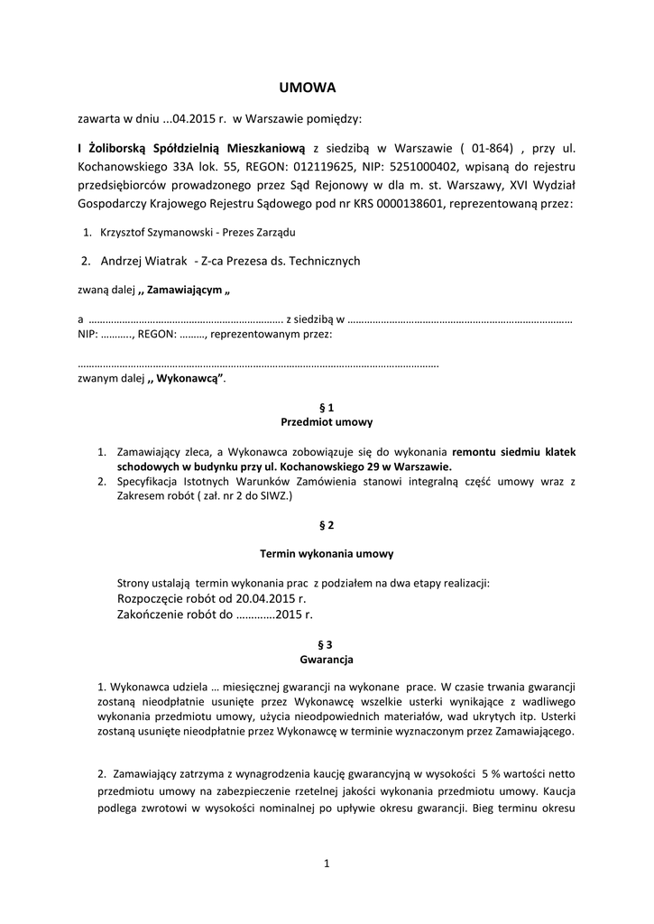 UMOWA zawarta w dniu ...04.2015 r. w Warszawie pomiędzy: I Żoliborską Spółdzielnią Mieszkaniową z siedzibą w Warszawie ( 01-864) , przy ul. Kochanowskiego 33A lok. 55, REGON: 012119625, NIP: 5251000402, wpisaną do rejestru przedsiębiorców prowadzonego przez Sąd Rejonowy w dla m. st. Warszawy, XVI Wydział Gospodarczy Krajowego Rejestru Sądowego pod nr KRS 0000138601, reprezentowaną przez: 1. Krzysztof Szymanowski - Prezes Zarządu 2. Andrzej Wiatrak - Z-ca Prezesa ds. Technicznych zwaną dalej ,, Zamawiającym „ a ……………………………………………………………. z siedzibą w ……………………………………………………………………… NIP: ……….., REGON: ………, reprezentowanym przez: …………………………………………………………………………………………………………………. zwanym dalej ,, Wykonawcą”. §1 Przedmiot umowy 1. Zamawiający zleca, a Wykonawca zobowiązuje się do wykonania remontu siedmiu klatek schodowych w budynku przy ul. Kochanowskiego 29 w Warszawie. 2. Specyfikacja Istotnych Warunków Zamówienia stanowi integralną część umowy wraz z Zakresem robót ( zał. nr 2 do SIWZ.) §2 Termin wykonania umowy Strony ustalają termin wykonania prac z podziałem na dwa etapy realizacji: Rozpoczęcie robót od 20.04.2015 r. Zakończenie robót do ………….2015 r. §3 Gwarancja 1. Wykonawca udziela … miesięcznej gwarancji na wykonane prace. W czasie trwania gwarancji zostaną nieodpłatnie usunięte przez Wykonawcę wszelkie usterki wynikające z wadliwego wykonania przedmiotu umowy, użycia nieodpowiednich materiałów, wad ukrytych itp. Usterki zostaną usunięte nieodpłatnie przez Wykonawcę w terminie wyznaczonym przez Zamawiającego. 2. Zamawiający zatrzyma z wynagrodzenia kaucję gwarancyjną w wysokości 5 % wartości netto przedmiotu umowy na zabezpieczenie rzetelnej jakości wykonania przedmiotu umowy. Kaucja podlega zwrotowi w wysokości nominalnej po upływie okresu gwarancji. Bieg terminu okresu 1 gwarancji rozpoczyna się od dnia następującego po dniu protokolarnego odbioru końcowego robót. 3. Zamawiającemu przysługuje tzw. prawo wykonania zastępczego w przypadku nieusunięcia przez Wykonawcę wad i usterek ujawnionych w okresie gwarancji bądź niewykonania pełnego zakresu przedmiotu umowy w ustalonym w umowie terminie. 4. Koszty wykonania zastępczego będą w pierwszej kolejności potrącone z zatrzymanej kaucji gwarancyjnej. W okresie gwarancji Wykonawca ma obowiązek uzupełnić kaucję gwarancyjną po potrąceniu – do pełnej wysokości. §4 Wynagrodzenie 1. Strony ustalają wynagrodzenie zgodnie z ofertą z dnia ……….2015 r. w wysokości…………… zł brutto (słownie: ………………………………….. złotych brutto). 2. Wynagrodzenie określone w ust. 1 obejmuje wszystkie koszty związane z realizacją zamówienia. 3. Roboty dodatkowe nie ujęte w kosztorysie ofertowym, niezbędne do wykonania, zatwierdzone przez na podstawie Protokołu konieczności, zostaną rozliczone wg stawek kosztorysu ofertowego. Wartość tych robót nie może przekroczyć 10% wynagrodzenia wskazanego w ust. 1. Warunkiem wykonania robót dodatkowych oraz uzupełniających zamówienie wymaga zawarcia aneksu pisemnego. 4. Wynagrodzenie płatne będzie w terminie 14 dni od daty otrzymania przez Zamawiającego faktury, wystawionej przez Wykonawcę na podstawie protokołu odbioru robót – przyjętego i podpisanego przez przedstawicieli stron. 5. Wynagrodzenie płatne będzie w dwóch fakturach częściowych przelewem na konto Wykonawcy wskazane na fakturze. Pierwsza faktura powinna obejmować swym zakresem nie mniej niż połowę realizacji zamówienia. §5 Odpowiedzialność 1. Wykonawca jest zobowiązany do wykonania prac zgodnie ze sztuką budowlaną, z obowiązującymi normami i przepisami, szczególnie bhp i ppoż, oraz z zachowaniem należytej staranności i standardów wysokiej jakości. 2. Wykonawca oświadcza, iż posiada stosowne kwalifikacje i uprawnienia niezbędne do prawidłowego wykonania przedmiotu umowy. 3. Wykonawca zobowiązuje się nie powierzać zleconych w niniejszej umowie czynności do wykonania osobom trzecim bez uprzedniej pisemnej zgody Zamawiającego. 4. Wykonawca odpowiada za wszelkie szkody wyrządzone w związku z wykonywaniem przedmiotu umowy i zobowiązuje się do ich niezwłocznego naprawienia po wezwaniu Zamawiającego. 5. Wykonawca posiada polisę ubezpieczeniową OC od ryzyka wynikającego z prowadzenia prac. 2 6. Wykonawca zobowiązuje się do prowadzenia robót objętych umową w ten sposób, aby ograniczyć do minimum uciążliwość dla użytkowników budynków, z zachowaniem przepisów bhp i ppoż. 7. Wszystkie materiały i wyroby stosowane przez Wykonawcę powinny posiadać odpowiednie atesty aprobaty lub certyfikaty wydane przez upoważnione instytucje. 8. Wykonawca oświadcza, że obejrzał miejsca wykonania i stwierdza brak przeszkód technicznych do jej wykonania. §6 1. Nadzór nad robotami ze strony Zamawiającego pełnić będzie Włodzimierz Mielewski. 2. Nadzór nad robotami ze strony Wykonawcy pełnić będzie: ………………………………………………………………………………………………………………………………… §7 Kary umowne Zamawiającemu przysługują kary umowne z tytułu niewykonania lub nienależytego wykonania przedmiotu umowy: 1. w przypadku opóźnienia w wykonaniu przedmiotu umowy - w wys. 1 % wynagrodzenia netto za każdy dzień opóźnienia po upływie terminu, określonego w § 2 nin. umowy, 2. w przypadku opóźnienia w usuwaniu usterek w okresie gwarancyjnym - wys. 1 % wynagrodzenia netto za każdy dzień opóźnienia po upływie terminu wyznaczonego przez Zamawiającego na usunięcie usterek. 3. za odstąpienie od umowy przez Wykonawcę z przyczyn nie leżących po stronie Zamawiającego, w wysokości 20 % wynagrodzenia netto.
