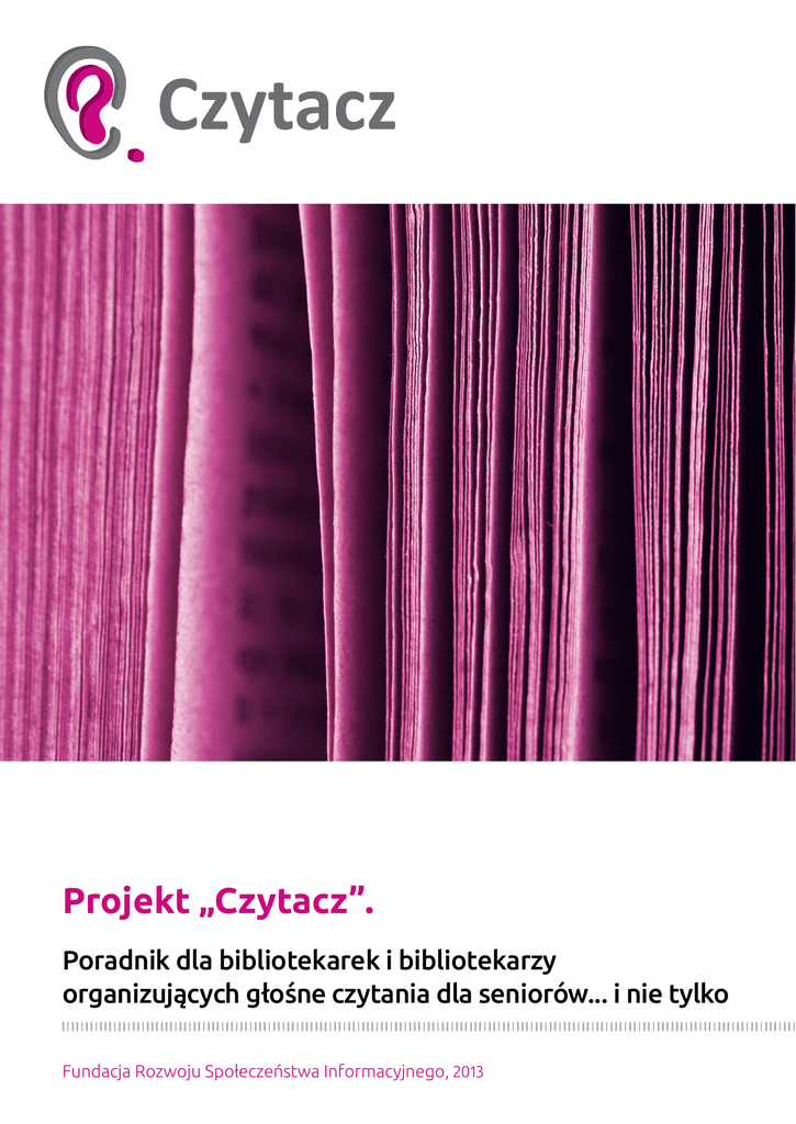 Projekt „Czytacz”. Poradnik dla bibliotekarek i bibliotekarzy organizujących głośne czytania dla seniorów... i nie tylko Fundacja Rozwoju Społeczeństwa Informacyjnego, 2013 Gdy Eulalia Barron zaczęła tracić wzrok, potrzebowała kogoś, kto czytałby jej po polsku; takie zamieściła ogłoszenie w „Village Voice”: szukam Polki, która będzie mi czytać książki. Konieczna dyspozycyjność, dobra dykcja i zamiłowanie do lektury. J. Bator, Chmurdalia Wydawnictwo WAB, Warszawa 2012, s. 196 Spis treści. 4 Jak korzystać z poradnika? 6 Wstęp. 10 Rozdział 1. Czy „Czytacz” jest dla Twojej biblioteki? 14 Rozdział 2. Głośne czytanie – różne warianty działań. 17 Rozdział 3. Współpraca z wolontariuszami. 21 Mały poradnik dla wolontariuszy. 26 Rozdział 4. Promocja wśród mieszkańców. 28 Rozdział 5. Bezpieczeństwo czytaczy i słuchaczy. 31 Rozdział 6. Sojusznicy biblioteki. 33 Rozdział 7. Katalog naszych lektur. 35 Wypowiedzi wolontariuszy. 37 Honorowi Ambasadorzy Projektu „Czytacz”. 41 Kontakt z koordynatorkami. 42 Co dalej? 43 Aneks. 3 Jak korzystać z poradnika? Znasz ludzi, którzy nie mogą przychodzić do Twojej biblioteki, ani samodzielnie czytać książek? Uważasz, że biblioteka może i powinna coś dla nich zrobić? Sądzisz, że wolontariusze lub bibliotekarze, którzy czasem zanoszą książki do domów czytelników, mogliby również poczytać im na głos? Jeśli tak, ten poradnik został napisany właśnie z myślą o Tobie! Przez dwa wakacyjne miesiące 2013 roku pięć bibliotek w Polsce pod opieką Fundacji Rozwoju Społeczeństwa Informacyjnego realizowało pilotażowy projekt „Czytacz”. Czytacze – czyli wolontariusze lub sami bibliotekarze – przynosili książki do domów starszych osób i czytali na głos. Organizowane były również głośne czytania w instytucjach: w szpitalach, w domach pomocy społecznej. Bibliotekarze namówili też najmłodszych czytelników do głośnego czytania swoim dziadkom. W poradniku znajdziesz informacje o tym: –– gdzie pomysł na głośne czytanie się sprawdził, –– od czego zacząć przygotowania, –– o czym nie można zapomnieć podczas realizacji działań, –– u kogo szukać wsparcia. Dowiesz się, jak efektywnie poprowadzić projekt „Czytacz” w Twojej bibliotece. We wstępie opisujemy, jak powstał pomysł na przeprowadzenie projektu „Czytacz” i jak przebiegała edycja pilotażowa. Pierwszy rozdział pozwoli Ci się zorientować, czy „Czytacz” jest dla Twojej biblioteki i korzystających z niej osób. Przedstawiamy tu mocne strony projektu, ale też trudności i wyzwania, jakie czekają bibliotekę podejmującą działania. Sugerujemy, jaki scenariusz działań sprawdzi się w mniejszej miejscowości, a jaki w większej. W drugim rozdziale przeczytasz o trzech różnych scenariuszach działań w ramach projektu „Czytacz”: czytaniu u słuchacza, czytaniu w instytucji oraz czytaniu rodzinnym. Wybierz scenariusz najlepszy dla Twojej biblioteki. 4 Jak korzystać z poradnika? Trzeci rozdział dotyczy współpracy z wolontariuszami. Przeczytasz w nim m.in. o zasadach dobrego wolontariatu; o dokumentach, jakie powinien przygotować bibliotekarz rozpoczynający współpracę z wolontariuszem; o ubezpieczeniu wolontariusza i o spotkaniu organizacyjnym z wolontariuszami. Czwarty rozdział pokazuje proste i skuteczne sposoby promocji akcji wśród mieszkańców. Znajdziesz tu graficzne materiały promocyjne przygotowane specjalnie na potrzeby projektu „Czytacz”. Piąty rozdział jest dla nas bardzo ważny. Dotyczy zasad bezpieczeństwa słuchaczy i wolontariuszy biorących udział w projekcie. Lektura obowiązkowa dla wszystkich bibliotekarzy i bibliotekarek odpowiedzialnych za akcję „Czytacz”. W szóstym rozdziale wskazujemy potencjalnych sojuszników biblioteki podczas realizacji projektu „Czytacz”. W siódmym rozdziale prezentujemy katalog lektur czytanych podczas akcji. Na zakończenie przedstawiamy Honorowych Ambasadorów Projektu „Czytacz” – bibliotekarzy i wolontariuszy, którzy realizowali z nami akcję w roku 2013. Na marginesach całej publikacji zamieszczamy dobre rady sformułowane przez bibliotekarzy, wolontariuszy oraz pracowników FRSI, a także wrażenia uczestników pilotażowej edycji projektu. Mamy nadzieję, że te elementy ułatwią korzystanie z poradnika. W Aneksie znajdziesz materiały, które mogą być przydatne podczas realizacji „Czytacza” lub posłużyć Ci jako wzór do zrobienia własnej wersji plakatu, identyfikatora, porozumienia z wolontariuszem, referencji dla wolontariusza etc. 5 Wstęp. Skąd pomysł na akcję „Czytacz” – opowiada Anna Klimczak Moja babcia od dawna choruje na jaskrę i zaćmę. Obie te choroby, kiedyś niezbyt dla niej uciążliwe, dziś są w zaawansowanym stadium i uniemożliwiają jej samodzielne czytanie. Osłabienie wzroku następowało stopniowo. Na początku babcia wybierała książki pisane dużym drukiem, wówczas cała rodzina pamiętała, by tylko takie babci przynosić. Czytała przez krótki czas, potem dawała odpocząć oczom. Wreszcie zupełnie przestała sięgać po książki. Dlatego, kiedy ją odwiedzam, czytam jej na głos. Babcia nie obsługuje sprzętu multimedialnego, dlatego nie korzysta z audiobooków, ale bardzo lubi, kiedy ktoś jej czyta. Tytuły czasami wybiera babcia, innym razem ja. Wiele starszych osób jest w sytuacji mojej babci, jednak nie zawsze ktoś z bliskich ma czas, żeby im poczytać. Jeśli mają w domu odtwarzacze kaset lub płyt CD, korzystają ze zbiorów książki czytanej, ale to i tak nie zastąpi kontaktu z drugim człowiekiem. A gdyby od czasu do czasu ktoś z biblioteki czytał im na głos? Z pomysłem na „Czytacza” przyszłam do Fundacji Rozwoju Społeczeństwa Informacyjnego, gdzie spotkałam ludzi otwartych na różne nietypowe inicjatywy: najpierw Magdę Kubecką, potem Małgorzatę Dąbrowską i Monikę Mieczkowską. By