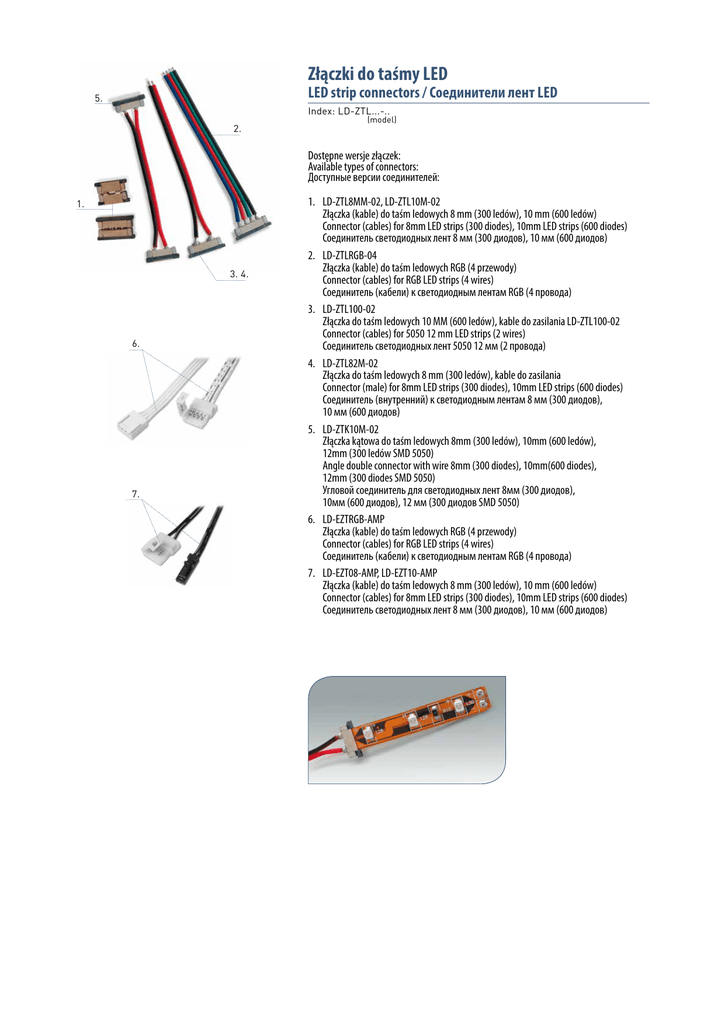 Złączki do taśmy LED LED strip connectors / Соединители лент LED 5. Index: LD-ZTL...-.. 2. (model) Dostępne wersje złączek: Available types of connectors: Доступные версии соединителей: 1. 3. 4. 6. 7. 1. LD-ZTL8MM-02, LD-ZTL10M-02 Złączka (kable) do taśm ledowych 8 mm (300 ledów), 10 mm (600 ledów) Connector (cables) for 8mm LED strips (300 diodes), 10mm LED strips (600 diodes) Соединитель светодиодных лент 8 мм (300 диодов), 10 мм (600 диодов) 2.LD-ZTLRGB-04 Złączka (kable) do taśm ledowych RGB (4 przewody) Connector (cables) for RGB LED strips (4 wires) Соединитель (кабели) к светодиодным лентам RGB (4 провода) 3.LD-ZTL100-02 Złączka do taśm ledowych 10 MM (600 ledów), kable do zasilania LD-ZTL100-02 Connector (cables) for 5050 12 mm LED strips (2 wires) Соединитель светодиодных лент 5050 12 мм (2 провода) 4.LD-ZTL82M-02 Złączka do taśm ledowych 8 mm (300 ledów), kable do zasilania Connector (male) for 8mm LED strips (300 diodes), 10mm LED strips (600 diodes) Соединитель (внутренний) к светодиодным лентам 8 мм (300 диодов), 10 мм (600 диодов) 5.LD-ZTK10M-02 Złączka kątowa do taśm ledowych 8mm (300 ledów), 10mm (600 ledów), 12mm (300 ledów SMD 5050) Angle double connector with wire 8mm (300 diodes), 10mm(600 diodes), 12mm (300 diodes SMD 5050) Угловой соединитель для светодиодных лент 8мм (300 диодов), 10мм (600 диодов), 12 мм (300 диодов SMD 5050) 6.LD-EZTRGB-AMP Złączka (kable) do taśm ledowych RGB (4 przewody) Connector (cables) for RGB LED strips (4 wires) Соединитель (кабели) к светодиодным лентам RGB (4 провода) 7. LD-EZT08-AMP, LD-EZT10-AMP Złączka (kable) do taśm ledowych 8 mm (300 ledów), 10 mm (600 ledów) Connector (cables) for 8mm LED strips (300 diodes), 10mm LED strips (600 diodes) Соединитель светодиодных лент 8 мм (300 диодов), 10 мм (600 диодов)