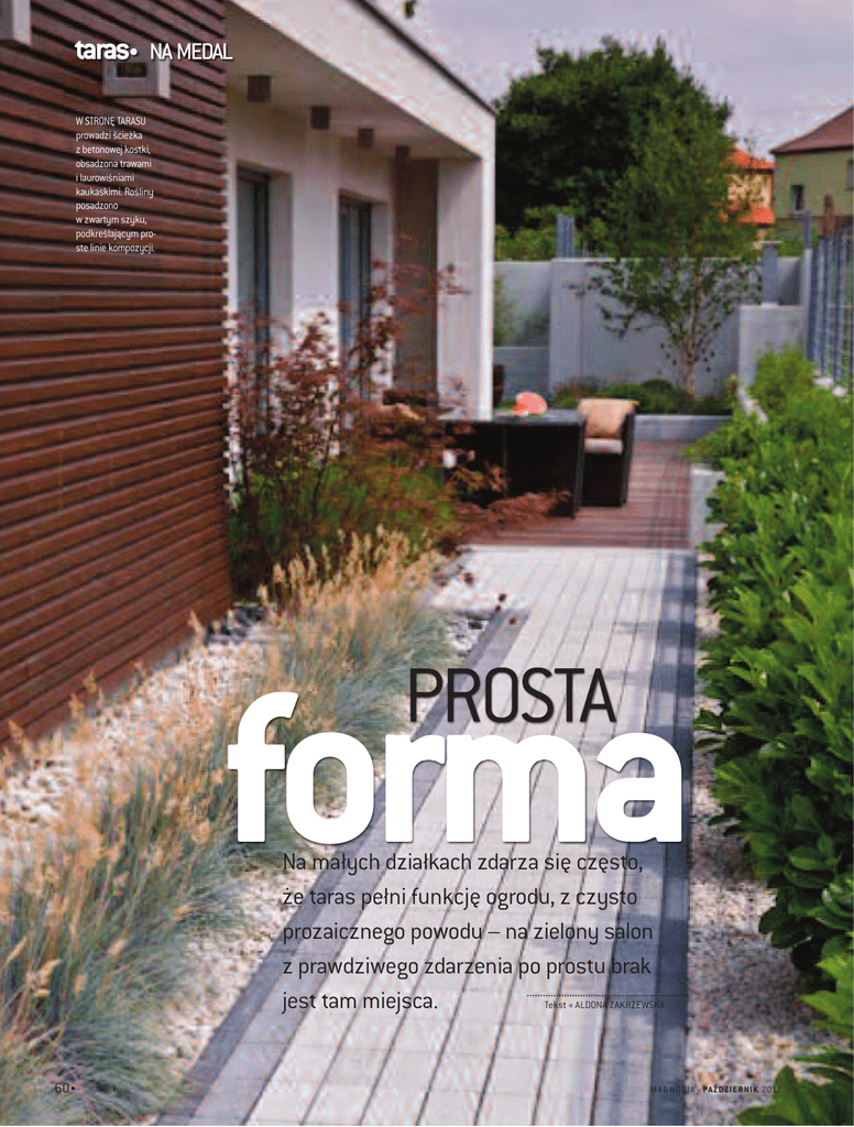 taras. NA MEDAL W STRONĘ TARASU prowadzi ścieżka z betonowej kostki, obsadzona trawami i laurowiśniami kaukaskimi. Rośliny posadzono w zwartym szyku, podkreślającym proste linie kompozycji. PROSTA forma Na małych działkach zdarza się często, że taras pełni funkcję ogrodu, z czysto prozaicznego powodu – na zielony salon z prawdziwego zdarzenia po prostu brak Tekst ALDONA ZAKRZEWSKA jest tam miejsca. 60 . . M A G N O L I A PA Ź D ZIE R NIK 2012 TAK BYŁO TU I ÓWDZIE W ŻWIRZE wyrastają czerwonobrązowe źdźbła trawy ozdobnej rozplenicy, ładnie kontrastujące z jasnym kruszywem. PRZED REALIZACJĄ PROJEKTU na działce królowała nieco surowa nowoczesna bryła domu i betonowo-metalowe ogrodzenie. KĄCIK DO GRILLOWANIA – tuż obok efektowna kompozycja z kulkami bukszpanów, trawami ozdobnymi, lawendą, czosnkami i młodą brzózką. Fot. Tomasz Ciesielski S tworzenie ogrodu na działce, której właściciele... ŻYCZENIA WŁAŚCICIELI nie lubią zieleni, a do tego jest mała, to nie lada Kiedy architektka Agata Kika-Wróblewska przybyła wyzwanie. Ale i na to jest sposób; wystarczy urzątu po raz pierwszy, ujrzała typowy pobudowlany nieudzić ogród na tarasie i w jego najbliższym otoczeniu, żytek z domem o nowoczesnej bryle w centrum. Budysadząc w nim jak najmniej roślin, oczywiście ła– nieadekwatny do gabarytów działki – mocno Czy wiesz, że... nekzdominował twych w uprawie. Tak właśnie poradziła sobie przestrzeń. z podobnym problemem projektantka ogrodu na Ponadto nieco sielski krajobraz najbliższej okoProjektanci nowoczenych tarasie (położonym na poziomie parteru), przy licy nie pasował do nowoczesnej bryły domu ogrodów lubią zaskakiwać budynku jednorodzinnym jednego ze szczeciń- kontrastem, np. zestawiają roś- i upodobań właścicieli, kochających minimaliskich osiedli. Działka ma zaledwie 400 m2. Nic liny o mocnych kształtach ze styczne klimaty. Na szczęście działka otoczona zodziwnego więc, że po wzniesieniu domu niewiestała przez dewelopera wysokim betonowo-stalozwiewnymi źdźbłami traw. le pozostało miejsca dla roślin (ok. 80 m2) wym ogrodzeniem, odcinającym ją od zewnętrzne- Ý W W W. E - O G R O D Y. P L 61 . taras. NA MEDAL go pejzażu.Wysoki ekran zapewniał kameralność, dzięki niemu ogród mógł się stać wewnętrznym, prywatnym krajobrazem właścicieli. Życzeniem gospodarzy było stworzenie na tarasie oraz w jego najbliższym otoczeniu prostego kompozycyjnie i uporządkowanego ogrodu, ze smaczkami w stylu śródziemnomorskim i angielskim. Co ciekawe, pragnęli zabudować jak najwięcej przestrzeni, jak najmniej przeznaczając jej dla roślin! Aranżacja zielonego wnętrza miała harmonizować z minimalistyczną bryłą domu, a materiały wykończeniowe: żwir, drewno egzotyczne i beton – nawiązywać do jego elewacji. NIECO POTARGANE KĘPY MISKANTÓW łagodzą kanty surowej kompozycji, dodają jej lekkości i uroku. WIDOK OGÓLNY TARASU. Na posadzce z drewna egzotycznego ustawiono nowoczesne meble z praktycznego technoratanu. DLA KAŻDEGO COŚ MIŁEGO Projektowana przestrzeń miała zaspokoić potrzeby wszystkich członków rodziny. Projektantka wyodrębniła więc na działce kilka wnętrz – pokoi, przydzielając im różne funkcje. Taras z drewnianą posadzką, nieco obniżony względem reszty terenu i otoczony betonowymi donicami, stał się strefą wypoczynku. Ale nie tylko. Ponieważ zaplanowano na nim również grill, w pogodne dni pełni on też funkcję jadalni i letniej kuchni. Część tarasu zajmuje trawnik – idealne miejsce do zabawy. Tuż obok wydzielono kącik gospodarczy, z miejscem na drewno EKSPERT RADZI AGATA KIKA-WÓBLEWSKA, architekt krajobrazu, Green Fingers, www.greenfingers.pl 62 . Jak stworzyć minimalistyczną kompozycję? Przede wszystkim należy zadbać o ład funkcjonalny, przestrzenny i proste linie. Decydując się na materiały wykończeniowe wybierajmy beton, kamień, żwir, drewno. Nowoczesny wygląd zapewniają nawierzchnie z geometrycznych (najlepiej dużych) elementów, proste detale i meble, często z tworzywa sztucznego lub metalu. Starajmy się, by kompozycja była monochromatyczna, choć czasami warto zagrać mocnym kolorem ścianki, ekranu czy donic. Pielęgnacja takiego ogrodu ma zajmować jak najmniej czasu. Zamiast trawnika często pojawiają się więc żwirowe placyki lub utwardzone nawierzchnie. . M A G N O L I A PA Ź D ZIE R NIK 2012 Na małej przestrzeni niezwykle ważne są detale, bo wszystko ogląda się tutaj z bliska. Odpowiedni dobór elementów (donic, lamp, mebli) i perfekcyjne wykończenia są więc kluczem do sukcesu. Małą przestrzeń na ogół widać jak na dłoni, da się ją ogarnąć jednym spojrzeniem. Dlatego wszystkie elementy powinny byc spójne i dobrze dopasowane: nawierzchnie i detale współgrać z elewacją domu, a rośliny być ich kompozycyjnym dopełnieniem. do kominka, rowery, narzędzia niezbędne do pielęgnacji roślin i wszelkie przydatne drobiazgi. W efekcie na tarasie i w jego najbliższym otoczeniu powstał efektowny ogródek, prosty w formie, kolorystyce i w doborze gatunków. Dużo tutaj ozdobnych traw, lawendy i formowanych w kule bukszpanów. Kolorowym, przyciągającym wzrok akcentem jest dorodny klon o bordowych liściach. W wielu miejscach beton walczy o prymat z romantyczną lawendą i zwiewnymi źdźbłami traw, dzięki którym kompozycja – mimo że minimalistyczna – pełna jest zapachów i szelestów, często odwiedzają ją ptaki i motyle. Nic dziwnego więc, że gospodarze szybko zaczęli doceniać jej urok, a taras stał się ich ulubionym miejscem do relaksu. W W W. E - O G R O D Y. P L 63 .