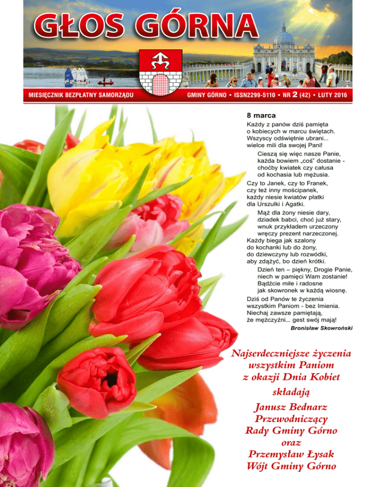 GŁOS GÓRNA MIESIĘCZNIK BEZPŁATNY SAMORZĄDU GMINY GÓRNO • ISSN2299-5110 • NR 2 (42) • LUTY 2016 8 marca Każdy z panów dziś pamięta o kobiecych w marcu świętach. Wszyscy odświętnie ubrani... wielce mili dla swojej Pani! Cieszą się więc nasze Panie, każda bowiem „coś” dostanie choćby kwiatek czy całusa od kochasia lub mężusia. Czy to Janek, czy to Franek, czy też inny mościpanek, każdy niesie kwiatów płatki dla Urszulki i Agatki. Mąż dla żony niesie dary, dziadek babci, choć już stary, wnuk przykładem urzeczony wręczy prezent narzeczonej. Każdy biega jak szalony do kochanki lub do żony, do dziewczyny lub rozwódki, aby zdążyć, bo dzień krótki. Dzień ten – piękny, Drogie Panie, niech w pamięci Wam zostanie! Bądźcie miłe i radosne jak skowronek w każdą wiosnę. Dziś od Panów te życzenia wszystkim Paniom - bez Imienia. Niechaj zawsze pamiętają, że mężczyźni... gest swój mają! Bronisław Skowroński Najserdeczniejsze życzenia wszystkim Paniom z okazji Dnia Kobiet składają Janusz Bednarz Przewodniczący Rady Gminy Górno oraz Przemysław Łysak Wójt Gminy Górno ODSZEDŁ NA WIECZNĄ SŁUŻBĘ 9 lutego 2016 roku pożegnaliśmy Pana Władysława Stąpora z Radlina, w okresie II wojny światowej żołnierza Armii Krajowej. Po wojnie działacza ZBOWiD, a od 1990 roku Związku Kombatantów RP. Pan Władysław należał do Armii Krajowej od 31 grudnia 1943 roku. Podlegał rozkazom słynnego „Jacka” Jana Kosińskiego - komendanta AK na gminy Górno, Bodzentyn, Nowa Słupia. Pan Władysław odznaczony został między innymi: Krzyżem Kawalerskim Orderu Odrodzenia Polski, Srebrnym i Brązowym Krzyżem Zasługi, Medalem Zwycięstwa i Wolności, a także odznaką „Za Zasługi dla Kielecczyzny”. W opinii Zdzisława Dobruta - członka Zarządu Wojewódzkiego Związku Kombatantów RP, Władysław Stąpór dał się poznać jako wyróżniający działacz Związku Kombatantów, pełniąc przez wiele lat funkcje skarbnika Koła w Górnie. W uroczystościach pogrzebowych, które odbyły się 9 lutego wzięli udział wójt gminy Przemysław Łysak oraz przewodniczący Rady Gminy Janusz Bednarz. W ostatniej drodze Władysławowi Stąporowi towarzyszył także dyrektor wraz z delegacją uczniów szkoły w Radlinie. Władysław Stąpór przez wiele lat pracował w tej placówce oświatowej. - Pan Stąpór zawsze dbał o sztandar kombatantów, aby był czysty i zadbany, interesował się mogiłami na cmentarzu, pomnikami będącymi na terenie gminy, organizował spotkania kombatantów i uczestniczył w uroczystościach patriotycznych. Często przychodził do urzędu, rozmawiał, doradzał. Jego śmierć to duża strata - mówi wójt Górna Przemysław Łysak. UWAGA ROLNICY! Producentom świń i mleka, którzy w Agencji Rynku Rolnego będą ubiegać się o nadzwyczajne wsparcie w sektorze mleka i wieprzowiny, przypominamy o obowiązku aktualizacji danych posiadaczy zwierząt oraz zgłoszeń zwierząt w Agencji Restrukturyzacji i Modernizacji Rolnictwa. Agencja Rynku Rolnego będzie udzielała pomocy dla rolników w sektorach hodowlanych, m.in. na podstawie danych z systemu Identyfikacji i Rejestracji Zwierząt prowadzonego przez ARiMR. Składanie wniosków rozpoczęło się 18 lutego i potrwa do 18 marca 2016 r. Producenci mleka i świń będą mogli je składać w Oddziale Terenowym Agencji Rynku Rolnego, właściwym dla miejsca zamieszkania lub siedziby producenta lub wysłać pocztą. O terminie złożenia wysłanego wniosku będzie decydowała data stempla pocztowego. Więcej informacji na ten temat oraz niezbędne dokumenty można znaleźć na stronie internetowej Agencji Rynku Rolnego: www.arr.gov.pl. Najwyższy przyrost naturalny w regionie J esteśmy gminą, w której w 2015 roku urodziło się najwięcej dzieci w całym województwie. Także liczba mieszkańców systematycznie u nas rośnie. Świętokrzyskie stoi przed wielkim demograficznym kryzysem. Jak szacują analitycy Głównego Urzędu Statystycznego w ciągu najbliższych dziesięciu lat nasze województwo wyludni się o 200 tysięcy osób. Tylko w ciągu ostatniego roku w stolicy województwa ubyło ponad półtora tysiąca mieszkańców. Na szczęście problem wyludniania nie dotyczy gminy Górno. W 2015 roku urodziło się tu 162 dzieci. Zmarło zaś 100 osób. - Mamy najwyższy przyrost naturalny spośród wszystkich gmin powiatu kieleckiego – mówi Przemysław Łysak, wójt Górna. Także liczba mieszkańców od czterech lat systematycznie rośnie. Na koniec grudnia 2015 przekroczyła pułap 14 tysięcy mieszkańców. To spory sukces, którym nie wszyscy wójtowie czy burmistrzowie mogą się pochwalić. Dla przykładu w sąsiednim Bodzentynie liczba mieszkańców z prawie 12 tys. w 2002 roku spadła do 11.632 na koniec 2015 roku. Zdaniem naszego wójta pozytywna tendencja demograficzna to efekt działań, jakie od lat podejmowane są na rzecz poprawy jakości życia mieszkańców. - Mamy bardzo dobrą oświatę, o czym świadczą wyniki na egzaminach końcowych uczniów podstawówek. Posiadamy zabezpieczenie przedszkolne dla wszystkich dzieci z terenu gminy, a w niedalekiej przyszłości planujemy także wybudować żłobek. Mamy bardzo dobrze działającą publiczną służbę zdrowia, jedne z najniższych cen za wodę, odprowadzanie ścieków i wywóz śmieci w powiecie kieleckim. Jesteśmy także gminą atrakcyjną dla osób pragnących wybudować dom, o czym świadczy liczba pozwoleń na budowę – wymienia wójt Przemysław Łysak. Nasz rozmówca dodaje także, że od lat kładzie wysoki nacisk na to, by urząd był przyjazny mieszkańcom, a obsługa petentów na wysokim poziomie. BEZPŁATNE BADANIA DLA PAŃ Cytomammobus po raz kolejny przyjedzie do naszej gminy. Specjalny pojazd przystosowany do wykonywania badań cytologicznych i mammograficznych stacjonował będzie 29 lutego, w poniedziałek, w Górnie koło ośrodka zdrowia oraz 1 marca obok przychod