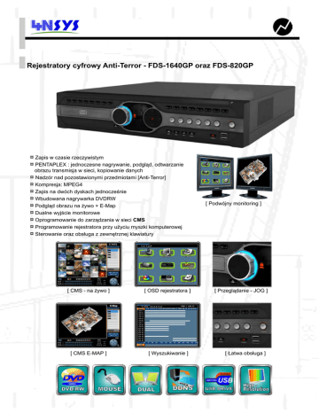 Rejestratory cyfrowy Anti-Terror - FDS-1640GP oraz FDS-820GP ¤ Zapis w czasie rzeczywistym ¤ PENTAPLEX : jednoczesne nagrywanie, podgląd, odtwarzanie obrazu transmisja w sieci, kopiowanie danych ¤ Nadzór nad pozostawionymi przedmiotami [Anti-Terror] ¤ Kompresja: MPEG4 ¤ Zapis na dwóch dyskach jednocześnie ¤ Wbudowana nagrywarka DVDRW ¤ Podgląd obrazu na żywo + E-Map ¤ Dualne wyjście monitorowe ¤ Oprogramowanie do zarządzania w sieci CMS ¤ Programowanie rejestratora przy użyciu myszki komputerowej ¤ Sterowanie oraz obsługa z zewnętrznej klawiatury [ CMS - na żywo ] [ OSD rejestratora ] [ CMS E-MAP ] [ Wyszukiwanie ] [ Podwójny monitoring ] [ Przeglądanie - JOG ] [ Łatwa obsługa ] Dane Techniczne FDS-1640GP Model FDS-820GP Kompresja obrazu MPEG-4 System operacyjny Linux Wielozadaniowość Pentaplex: jednoczesna rejestracja, wyświetlanie, odtwarzanie, transmisja sieciowa i tworzenie kopii zapasowych (Backup) Wejścia wizyjne Przelotowe wyjścia wizyjne 16 wejść CVBS (BNC) 1Vpp, 75Ω 8 wejść CVBS (BNC) 1Vpp, 75Ω 16 autoterminacja 16 autoterminacja Wyjścia monitorowe 2 Główne, 2 VGA oraz 1 Spot Wejścia audio 16 wejść, 1,5Vpp (RCA) 8 wejść, 1,5Vpp (RCA) Wyjścia audio 16 wyjścia, 1,5Vpp (RCA), możliwość transmisji dźwięku w sieciach LAN/WAN 8 wyjść, 1,5Vpp (RCA), możliwość transmisji dźwięku w sieciach LAN/WAN 16 (maksymalnie 128) 8 (maksymalnie 128) 16 8 Wejścia alarmowe Wyjścia alarmowe Max. 3 x 1,8TB S-ATA II + wyjście S-ATA w tylnej części obudowy Dostępne pojemności wewn. HDD Wbudowana nagrywarka DVD-RW Standardowo na wyposażeniu USB, dwa porty na panelu przednim, jeden w tylnej części obudowy Kontroler USB Interfejs Ethernet 10/100Mbit/s Sposoby wyświetlania obrazu Tryby rejestracji FULL, 1+1 w pionie, 4, 7, 8, 9, 10, 13 i 16 obrazów, sekwencja kamer Ciągła (zgodnie z harmonogramem), wyzwalana wyjściem alarmowym, wyzwalana detekcją ruchu Odświeżanie obrazu ‘’na żywo’’ 25kl./s dla każdej z kamer i dla każdego pola ekranu podzielonego, niezależnie od wybranego formatu podziału ekranu Rozdzielczość obrazu „na żywo” 720 x 576 Rozdzielczość zapisu 720 x 576 Maksymalna całkowita prędkość rejestracji 400kl./s Sterowanie PTZ 200kl./s Wbudowany port RS-232, RS485 Pelco D, Samsung Pelco D, Bosch, Panasonic itd. Oprogramowanie sieciowe (polskie) Ochrona danych CMS, w cenie rejestratora, Blokada usuwania materiału video z poziomu sieci, hasła, zróżnicowane poziomy użytkowników Podpis cyfrowy ‘’znak wodny’’ Tak Napięcie zasilania 230V AC Wymiary [mm] (szer. x głęb. x wys.) 435 x 440 x 89 Dystrybucja Tecnocom s.c. Monitor Spot Monitor nr 1 Klawiatura Zewnętrzne HDD VGA nr 1 Kamery PTZ 8~16 Kamery CCD standard Wejścia wideo: 8~16 Monitor nr 2 Wyjścia alarmowe 8~16 Ethernet Wejścia audio 8~16 VGA nr 2 Wejścia alarmowe 8~16 Wyjścia audio 8~16 Pilot IR Dołożono wszelkich starań aby wszystkie informacje były poprawne i aktualne. Jednak nasze wyroby podlegają ciągłemu doskonaleniu i dlatego zastrzegamy sobie prawo zmian danych technicznych bez uprzedniego powiadomienia.