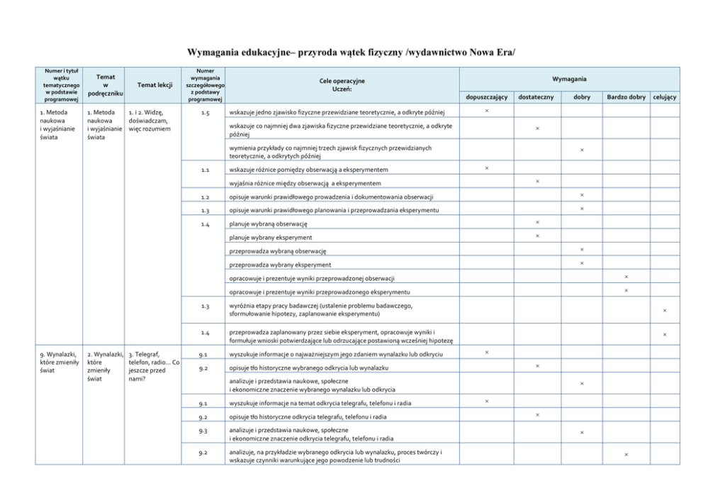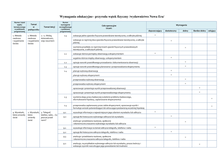 Wymagania edukacyjne– przyroda w tek fizyczny /wydawnictwo Nowa Era/ Numer i tytuł wątku tematycznego w podstawie programowej 1. Metoda naukowa i wyjaśnianie świata Temat w podręczniku Temat lekcji 1. Metoda i Widzę naukowa doświadczam i wyjaśnianie więc rozumiem świata Numer wymagania szczegółowego z podstawy programowej 1.5 Wymagania Cele operacyjne Uczeń dopuszczający wskazuje jedno zjawisko fizyczne przewidziane teoretycznie a odkryte pó niej dostateczny wyjaśnia ró nice między obserwacją a eksperymentem 9. Wynalazki, które zmieniły świat 2. Wynalazki, które zmieniły świat 3. Telegraf, telefon radio jeszcze przed nami? Co celujący wymienia przykłady co najmniej trzech zjawisk fizycznych przewidzianych teoretycznie, a odkrytych pó niej wskazuje ró nice pomiędzy obserwacją a eksperymentem Bardzo dobry wskazuje co najmniej dwa zjawiska fizyczne przewidziane teoretycznie, a odkryte pó niej 1.1 dobry 1.2 opisuje warunki prawidłowego prowadzenia i dokumentowania obserwacji 1.3 opisuje warunki prawidłowego planowania i przeprowadzania eksperymentu 1.4 planuje wybraną obserwację planuje wybrany eksperyment przeprowadza wybraną obserwację przeprowadza wybrany eksperyment opracowuje i prezentuje wyniki przeprowadzonej obserwacji opracowuje i prezentuje wyniki przeprowadzonego eksperymentu 1.3 wyró nia etapy pracy badawczej ustalenie problemu badawczego sformułowanie hipotezy zaplanowanie eksperymentu 1.4 przeprowadza zaplanowany przez siebie eksperyment, opracowuje wyniki i formułuje wnioski potwierdzające lub odrzucające postawioną wcześniej hipotezę 9.1 wyszukuje informacje o najwa niejszym jego zdaniem wynalazku lub odkryciu 9.2 opisuje tło historyczne wybranego odkrycia lub wynalazku analizuje i przedstawia naukowe społeczne i ekonomiczne znaczenie wybranego wynalazku lub odkrycia 9.1 wyszukuje informacje na temat odkrycia telegrafu, telefonu i radia 9.2 opisuje tło historyczne odkrycia telegrafu telefonu i radia 9.3 analizuje i przedstawia naukowe społeczne i ekonomiczne znaczenie odkrycia telegrafu, telefonu i radia 9.2 analizuje na przykładzie wybranego odkrycia lub wynalazku proces twórczy i wskazuje czynniki warunkujące jego powodzenie lub trudności Wymagania edukacyjne– przyroda w tek fizyczny /wydawnictwo Nowa Era/ analizuje na przykładzie wynalezienia telefonu telegrafu lub radia proces twórczy i wskazuje czynniki warunkujące jego powodzenie lub trudności 9.1 wyszukuje informacje dotyczące historii radia i telewizji analizuje i selekcjonuje informacje dotyczące historii radia i telewizji przygotowuje prezentację multimedialną dotyczącą historii radia i telewizji 9.3 4. Od turbiny Herona z Aleksandrii do wysoko wydajnych silników cieplnych i elektrycznych 9.1 3. Energia i Czy słowo od Słońca do światło zawsze arówki oznacza to samo? przeprowadza wywód myślowy o tym e wynalazki tworzą wynalazki i popiera go przykładami uczestniczy w tematycznej burzy mózgów wyszukuje wiadomości dotyczące silników parowych spalinowych i elektrycznych analizuje i selekcjonuje informacje dotyczące budowy i zasady działania silników parowych, spalinowych i elektrycznych analizuje historię odkryć dotyczących silników i wskazuje ich logiczny ciąg oraz przedstawia czynniki historyczne warunkujące rozwój tej dziedziny techniki 9.1 analizuje budowę i zasadę działania silników ró nego typu a następnie wskazuje obszary ich najbardziej ekonomicznego wykorzystania; uzasadnia swoje zdanie przygotowuje prezentację multimedialną dotyczącą budowy i zasady działania silników parowych spalinowych i elektrycznych 10.1 analizuje czynniki przyrodnicze środowiska i wskazuje jego zdaniem prawidłowy kierunek rozwoju nauki związanej z napędami wykorzystywanymi w przemyśle uczestniczy w tworzeniu tematycznej mapy mentalnej wyszukuje wiadomości o termicznych i nietermicznych ródłach światła analizuje i selekcjonuje zdobyte wiadomości o termicznych i nietermicznych ródłach światła opisuje widma światła pochodzącego z ró nych ródeł analizuje widma światła pochodzącego z ró nych ródeł a następnie wykazuje podobieństwa i ró nice między nimi 10.7 przygotowuje i przedstawia wiadomości dotyczące cech charakterystycznych energii słonecznej 10.1 przygotowuje prezentację multimedialną dotyczącą podobieństw światła lasera i światła arówki oraz ró nic między nimi analizuje treść artykułu dotyczącego budowy i działania domowego spektroskopu kieruje pracą grupy tworzącej model spektroskopu i wykonującej doświadczenia uczestniczy w tematycznej burzy mózgów 9.2 9.2 10. Energia od Słońca do arówki wskazuje czynniki wpływające na rozwój współczesnej nauki i technologii Wymagania edukacyjne– przyroda w tek fizyczny /wydawnictwo Nowa Era/ 13. Technologie współczesne i przyszłości 19. Cykle, rytmy i czas 4. Technologie współczesne i przyszłości 5. Cykle, rytmy i czas 7. i 8. Wizje, czyli jak nauka zmieni świat w XX) wieku Czy naprawdę yjemy coraz szybciej? 13.5 wyszukuje wiadomości o półprzewodnikach diodach tranzystorach ciekłych kryształach lub nadprzewodnikach do wyboru analizuje i selekcjonuje wiadomości dotyczące elementów współczesnej elektroniki 13.1 analizuje i selekcjonuje informacje dotyczące zmian właściwości ciekłych kryształów pod wpływem pola elektrycznego 13.5 wyszukuje w internecie i przedstawia na lekcji filmy ukazujące świat elektroniki w XXI wieku; komentuje prezentowane zjawiska przygotowuje i przedstawia prezentację multimedialną dotyczącą elementów współczesnej elektroniki 13.1 przygotowuje i przedstawia prezentację multimedialną dotyczącą ciekłych kryształów i zmian ich właściwości pod wpływem pola elektrycznego 13.5 wyszukuje analizuje i prezentuje informacje dotyczące nanotechnologii wyjaśnia znaczenie dwóch nagród R P Feynmana wyznaczonych przez uczonego w czasie słynnego wykładu pt Na dole jest jesz