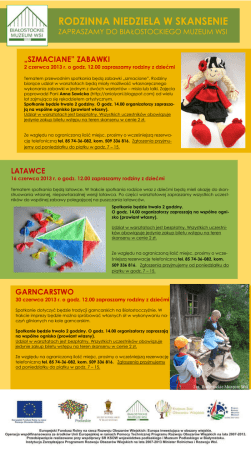 RODZINNA NIEDZIELA W SKANSENIE ZAPRASZAMY DO BIAŁOSTOCKIEGO MUZEUM WSI „SZMACIANE” ZABAWKI 2 czerwca 2013 r. o godz. 12.00 zapraszamy rodziny z dziećmi Tematem przewodnim spotkania będą zabawki „szmaciane”. Rodziny biorące udział w warsztatach będą miały możliwość własnoręcznego wykonania zabawki w jednym z dwóch wariantów – misia lub lalki. Zajęcia poprowadzi Pani Anna Sawicka (http://aniolyani.blogspot.com) od wielu lat zajmująca się rękodziełem artystycznym. Spotkanie będzie trwało 2 godziny. O godz. 14.00 organizatorzy zapraszają na wspólne ognisko (prowiant własny). Udział w warsztatach jest bezpłatny. Wszystkich uczestników obowiązuje jedynie zakup biletu wstępu na teren skansenu w cenie 2 zł. Ze względu na ograniczoną ilość miejsc, prosimy o wcześniejszą rezerwację telefoniczną tel. 85 74-36-082, kom. 509 336 816. Zgłoszenia przyjmujemy od poniedziałku do piątku w godz. 7 – 15. LATAWCE 16 czerwca 2013 r. o godz. 12.00 zapraszamy rodziny z dziećmi Tematem spotkania będą latawce. W trakcie spotkania rodzice wraz z dziećmi będą mieli okazję do skonstruowania własnej, niepowtarzalnej wersji latawca. Po części warsztatowej zapraszamy wszystkich uczestników do wspólnej zabawy polegającej na puszczania latawców. Spotkanie będzie trwało 2 godziny. O godz. 14.00 organizatorzy zapraszają na wspólne ognisko (prowiant własny). Udział w warsztatach jest bezpłatny. Wszystkich uczestników obowiązuje jedynie zakup biletu wstępu na teren skansenu w cenie 2 zł. Ze względu na ograniczoną ilość miejsc, prosimy o wcześniejszą rezerwację telefoniczną tel. 85 74-36-082, kom. 509 336 816. Zgłoszenia przyjmujemy od poniedziałku do piątku w godz. 7 – 15. GARNCARSTWO 30 czerwca 2013 r. o godz. 12.00 zapraszamy rodziny z dziećmi Spotkanie dotyczyć będzie tradycji garncarskich na Białostocczyźnie. W trakcie imprezy będzie można spróbować własnych sił w wykonywaniu naczyń glinianych na kole garncarskim. Spotkanie będzie trwało 2 godziny. O godz. 14.00 organizatorzy zapraszają na wspólne ognisko (prowiant własny). Udział w warsztatach jest bezpłatny. Wszystkich uczestników obowiązuje jedynie zakup biletu wstępu na teren skansenu w cenie 2 zł. Ze względu na ograniczoną ilość miejsc, prosimy o wcześniejszą rezerwację telefoniczną tel. 85 74-36-082, kom. 509 336 816. Zgłoszenia przyjmujemy od poniedziałku do piątku w godz. 7 – 15.