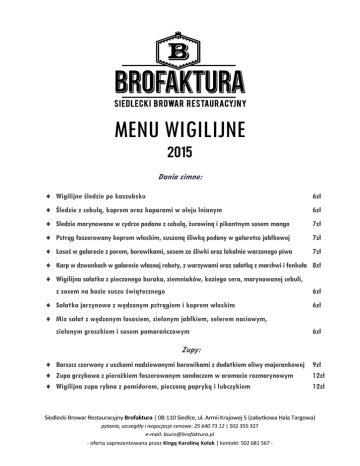 MENU WIGILIJNE 2015 Dania zimne: Wigilijne śledzie po kaszubsku 6zł Śledzie z cebulą, koprem oraz kaparami w oleju lnianym 6zł Sledzie marynowane w cydrze podane z cebulą, żurawiną i pikantnym sosem mango 7zł Pstrąg faszerowany koprem włoskim, suszoną śliwką podany w galaretce jabłkowej 7zł Łosoś w galarecie z porem, borowikami, sosem ze śliwki oraz lokalnie warzonego piwa 7zł Karp w dzwonkach w galarecie własnej roboty, z warzywami oraz sałatką z marchwi i fenkuła 8zł Wigilijna sałatka z pieczonego buraka, ziemniaków, koziego sera, marynowanej cebuli, z sosem na bazie suszu świątecznego 6zł Sałatka jarzynowa z wędzonym pstrągiem i koprem włoskim 6zł Mix sałat z wędzonym łososiem, zielonym jabłkiem, selerem naciowym, zielonym groszkiem i sosem pomarańczowym 6zł Zupy: Barszcz czerwony z uszkami nadziewanymi borowikami z dodatkiem oliwy majerankowej 9zł Zupa grzybowa z pierożkiem faszerowanym sandaczem w aromacie rozmarynowym 12zł Wigilijna zupa rybna z pomidorem, pieczoną papryką i lubczykiem 12zł Siedlecki Browar Restauracyjny Brofaktura | 08-110 Siedlce, ul. Armii Krajowej 5 (zabytkowa Hala Targowa) pytania, szczegóły i negocjacje cenowe: 25 640 73 12 | 502 355 327 e-mail: [email protected] - oferta zaprezentowana przez Kingę Karolinę Kołak | kontakt: 502 681 567 - Dania główne: Polędwiczka z dorsza podana z kopytkami z majerankiem, sos piwny z anyżem, sałatka z kopru włoskiego, marchwi i zielonych jabłek Pieczony łosoś serwowany z pęczakiem z burakami i sosem parmezanowym 32zł 34zł Sandacz z borowikami z dodatkiem warzyw pieczonych w miodzie i szpinakiem przygotowanym na maśle 41zł Filet z karpia z pieczonymi ziemniakami, karmelizowanymi burakami i sosem chrzanowym 38zł Pierogi z kapustą i grzybami podane z okrasą z cebuli i oleju lnianego 24zł Udko z kaczki na puree z jabłek i chrzanu podane ze śliwkami gotowanymi w Starce 29zł Pierogi z pstrąga i sandacza z rodzynkami oraz sosem tymiankowo-maślankowym 26zł Desery: Szarlotka razowa z jabłkiem i bakaliami podana z sosem cynamonowym 11zł Strucla z makiem i bakaliami 7zł Racuchy jabłkowe z orzechami i cukrem pudrem 7zł Kluski z makiem, miodem i bakaliami 6zł Do każdego zamówienia przygotowujemy nasz kompot wigilijny. Zamówienia przyjmujemy i realizujemy z kilkudniowym wyprzedzeniem. Siedlecki Browar Restauracyjny Brofaktura | 08-110 Siedlce, ul. Armii Krajowej 5 (zabytkowa Hala Targowa) pytania, szczegóły i negocjacje cenowe: 25 640 73 12 | 502 355 327 e-mail: [email protected] - oferta zaprezentowana przez Kingę Karolinę Kołak | kontakt: 502 681 567 -
