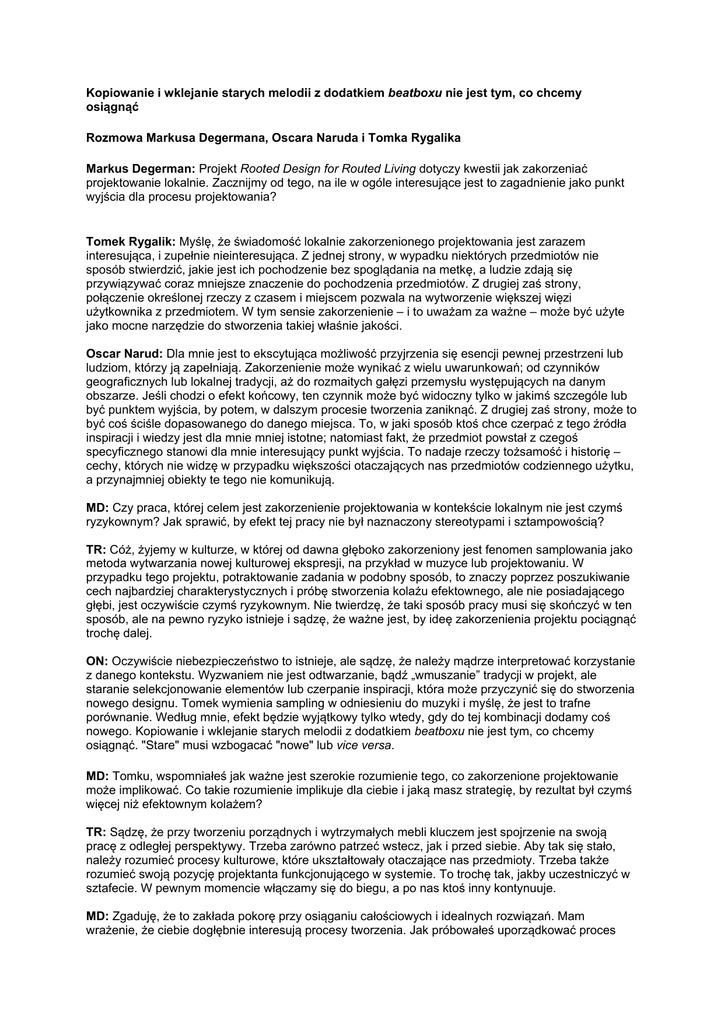 Kopiowanie i wklejanie starych melodii z dodatkiem beatboxu nie jest tym, co chcemy osiągnąć Rozmowa Markusa Degermana, Oscara Naruda i Tomka Rygalika Markus Degerman: Projekt Rooted Design for Routed Living dotyczy kwestii jak zakorzeniać projektowanie lokalnie. Zacznijmy od tego, na ile w ogóle interesujące jest to zagadnienie jako punkt wyjścia dla procesu projektowania? Tomek Rygalik: Myślę, że świadomość lokalnie zakorzenionego projektowania jest zarazem interesująca, i zupełnie nieinteresująca. Z jednej strony, w wypadku niektórych przedmiotów nie sposób stwierdzić, jakie jest ich pochodzenie bez spoglądania na metkę, a ludzie zdają się przywiązywać coraz mniejsze znaczenie do pochodzenia przedmiotów. Z drugiej zaś strony, połączenie określonej rzeczy z czasem i miejscem pozwala na wytworzenie większej więzi użytkownika z przedmiotem. W tym sensie zakorzenienie – i to uważam za ważne – może być użyte jako mocne narzędzie do stworzenia takiej właśnie jakości. Oscar Narud: Dla mnie jest to ekscytująca możliwość przyjrzenia się esencji pewnej przestrzeni lub ludziom, którzy ją zapełniają. Zakorzenienie może wynikać z wielu uwarunkowań; od czynników geograficznych lub lokalnej tradycji, aż do rozmaitych gałęzi przemysłu występujących na danym obszarze. Jeśli chodzi o efekt końcowy, ten czynnik może być widoczny tylko w jakimś szczególe lub być punktem wyjścia, by potem, w dalszym procesie tworzenia zaniknąć. Z drugiej zaś strony, może to być coś ściśle dopasowanego do danego miejsca. To, w jaki sposób ktoś chce czerpać z tego źródła inspiracji i wiedzy jest dla mnie mniej istotne; natomiast fakt, że przedmiot powstał z czegoś specyficznego stanowi dla mnie interesujący punkt wyjścia. To nadaje rzeczy tożsamość i historię – cechy, których nie widzę w przypadku większości otaczających nas przedmiotów codziennego użytku, a przynajmniej obiekty te tego nie komunikują. MD: Czy praca, której celem jest zakorzenienie projektowania w kontekście lokalnym nie jest czymś ryzykownym? Jak sprawić, by efekt tej pracy nie był naznaczony stereotypami i sztampowością? TR: Cóż, żyjemy w kulturze, w której od dawna głęboko zakorzeniony jest fenomen samplowania jako metoda wytwarzania nowej kulturowej ekspresji, na przykład w muzyce lub projektowaniu. W przypadku tego projektu, potraktowanie zadania w podobny sposób, to znaczy poprzez poszukiwanie cech najbardziej charakterystycznych i próbę stworzenia kolażu efektownego, ale nie posiadającego głębi, jest oczywiście czymś ryzykownym. Nie twierdzę, że taki sposób pracy musi się skończyć w ten sposób, ale na pewno ryzyko istnieje i sądzę, że ważne jest, by ideę zakorzenienia projektu pociągnąć trochę dalej. ON: Oczywiście niebezpieczeństwo to istnieje, ale sądzę, że należy mądrze interpretować korzystanie z danego kontekstu. Wyzwaniem nie jest odtwarzanie, bądź „wmuszanie” tradycji w projekt, ale staranie selekcjonowanie elementów lub czerpanie inspiracji, która może przyczynić się do stworzenia nowego designu. Tomek wymienia sampling w odniesieniu do muzyki i myślę, że jest to trafne porównanie. Według mnie, efekt będzie wyjątkowy tylko wtedy, gdy do tej kombinacji dodamy coś nowego. Kopiowanie i wklejanie starych melodii z dodatkiem beatboxu nie jest tym, co chcemy osiągnąć. "Stare" musi wzbogacać "nowe" lub vice versa. MD: Tomku, wspomniałeś jak ważne jest szerokie rozumienie tego, co zakorzenione projektowanie może implikować. Co takie rozumienie implikuje dla ciebie i jaką masz strategię, by rezultat był czymś więcej niż efektownym kolażem? TR: Sądzę, że przy tworzeniu porządnych i wytrzymałych mebli kluczem jest spojrzenie na swoją pracę z odległej perspektywy. Trzeba zarówno patrzeć wstecz, jak i przed siebie. Aby tak się stało, należy rozumieć procesy kulturowe, które ukształtowały otaczające nas przedmioty. Trzeba także rozumieć swoją pozycję projektanta funkcjonującego w systemie. To trochę tak, jakby uczestniczyć w sztafecie. W pewnym momencie włączamy się do biegu, a po nas ktoś inny kontynuuje. MD: Zgaduję, że to zakłada pokorę przy osiąganiu całościowych i idealnych rozwiązań. Mam wrażenie, że ciebie dogłębnie interesują procesy tworzenia. Jak próbowałeś uporządkować proces tworzenia przy okazji tego projektu? TR: Często lubię rozpocząć od pracy manualnej, by najpierw stworzyć coś fizycznego, a dopiero potem zająć się analizą i refleksją. To jest ważne, bo trzeba od czegoś zacząć. Ale należy też myśleć o swojej pracy i rozwijać ją. Wierzę, że proces staje się bardziej twórczy, gdy praca odbywa się w tej kolejności, a nie na odwrót. MD: Nordic Artists’ Centre (nkd) i program a-i-r laboratory w Centrum Sztuki Współczesnej to dwa ośrodki rezydencji, które, jak wiecie, w wielu aspektach są swoimi przeciwieństwami. Ideą projektu jest uznanie tych lokalnych cech charakterystycznych. Jak to się uwidacznia w pracach? ON: Oba te ośrodki są rzeczywiście niemal swoimi przeciwieństwami, gdy chodzi o architekturę przestrzeni, sposób ich wykorzystania, geograficzne uwarunkowania. W pierwszym przypadku mamy do czynienia w zasadzie z nieograniczoną przestrzenią i spokojnym otoczeniem. Drugie miejsce znajduje się w stołecznym mieście i cechują je naturalne ograniczenia wynikające z gęsto zaludnionej przestrzeni, ale też łatwo tam o wielość inspiracji. Jak dotąd widzę, że podejście artystów jest zróżnicowane. Niektórzy zmagają się z uwarunkowaniami przestrzeni w Warszawie, podczas gdy inni rozkoszują się możliwością realizacji większych, bardziej specyficznych projektów w Norwegii. Jednakże sądzę, że wszyscy przyjęli zasadę wytwarzania przedmiotów, które odnoszą się bardziej do czynności niż do konkretnych przestrzeni. Dzięki temu powstają pra