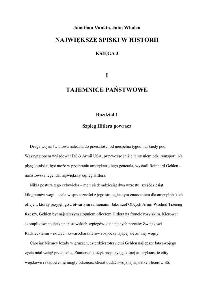 Jonathan Vankin, John Whalen NAJWIĘKSZE SPISKI W HISTORII KSIĘGA 3 I TAJEMNICE PAŃSTWOWE Rozdział 1 Szpieg Hitlera powraca Druga wojna światowa naleŜała do przeszłości od niespełna tygodnia, kiedy pod Waszyngtonem wylądował DC-3 Armii USA, przywoŜąc ściśle tajny niemiecki transport. Na płytę lotniska, być moŜe w przebraniu amerykańskiego generała, wysiadł Reinhard Gehlen nazistowska legenda, największy szpieg Hitlera. Nikła postura tego człowieka – metr siedemdziesiąt dwa wzrostu, sześćdziesiąt kilogramów wagi – stała w sprzeczności z jego strategicznym znaczeniem dla amerykańskich oficjeli, którzy przyjęli go z otwartymi ramionami. Jako szef Obcych Armii Wschód Trzeciej Rzeszy, Gehlen był najstarszym stopniem oficerem Hitlera na froncie rosyjskim. Kierował skomplikowaną siatką nazistowskich szpiegów, działających przeciw Związkowi Radzieckiemu – nowych szwarccharakterów rozpoczynającej się zimnej wojny. ChociaŜ Niemcy leŜały w gruzach, czterdziestotrzyletni Gehlen najlepsze lata swojego Ŝycia miał wciąŜ przed sobą. Zamierzał złoŜyć propozycję, której amerykańskie elity wojskowe i rządowe nie mogły odrzucić: chciał oddać swoją tajną siatkę oficerów SS, podziemnych sympatyków faszyzmu, zbiegłych zbrodniarzy wojennych i opasłe tomy akt o Rosjanach na słuŜbę Wuja Sama. Sprytnie walczący o przeŜycie Gehlen ukrył pełne akta swojej organizacji dotyczące ZSRR w austriackich Alpach, kiedy tylko upadek nazistowskich Niemiec stał się pewny. Gehlen wiedział, Ŝe teraz, po wojnie z faszystowskimi Niemcami, głównym wojskowym i politycznym celem kapitalistycznego Zachodu stanie się wojna z komunizmem. Pisze w swoich pamiętnikach: „UwaŜałem, Ŝe w Europie, zbrojącej się do walki z komunizmem, powinno być miejsce takŜe dla Niemiec. Dlatego musieliśmy skupić się na zachodnich mocarstwach i wyznaczyć sobie dwa cele: pomóc zatrzymać ekspansję komunizmu i odzyskać, a później zjednoczyć terytoria utracone przez Niemcy”. (Najwyraźniej Gehlen był dla Amerykanów tak cenny, Ŝe byli skłonni przymknąć oko na jego wciąŜ aktualne poglądy na temat „Deutschland über alles”.) Niedługo po kapitulacji Niemiec Gehlen wyszedł ze swojej alpejskiej kryjówki i oddał się w ręce amerykańskich władz. - Jestem szefem wydziału Obce Armie Wschód kwatery głównej niemieckiej armii – oznajmił na wstępie przygotowanej wcześniej mowie. – Posiadam informacje najwyŜszej wagi dla waszego rządu. - Jasne, wszyscy posiadacie – uciął amerykański kapitan i wysłał aroganckiego, pełnego temperamentu generała do obozu w Salzburgu wraz z resztą wziętych do niewoli nazistów. Gehlen jednak nie tkwił tam długo. Po niecałym miesiącu, kiedy Związek Radziecki zaŜądał wydania jego i jego akt, superszpiega Hitlera zaczęli odwiedzać waŜni amerykańscy goście. W Fort Hunt niedaleko Waszyngtonu, gdzie kelner w stopniu podoficera i kilku porządkowych w białych marynarkach dbało o jego potrzeby, Gehlen rozmawiał z doradcą prezydenta Trumana do spraw bezpieczeństwa narodowego, z grupą generałów wywiadu i z Allenem Dullesem, waŜną personą w amerykańskiej głównej agencji wywiadowczej czasu wojny, Biurem SłuŜb Strategicznych (OSS). Dulles przejął potem stery CIA. Po roku pobytu w Waszyngtonie Gehlen wrócił do Vaterlandu – bynajmniej nie jako więzień, lecz jako wpływowy agent amerykańskiej antykomunistycznej wojny nerwów z Rosją. Teraz, gdy znów dowodził swoją dawną organizacją, stał się dla Ameryki głównym źródłem informacji o Związku Radzieckim. Jego wpływ na amerykańską politykę podobno był ogromny, i jak w pakcie doktora Fausta z diabłem, pociągnęło to za sobą konsekwencje: przejaskrawione meldunki Gehlena o sile rosyjskich wojsk doprowadziły eskalację zimnej wojny do niebezpiecznego poziomu. O nawiązaniu przez rząd Stanów Zjednoczonych współpracy z Gehlenem i setkami innych wysokich stopniem nazistów, rzadko wspomina się w oficjalnej historii Ameryki. Amerykańscy dygnitarze, obawiający się wręcz paranoicznie zagroŜenia sowieckimi wpływami w powojennej Europie i na świecie, znaleźli pokrewne dusze w rekrutowanych przez siebie nazistowskich naukowcach i oficerach SS. W końcu niemieccy faszyści równieŜ zawzięcie walczyli z komunizmem. Powołując się na okoliczności zimnej wojny, Dulles odrzucił wszelkie skrupuły i zatrudnił Gehlena. Jest po naszej stronie i tylko to się liczy, uwaŜał. Podczas gdy amerykańskie wojsko polowało na nazistowskich zbrodniarzy wojennych, inne agencje rządowe Stanów Zjednoczonych po cichu tych samych zbrodniarzy werbowały. Departament Wojny tajną operację ściągania nazistowskich naukowców oznaczył kryptonimem „Spinacz do papieru”. UŜywano do tego „wypranych”, poprawionych dokumentów, dzięki którym prześlizgiwali się przez sito urzędu imigracyjnego. W Niemczech wielu z tych naukowców włączało się do nieludzkich doświadczeń na więźniach Dachau i czerpało korzyści z niewolniczej pracy w innych obozach koncentracyjnych. Na początku lat 80. XX wieku amerykański Departament Sprawiedliwości zidentyfikował wielu weteranów nazizmu, wciąŜ jeszcze mieszkających w Stanach Zjednoczonych. Rada Bezpieczeństwa Narodowego Trumana wydała tajne dyrektywy, sankcjonujące korzystanie z usług byłych nazistów. Dotyczące ich dokumenty zostały potem zniszczone lub ukryte duŜym nakładem środków, a więc pełna historia aliansu Ameryki z niedobitkami nazistów pozostaje częściowo niewyjaśniona. MoŜe i nie uratowano mózgu Hitlera, jak głosiły teorie spiskowe w filmach klasy B, jednak aparat szpiegowski Führera znalazł sobie nowego Ŝywiciela, gdy dołączył do wojskowych i wywiadowczych agencji Ameryki. Jak na ironię, gdy prezydent Truman rozwiązywał OSS i ostrzegał przed stworzeniem trwałej „gestapowskiej” agencji wywiadu, jego własna 