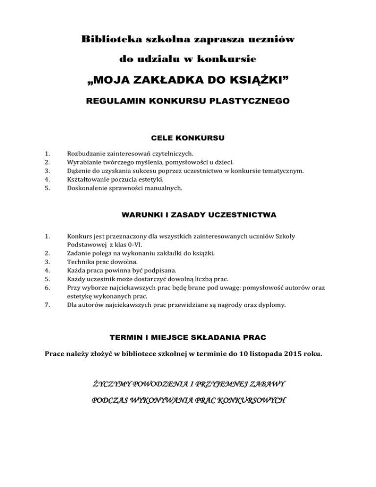 Biblioteka szkolna zaprasza uczniów do udziału w konkursie „MOJA ZAKŁADKA DO KSIĄŻKI” REGULAMIN KONKURSU PLASTYCZNEGO CELE KONKURSU 1. 2. 3. 4. 5. Rozbudzanie zainteresowań czytelniczych. Wyrabianie twórczego myślenia, pomysłowości u dzieci. Dążenie do uzyskania sukcesu poprzez uczestnictwo w konkursie tematycznym. Kształtowanie poczucia estetyki. Doskonalenie sprawności manualnych. WARUNKI I ZASADY UCZESTNICTWA 1. 2. 3. 4. 5. 6. 7. Konkurs jest przeznaczony dla wszystkich zainteresowanych uczniów Szkoły Podstawowej z klas 0-VI. Zadanie polega na wykonaniu zakładki do książki. Technika prac dowolna. Każda praca powinna być podpisana. Każdy uczestnik może dostarczyć dowolną liczbą prac. Przy wyborze najciekawszych prac będę brane pod uwagę: pomysłowość autorów oraz estetykę wykonanych prac. Dla autorów najciekawszych prac przewidziane są nagrody oraz dyplomy. TERMIN I MIEJSCE SKŁADANIA PRAC Prace należy złożyć w bibliotece szkolnej w terminie do 10 listopada 2015 roku. ŻYCZYMY POWODZENIA I PRZYJEMNEJ ZABAWY PODCZAS PODCZAS WYKONYWANIA PRAC KONKURSOWYCH