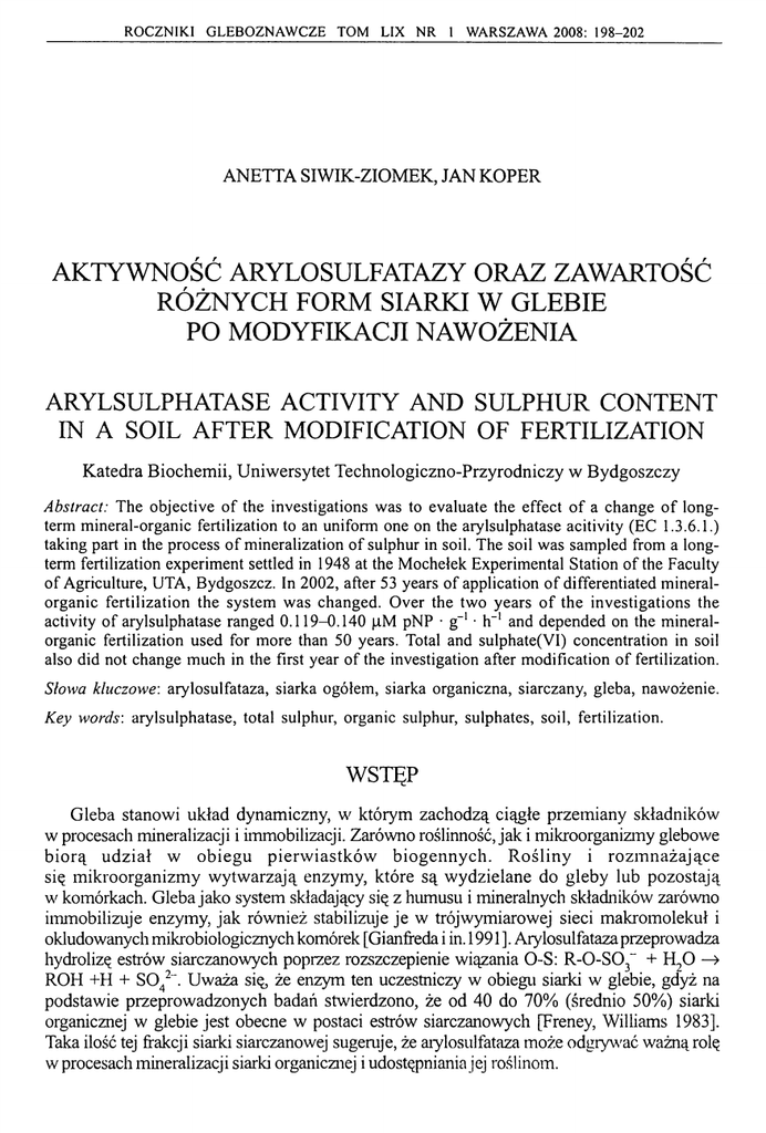 R OCZNIKI GLEBOZNAW CZE TOM LIX NR 1 W ARSZAW A 2008: 1 9 8 -2 0 2 ANETTA SIWIK-ZIOMEK, JAN KOPER A K T Y W N O ŚĆ ARYLOSULFATAZY O RAZ ZAWARTOŚĆ R Ó Ż N Y C H FORM SIARKI W G LEBIE PO M ODYFIK ACJI N A W O ŻEN IA ARYLSULPHATASE ACTIVITY A N D SULPHUR CONTENT IN A SOIL AFTER MODIFICATION OF FERTILIZATION Katedra Biochemii, Uniwersytet Technologiczno-Przyrodniczy w Bydgoszczy A b stra ct: T he objective o f the investigations w as to ev aluate the effect o f a change o f long term m ineral-organic fertilization to an uniform one on the arylsulphatase acitivity (EC 1.3.6.1.) taking part in the process o f m ineralization o f sulphur in soil. The soil w as sam pled from a long term fertilization experim ent settled in 1948 at the M ochełek E xperim ental Station o f the Faculty o f A griculture, UTA, B ydgoszcz. In 2002, after 53 years o f application o f differentiated m ineralo rg an ic fertilizatio n the sy stem w as ch an g ed . O v er the tw o y ears o f th e in v estig a tio n s the activity o f arylsulphatase ranged 0 .1 1 9 -0 .1 4 0 \xM pN P • g-1 • h_1 and depended on the m ineralorganic fertilization used for m ore than 50 years. Total and sulphate(V I) concentration in soil also did not change m uch in the first year o f the investigation after m odification o f fertilization. Słow a klu czo w e: ary losulfataza, siarka ogółem , siarka organiczna, siarczany, gleba, naw ożenie. K ey w ords: arylsulphatase, total sulphur, organie sulphur, sulphates, soil, fertilization. WSTĘP Gleba stanowi układ dynamiczny, w którym zachodzą ciągłe przemiany składników w procesach mineralizacji i immobilizacji. Zarówno roślinność, jak i mikroorganizmy glebowe biorą udział w obiegu pierw iastków biogennych. R ośliny i rozm nażające się mikroorganizmy wytwarzają enzymy, które są wydzielane do gleby lub pozostają w komórkach. Gleba jako system składający się z humusu i mineralnych składników zarówno immobilizuje enzymy, jak również stabilizuje je w trójwymiarowej sieci makromolekuł i okludowanych mikrobiologicznych komórek [Gianfreda i in. 1991 ]. Arylosulfataza przeprowadza hydrolizę estrów siarczanowych poprzez rozszczepienie wiązania O-S: R -0 -S 0 3~ + H20 —> ROH +H + S 0 42". Uważa się, że enzym ten uczestniczy w obiegu siarki w glebie, gdyż na podstawie przeprowadzonych badań stwierdzono, że od 40 do 70% (średnio 50%>) siarki organicznej w glebie jest obecne w postaci estrów siarczanowych [Freney, Williams 1983]. Taka ilość tej frakcji siarki siarczanowej sugeruje, że arylosulfataza może odgrywać ważną rolę w procesach mineralizacji siarki organicznej i udostępniania jej roślinom. Aktywność arylosulfatazy oraz zawartość różnych form siarki w glebie.. 199 Celem przeprowadzonych badań było określenie wpływu zmiany wieloletniego mineralnoorganicznego nawożenia na jednolite mineralne oraz na dynamikę aktywności arylosulfatazy (EC 1.3.6.1.) uczestniczącej w procesie mineralizacji związków siarki w glebie. MATERIAŁ I METODY M ateriał glebowy do badań pobrano z wieloletniego doświadczenia nawozowego założonego w 1948 roku w Stacji Badawczej Wydziału Rolniczego ATR w Mochełku koło Bydgoszczy Obejmowało ono czternaście następujących obiektów 1. Bez nawożenia, 2. Słoma + NPK, 3. NPK + Ca, 4. NPK, 5. Obornik, 6. Obornik + PK, 7. Obornik + KN, 8. Obornik + KN + Mg, 9. Obornik + PN, 10. Obornik + PN + Mg, 11. Obornik + NPK, 12. Obornik + NPK + Mg, 13. Obornik + NPK + Ca, 14. Obornik + NPK + Ca + Mg. Obiekt doświadczalny zlokalizowano na glebie płowej typowej, wytworzonej z piasku gliniastego mocnego i lekkiego, klasy bonitacyjnej IVa, kompleksu żytniego bardzo dobrego. Badanie prowadzono tylko w poziomie Ap wymienionej gleby. W 2002 roku, po 53 latach stosow ania zróżnicow anego naw ożenia m ineralno-organicznego zm odyfikow ano doświadczenie i na wszystkich poletkach doświadczalnych zastosowano wapnowanie i jednakow e naw ożenie mineralne: 50 kg N-ha_1; 17,5 kg P- ha-1; 41,5 kg К • ha-1; wapnowanie zastosowano w 2001 roku w dawce 1073 kg CaO • ha-1. Celem nowego doświadczenia było poznanie następczego oddziaływania wieloletniego, zróżnicowanego naw ożenia naturalnego i organiczno-m ineralnego po zastosow aniu w apnow ania i ujednoliceniu nawożenia mineralnego. Próbki glebowe do analiz pobrano czterokrotnie w trakcie sezonów wegetacyjnych 2001 i 2002 roku z warstwy 5-25 cm poziomu Ap. Aktywność arylosulfatazy w glebie oznaczono metodą Tabatabai i Bremnera [1970], zawartość siarki ogółem i siarczanowej (VI) oznaczono wg Bardsleya i Lancastera [I960]. Zawartość pozostałych składników pokarmowych dla roślin oraz pH oznaczono metodami powszechnie stosowanymi. Do obliczeń wykorzystano program FR-ANALWAR na bazie Microsoft Excel. Analizę korelacji wykonano w programie „Statistica fo r Windows ” WYNIKI I DYSKUSJA Substancja organiczna gleby oraz produkty jej biologicznych i biochem icznych przem ian, decydują o korzystnym układzie całego kom pleksu w łaściw ości gleby, stanowiących ojej żyzności i urodzajności. Przeprowadzona analiza wariancji wykazała wpływ kombinacji nawozowych stosowanych przez 50 lat na średnią zawartość węgla organicznego i azotu ogółem w glebie po zaprzestaniu stosow ania tego nawozu. Zawartość węgla organicznego w analizowanym materiale glebowym mieściła się w przedziale 4,705 g • kg"1 do 6,643 g • kg“1. Istotnie najniższą zawartość С oznaczono w próbkach pobranych z obiektu kontrolnego i z obiektów nawożonych tylko nawozami mineralnymi (tab. 1). Zawartość azotu ogółem w badanym poziomie Ap z analizowanego doświadczenia w M ochełku mieściła się w przedziale 0,413-0,628 g • kg-1 (tab. 1). Istotnie najniższą zaw artość N og oznaczono w próbkach pobranych z obiektu nawożonego obornikiem + PK oraz NPK + Ca. Niską zawartość tego składnika materii organicznej stwierdzono także w próbkach p