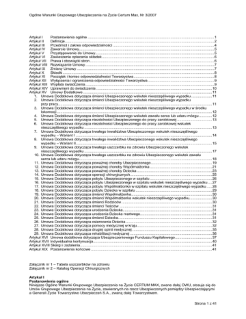 Ogólne Warunki Grupowego Ubezpieczenia na Życie Certum Max, Nr 3/2007 Artykuł I Postanowienia ogólne ....................................................................................................................1 Artykuł II Definicje.........................................................................................................................................2 Artykuł III Przedmiot i zakres odpowiedzialności .............................................................................................4 Artykuł IV Zawarcie Umowy............................................................................................................................5 Artykuł V Przystępowanie do Umowy.............................................................................................................5 Artykuł VI Zawieszenie opłacania składek.......................................................................................................6 Artykuł VII Prawa i obowiązki stron..................................................................................................................6 Artykuł VIII Rozwiązanie Umowy ......................................................................................................................7 Artykuł IX Zmiany Umowy ..............................................................................................................................7 Artykuł X Składki...........................................................................................................................................8 Artykuł XI Początek i koniec odpowiedzialności Towarzystwa..........................................................................8 Artykuł XII Wyłączenia i ograniczenia odpowiedzialności Towarzystwa.............................................................9 Artykuł XIII Wypłata świadczenia ......................................................................................................................9 Artykuł XIV Uprawnieni do świadczenia ..........................................................................................................10 Artykuł XV Umowy Dodatkowe ......................................................................................................................11 1. Umowa Dodatkowa dotycząca śmierci Ubezpieczonego wskutek nieszczęśliwego wypadku ...................11 2. Umowa Dodatkowa dotycząca śmierci Ubezpieczonego wskutek nieszczęśliwego wypadku przy pracy.............................................................................................................................................11 3. Umowa Dodatkowa dotycząca śmierci Ubezpieczonego wskutek nieszczęśliwego wypadku w środku lokomocji ..............................................................................................................................................12 4. Umowa Dodatkowa dotycząca śmierci Ubezpieczonego wskutek zawału serca lub udaru mózgu ............12 5. Umowa Dodatkowa dotycząca niezdolności Ubezpieczonego do pracy zarobkowej ................................13 6. Umowa Dodatkowa dotycząca niezdolności Ubezpieczonego do pracy zarobkowej wskutek nieszczęśliwego wypadku .....................................................................................................................13 7. Umowa Dodatkowa dotycząca trwałego inwalidztwa Ubezpieczonego wskutek nieszczęśliwego wypadku – Wariant I .............................................................................................................................14 8. Umowa Dodatkowa dotycząca trwałego inwalidztwa Ubezpieczonego wskutek nieszczęśliwego wypadku – Wariant II.............................................................................................................................15 9. Umowa Dodatkowa dotycząca trwałego uszczerbku na zdrowiu Ubezpieczonego wskutek nieszczęśliwego wypadku .....................................................................................................................17 10. Umowa Dodatkowa dotycząca trwałego uszczerbku na zdrowiu Ubezpieczonego wskutek zawału serca lub udaru mózgu..........................................................................................................................18 11. Umowa Dodatkowa dotycząca poważnej choroby Ubezpieczonego........................................................19 12. Umowa Dodatkowa dotycząca poważnej choroby Współmałżonka .........................................................21 13. Umowa Dodatkowa dotycząca poważnej choroby Dziecka .....................................................................23 14. Umowa Dodatkowa dotycząca operacji chirurgicznych...........................................................................25 15. Umowa Dodatkowa dotycząca pobytu Ubezpieczonego w szpitalu .........................................................26 16. Umowa Dodatkowa dotycząca pobytu Ubezpieczonego w szpitalu wskutek nieszczęśliwego wypadku....27 17. Umowa Dodatkowa dotycząca pobytu Współmałżonka w szpitalu wskutek nieszczęśliwego wypadku .....28 18. Umowa Dodatkowa dotycząca pobytu Dziecka w szpitalu ......................................................................29 19. Umowa Dodatkowa dotycząca śmierci Współmałżonka..........................................................................30 20. Umowa Dodatkowa dotycząca śmierci Współmałżonka wskutek nieszczęśliwego wypadku.....................30 21. Umowa Dodatkowa dotycząca śmierci Rodziców ...................................................................................30 22. Umowa Dodatkowa dotycząca śmierci Teściów .....................................................................................31 23. Umowa Dodatkowa dotycząca urodzenia Dziecka..................................................................................31 24. Umowa Dodatkowa dotycząca