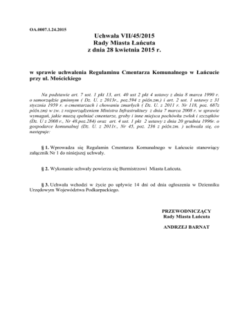 OA.0007.1.24.2015 Uchwała VII/45/2015 Rady Miasta Łańcuta z dnia 28 kwietnia 2015 r. w sprawie uchwalenia Regulaminu Cmentarza Komunalnego w Łańcucie przy ul. Mościckiego Na podstawie art. 7 ust. 1 pkt 13, art. 40 ust 2 pkt 4 ustawy z dnia 8 marca 1990 r. o samorządzie gminnym ( Dz. U. z 2013r., poz.594 z późn.zm.) i art. 2 ust. 1 ustawy z 31 stycznia 1959 r. o cmentarzach i chowaniu zmarłych ( Dz. U. z 2011 r. Nr 118, poz. 687z późn.zm) w zw. z rozporządzeniem Ministra Infrastruktury z dnia 7 marca 2008 r. w sprawie wymagań, jakie muszą spełniać cmentarze, groby i inne miejsca pochówku zwłok i szczątków (Dz. U z 2008 r., Nr 48.poz.284) oraz art. 4 ust. 1 pkt 2 ustawy z dnia 20 grudnia 1996r. o gospodarce komunalnej (Dz. U. z 2011r., Nr 45, poz. 236 z późn.zm. ) uchwala się, co następuje: § 1. Wprowadza się Regulamin Cmentarza Komunalnego w Łańcucie stanowiący załącznik Nr 1 do niniejszej uchwały. § 2. Wykonanie uchwały powierza się Burmistrzowi Miasta Łańcuta. § 3. Uchwała wchodzi w życie po upływie 14 dni od dnia ogłoszenia w Dzienniku Urzędowym Województwa Podkarpackiego. PRZEWODNICZĄCY Rady Miasta Łańcuta ANDRZEJ BARNAT Załącznik Nr 1 do Uchwały Nr VII/45/2015 Rady Miasta Łańcuta z dnia 28 kwietnia 2015 r. Regulamin Cmentarza Komunalnego w Łańcucie przy ul. Mościckiego Rozdział I Postanowienia ogólne § 1. Ilekroć w Regulaminie jest mowa o: 1) ustawie o cmentarzach i chowaniu zmarłych - należy przez to rozumieć ustawę z dnia 31 stycznia 1959 r. ( Dz. U. z 2011 r., Nr 118, poz. 687, z późn. zm.), 2) rozporządzeniu - należy przez to rozumieć rozporządzenie Ministra Infrastruktury z dnia 7 marca 2008 r. w sprawie wymagań, jakie muszą spełniać cmentarze, groby i inne miejsca pochówku zwłok i szczątków (Dz. U. z 2008 r., Nr 48, poz. 284), 3) Gminie - należy przez to rozumieć Gminę Miasto Łańcut, 4) Burmistrzu - należy przez to rozumieć Burmistrza Miasta Łańcuta, 5) miejscu grzebalnym - należy przez to rozumieć miejsce wyznaczone na cmentarzu do urządzenia grobu, 6) grobie ziemnym - należy przez to rozumieć dół w ziemi o wymiarach określonych w rozporządzeniu, do którego składa się trumnę ze zwłokami lub urnę i zasypuje ziemią 7) nagrobku - należy przez to rozumieć płytę nagrobkową z kamienia naturalnego lub sztucznego, ułożoną na grobie zimnym, 8) grobie murowanym - należy przez to rozumieć dół, w którym boki są murowane lub betonowe do poziomu gruntu, do którego składa się trumnę ze zwłokami lub urnę a nad trumną zakłada się sklepienie, 9) grobie rodzinnym - należy przez to rozumieć grób do poziomu gruntu, przeznaczony do składania, dwóch lub więcej trumien ze zwłokami lub urn, o wymiarach określonych w rozporządzeniu, 10) kolumbarium - należy przez to rozumieć budowlę z niszami przeznaczonymi do składania urn, 11) miejscu rezerwowym - należy przez to rozumieć miejsce grzebalne przeznaczone do pochowania, udostępnione osobie za jej życia, po uiszczeniu należnej opłaty, 12) ossarium - należy przez to rozumieć budowlę wolnostojącą, w której złożone są szczątki ludzkie np. po ekshumacji z likwidowanego grobu, 13) mogile zbiorowej – należy przez to rozumieć grób, w którym dokonano zbiorowego pochówku szczątków ludzkich, 14) mogile symbolicznej - należy przez to rozumieć grób bez pochowanych szczątków, upamiętniający osobę zmarłą, 15) założycielu grobu - należy przez to rozumieć osobę, która jako pierwsza uiściła opłatę za miejsce grzebalne, 16) dysponencie grobu - należy przez to rozumieć założyciela grobu oraz członków rodziny osoby pochowanej w tym grobie, uprawnionych do podejmowania decyzji dotyczących danego grobu w oparciu o przepisy i w kolejności wymienionej w art. 10 ust. 1 ustawy, reguły dziedziczenia, stopień powiązań rodzinnych z osobami zmarłymi, ustalenia między osobami uprawnionymi i inne okoliczności, 17) Administratorze – należy przez to rozumieć podmiot administrujący Cmentarzem Komunalnym w Łańcucie przy ul. Mościckiego, 18) pracach pielęgnacyjnych zieleni - należy przez to rozumieć wycinkę i pielęgnację drzew i krzewów, ukwiecanie, koszenie traw, utrzymanie klombów , § 2. Cmentarz Komunalny w Łańcucie, dalej zwany "Cmentarzem" stanowi własność Gminy Miasto Łańcut. § 3. 1. Cmentarz Komunalny służy do grzebania zmarłych z terenu Gminy Miasto Łańcut, w uzasadnionych sytuacjach Burmistrz Miasta Łańcuta może wyrazić zgodę na pochówek zmarłych spoza Miasta Łańcuta. 2. Zadania i uprawnienia Gminy Miasto Łańcut w zakresie zarządzania Cmentarzem Komunalnym wykonuje Burmistrz Miasta Łańcuta, przy czym czynności te może powierzyć na mocy stosownej umowy innym podmiotom. 3. W sprawach związanych z prawami do grobu, zagospodarowaniem i utrzymaniem cmentarza, Administrator cmentarza przyjmuje zainteresowanych w dni robocze w godzinach od 7.00-15.00 4. Nadzór nad działalnością Administratora cmentarza sprawuje Burmistrz Miasta Łańcuta. 5. Wnioski i skargi na Administratora można kierować do Burmistrza Miasta Łańcuta. 6. Dane Administratora (nazwa, adres firmy, telefon, godziny urzędowania, godziny pełnienia dyżurów) winny być umieszczone na tablicy ogłoszeń cmentarza. Rozdział II Ogólne zasady korzystania z Cmentarza Komunalnego. § 4. 1. Osoby przebywające na terenie cmentarza zobowiązane są do zachowania spokoju i powagi tego miejsca oraz szacunku należnego zmarłym. 2. Dysponenci grobów, osoby przebywające na cmentarzu oraz podmioty gospodarcze świadczące usługi na terenie cmentarza zobowiązane są do stosowania się do niniejszego Regulaminu oraz zaleceń i informacji Administratora cmentarza umieszczanych na tablicach informacyjnych zlokalizowanych na cmentarzu oraz stronie internetowej Administratora. § 5. 1. Zagospodarowanie cmentarza odbywa się na podstawie planu sytuacyjnego terenu uwzględniającego m.in.