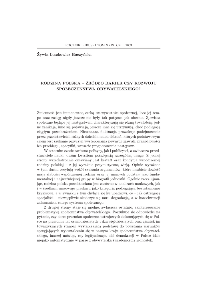 ROCZNIK LUBUSKI TOM XXIX, CZ. I, 2003 Żywia Leszkowicz-Baczyńska RODZINA POLSKA – ŹRÓDŁO BARIER CZY ROZWOJU SPOŁECZEŃSTWA OBYWATELSKIEGO? Zmienność jest immanentną cechą rzeczywistości społecznej, lecz jej tempo oraz zasięg nigdy jeszcze nie były tak potężne, jak obecnie. Zjawiska społeczne będące jej następstwem charakteryzują się różną trwałością: jedne zanikają, inne się pojawiają, jeszcze inne się utrzymują, choć podlegają ciągłym przeobrażeniom. Nieustanna fluktuacja prowokuje podejmowanie przez przedstawicieli różnych dziedzin nauki działań, których podstawowym celem jest szukanie przyczyn występowania pewnych zjawisk, prawidłowości ich przebiegu, specyfiki, wreszcie prognozowanie następstw. W ostatnim czasie zarówno politycy, jak i publicyści, a zwłaszcza przedstawiciele nauki, dwóm kwestiom poświęcają szczególną uwagę. Z jednej strony wszechstronnie omawiany jest kształt oraz kondycja współczesnej rodziny polskiej – z jej wyraźnie pesymistyczną wizją. Opinie wyrażane w tym duchu oscylują wokół szukania argumentów, które niezbicie dowieść mają słabości współczesnej rodziny oraz jej marnych podstaw jako fundamentalnej i najważniejszej grupy w biografii jednostki. Ogólnie rzecz ujmując, rodzina polska przedstawiana jest zarówno w analizach naukowych, jak i w środkach masowego przekazu jako kategoria podlegająca bezustannemu kryzysowi, a w związku z tym chyląca się ku upadkowi, co – jak ostrzegają specjaliści – niewątpliwie skończyć się musi degradacją, a w konsekwencji załamaniem całego systemu społecznego. Z drugiej strony staje się modne, zwłaszcza ostatnio, zainteresowanie problematyką społeczeństwa obywatelskiego. Poszukuje się odpowiedzi na pytanie, czy okres przemian społeczno-ustrojowych dokonujących się w Polsce na przełomie lat osiemdziesiątych i dziewięćdziesiątych oraz zjawisk im towarzyszących stanowi wystarczającą podstawę do powstania warunków sprzyjających wykształceniu się w naszym kraju społeczeństwa obywatelskiego, inaczej mówiąc, czy legitymizacja idei demokracji w Polsce idzie niejako automatycznie w parze z obywatelską świadomością jednostek. 98 Żywia LESZKOWICZ-BACZYŃSKA Kariera, jaką w ostatnim okresie w gremiach naukowych, politycznych oraz publicystyce robi pojęcie społeczeństwa obywatelskiego, wymusza i uzasadnia refleksję naukową nad tą kwestią. Zamierzeniem autorki nie jest rozstrzyganie, czym jest społeczeństwo obywatelskie ani też jakie warunki sprzyjają jego ukonstytuowaniu. Problemy te zostaną poruszone o tyle, o ile służyć będą wyjaśnieniu sformułowanych tutaj tez. Rozważania koncentrować się będą przede wszystkim na rodzinie i jej roli w kształtowaniu oraz upowszechnianiu idei „obywatelskości”. Wydaje się bowiem, że te dwa pozornie odległe od siebie zagadnienia nie tylko mają ze sobą wiele wspólnego, ale wręcz wzajemnie się determinują. Omawiane zagadnienie wiąże się z próbą zasygnalizowania nieco odmiennego od tradycyjnego spojrzenia na rodzinę. Tytuł ma sugerować, że rodzina jest strukturą pośredniczącą, wiążącą jednostkę z szerszymi strukturami społecznymi. Podejście takie zakłada konieczność zweryfikowania ogólnie obowiązujących poglądów na temat kryzysu współczesnej rodziny oraz wskazuje, że historyczne analizy życia rodzinnego powinny służyć czemuś więcej, aniżeli tylko tworzeniu szczegółowych modeli pojęciowych, za pomocą których porównuje się dynamikę oraz kierunek zmian tej kategorii społecznej. Pogląd ten można przedstawić w postaci kilku szczegółowych tez. Weryfikacji winno zostać poddane twierdzenie sugerujące głęboki kryzys współczesnej rodziny. Czyniąc kryzys współczesnej rodziny punktem wyjścia w analizie rzeczywistości społecznej i upatrując w niej przyczyn upadku norm moralnych oraz etycznych społeczeństwa, przyjmuje się a priori , jako fakt niezaprzeczalny i oczywisty, że stanowi ona źródło załamania systemu społecznego, a co za tym idzie – ogólnospołecznego kryzysu. Argumentami potwierdzającymi ten stan rzeczy stają się przytaczane chętnie przez badaczy wzrastające wskaźniki rozwodów i przemocy w rodzinie, rosnąca agresja (zwłaszcza wśród młodych ludzi), kurcząca się struktura rodziny powodowana powolnym zanikaniem funkcji prokreacyjnej. Stan ten, zdaniem wielu osób zainteresowanych problematyką rodziny, pogłębiają dodatkowo tak „niekorzystne” z punktu widzenia rodziny zjawiska, jak emancypacja kobiet, u źródła której leży masowy dostęp do edukacji oraz rosnąca w tej kategorii aktywność zawodowa. Nie kwestionując faktu pojawiania się szeregu negatywnych zjawisk nękających współczesną rodzinę, należy z całą mocą podkreślić, że koncentracja uwagi na jej dekompozycji powoduje przesunięcie punktu zainteresowań z szerszej perspektywy kontekstów społecznych i prowadzenie analiz empi- RODZINA POLSKA – ŹRÓDŁO BARIER CZY ROZWOJU. . . 99 rycznych „tu i teraz”. W rezultacie ich duża część odwołuje się do poziomu rzeczywistości, którą G. Simmel określał mianem „gorącej”. To sprawia, że część analiz empirycznych zaczyna oscylować między standardami „wiedzy potocznej”, w dużej części opartej na stereotypach, a standardami naukowymi, tracąc z pola widzenia granicę dzielącą te dwa sięgające do odrębnych poziomów rzeczywistości sposoby wyjaśniania. Wskazanie pewnych pułapek ograniczających perspektywę socjologiczną, prowokuje ustalenie kolejnych logicznych z tego punktu widzenia wniosków. Przyjęcie twierdzenia, że obecnie rodzina znajduje się w stanie kryzysu, sugeruje, by poszukiwać w niej przyczyn nasilających się zjawisk patologicznych (wszelkiego rodzaju uzależnień, nasilającej się agresji, zwłaszcza wśród młodzieży, przestępczości, a także niekorzystnych zmian w obyczajowo
