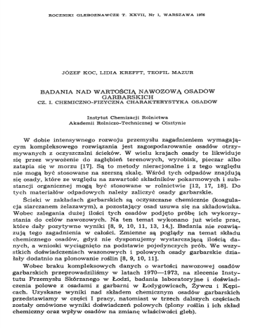 R O C Z N IK I G L E B O Z N A W C Z E T. X X V II, N r 1, W A R S Z A W A 1976 JÓZEF KOC, L ID IA K REFFT, TEOFIL M AZUR BADANIA NAD WARTOŚCIĄ NAWOZOWĄ OSADÓW GARBARSKICH CZ. I. C H EM ICZNO-FIZYCZNA C H A RA K TERY STY K A OSADÓW In stytu t C hem izacji R oln ictw a A k ad em ii R oln iczo-T echn iczn ej w O lsztynie W dobie intensywnego rozwoju przemysłu zagadnieniem wym agają cym kompleksowego rozwiązania jest zagospodarowanie osadów otrzy m ywanych z oczyszczalni ścieków. W wielu krajach osady te likwiduje się przez wywożenie do zagłębień terenowych, wyrobisk, pieczar albo zatapia się w morzu [17]. Są to metody nieracjonalne i z tego względu nie mogą być stosowane na szerszą skalę. Wśród tych odpadów znajdują się osady, które ze względu na zawartość składników pokarmowych i sub stancji organicznej mogą być stosowane w rolnictwie [12 , 17, 18]. Do tych materiałów odpadowych należy zaliczyć osady garbarskie. Ścieki w zakładach garbarskich są oczyszczane chemicznie (koagula cja siarczanem żelazawym), a pozostający osad usuwa się na składowiska. Wobec zalegania dużej ilości tych osadów podjęto próbę ich wykorzy stania do celów nawozowych. Na ten temat wykonano już w iele prac, które dały pozytywne wyniki [8 , 9, 10 , 11 , 13, 14,]. Badania nie rozwią zują tego zagadnienia w całości. Zmienne są poglądy na temat składu chemicznego osadów, gdyż nie dysponujemy wystarczającą ilością da nych, a wnioski wyciągnięto na podstawie pojedynczych prób. We wszy stkich doświadczeniach wazonowych i polowych osady garbarskie dzia łały dodatnio na plonowanie roślin [8 , 9, 10, 11]. Wobec braku kompleksowych danych o wartości nawozowej osadów garbarskich przeprowadziliśmy w latach 1970— 1973, na zlecenie Insty tutu Przem ysłu Skórzanego w Łodzi, badania laboratoryjne i doświad czenia polowe z osadami z garbarni w Łodygowicach, Żywcu i Kępi cach. Uzyskane wyniki nad składem chemicznym osadów garbarskich przedstawiamy w części I pracy, natomiast w trzech dalszych częściach zostały omówione wyniki doświadczeń polowych (plony roślin i ich skład chemiczny oraz w pływ osadów na zmianę właściwości gleb). 104 J. Koc, L. К-refft, T. Mazur M ATERIAŁ I M ETO DYKA B A D A Ń " W latach 1970— 1973 do badań składu chemicznego pobrano 17 próbek z garbarni roślinnej w Łodygowicach, 20 próbek z garbarni chromowej w Żywcu i 13 próbek z garbarni roślinno-chromowej w Kępicach. Próbki pobierano z całego przekroju warstwy osadu na poletku osadowym w kilkudziesięciu punktach; następnie próbki dokładnie mieszano otrzymu jąc próbkę średnią. Przy typowaniu poletek do pobierania próbek kie rowano się stanem odwodnienia osadów; wybierano te poletka, z któ rych osad był przeznaczony do usuwania. W średnich próbkach ozna czono: — zawartość suchej masy w temperaturze 105°C, — zawartość popiołu przez spalenie osadów w 550°C, — pH w H20 i w KC1 metodą potencjometryczną, — zawartość N ogółem metodą Kjeldahla, — azot amonowy, — fosfor metodą molibdenowo-wanadową, — potas, wapń i sód fotopłomieniometrycznie, — magnez metodą kolorymetryczną z żółcienią tytanową, — siarkę nefelometrycznie, — żelazo metodą rodankową [7], — tłuszcze przez ekstrakcję eterem naftowym [7]. Chrom ogółem oznaczono zmodyfikowaną metodą dla ścieków gar barskich [4]. 0,5 g dobrze zmielonego osadu zadawano w kolbie K jel dahla kolejno: 5 ml stężonego H N 0 3, 1 ml H 20 2 i 10 ml 60-procentowego HC104. Po 12 godzinach spalano początkowo na słabym płomieniu przez 2— 3 minuty, a następnie zwiększano płomień. Spalanie prowa dzono do momentu, aż zawartość przybrała zabarwienie pomarańczowe, pochodzące od związków chromu sześciowartościowego. Następnie za wartość kolby studzono i dodawano 100 ml wody i 10 kropli 25-procentowego HC1, po czym intensyw nie ogrzewano przez 3 minuty. Tak przy gotowany roztwór przenoszono ilościowo do kolb miarowych na 200 ml. Zawartość chromu oznaczano kolorymetrycznie. Reakcję barwną w yw o ływano ОД-procentowym acetonowym roztworem dwufenylokarbazydu. Kolorymetrowanie przeprowadzano przy długości fali 550 mjjt. Jako wzor ca użyto wodnych roztworów K 2Cr20 7. Właściwości buforowe osadów garbarskich oznaczono względem 0,ln HC1. Wielkość próbki osadu wynosiła 10 g w przeliczeniu na suchą ma sę. Po dodaniu kolejnych ilości kwasu solnego próbkę mieszano i ozna czono pH. Oznaczono zdolność sorbowania przez osady garbarskie jonów amo nowych, potasowych i fosforanowych. Do badań użyto roztworów: ln chlorku potasowego, chlorku amonowego i fosforanu jednowapniowego. Stosunek suchej masy osadu do roztworu w ynosił jak 1:10. Zawartość Charakterystyka chemiczno-fizyczna osadów garbarskich 105 badanych jonów oznaczano w roztworach wyjściowych i po 24 godzi nach. Różnicę stężeń przyjęto jako ilość jonów zasorbowanych przez osad garbarski. OMÓW IENIE W YNIKÓW Osady garbarskie swym wyglądem i właściwościami fizycznym i róż nią się od innych nawozów organicznych (tab. 1). Osady ze wszystkich garbarń posiadały zapach gnilny, który pochodził od wydzielających się produktów rozpadu związków organicznych. Różniły się one pod w zglę dem konsystencji, najbardziej płynne były osady z Łodygowic, nato miast pozostałe dwa osady wyglądem przypominały kompost. Ciężar w ła ściw y osadów wahał się od 1,005 do 1,200, średnio dla wszystkich w y nosił 1,058. pH osadów wahało się od 6,6 do 9,7, w większości próbek osady miały odczyn alkaliczny. Zawartość suchej masy w osadach była skorelowana z konsystencją osadów (tab. 2 ). Osady z Łodygowic ze względu na niską zawartość su chej masy (4,6%) można zaliczyć do nawozów płynnych. Osady z dwu pozostałych garbarń były w znacznie większym stopniu odwodnione i za wierały zbliżone ilości suchej masy (