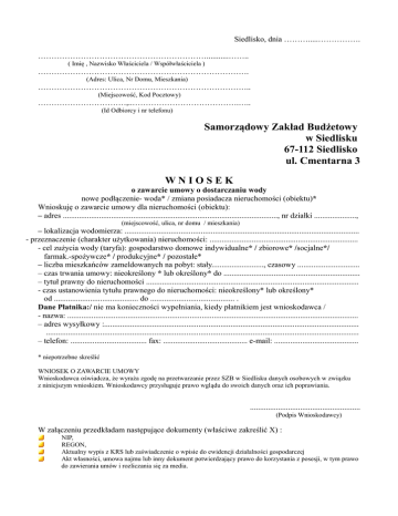 Siedlisko, dnia ……….....……………. ………………………………………………………...........…….. ( Imię , Nazwisko Właściciela / Współwłaściciela ) ……………………………………………………………………. (Adres: Ulica, Nr Domu, Mieszkania) …………………………………………………………………….. (Miejscowość, Kod Pocztowy) ……………………………,..………………………………….….. (Id Odbiorcy i nr telefonu) Samorządowy Zakład Budżetowy w Siedlisku 67-112 Siedlisko ul. Cmentarna 3 WNIOSEK o zawarcie umowy o dostarczaniu wody nowe podłączenie- woda* / zmiana posiadacza nieruchomości (obiektu)* Wnioskuję o zawarcie umowy dla nieruchomości (obiektu): – adres ..........................................................................................................., nr działki ....................., (miejscowość, ulica, nr domu / mieszkania) – lokalizacja wodomierza: ..................................................................................................................... - przeznaczenie (charakter użytkowania) nieruchomości: .......................................................................... - cel zużycia wody (taryfa): gospodarstwo domowe indywidualne* / zbiorowe* /socjalne*/ farmak.-spożywcze* / produkcyjne* / pozostałe* – liczba mieszkańców zameldowanych na pobyt: stały.........................., czasowy ............................... – czas trwania umowy: nieokreślony * lub określony* do .................................................................... – tytuł prawny do nieruchomości .......................................................................................................... - czas ustanowienia tytułu prawnego do nieruchomości: nieokreślony* lub określony* od .......................................... do .......................................... . Dane Płatnika:/ nie ma konieczności wypełniania, kiedy płatnikiem jest wnioskodawca / - nazwa: ................................................................................................................................................. – adres wysyłkowy :............................................................................................................................... ............................................................................................................................................................ – telefon: ...................................... fax: .......................................... e-mail: .......................................... * niepotrzebne skreślić WNIOSEK O ZAWARCIE UMOWY Wnioskodawca oświadcza, że wyraża zgodę na przetwarzanie przez SZB w Siedlisku danych osobowych w związku z niniejszym wnioskiem. Wnioskodawcy przysługuje prawo wglądu do swoich danych oraz ich poprawiania. ....................................................... (Podpis Wnioskodawcy) W załączeniu przedkładam następujące dokumenty (właściwe zakreślić X) : NIP, REGON, Aktualny wypis z KRS lub zaświadczenie o wpisie do ewidencji działalności gospodarczej Akt własności, umowa najmu lub inny dokument potwierdzający prawo do korzystania z posesji, w tym prawo do zawierania umów i rozliczania się za media.