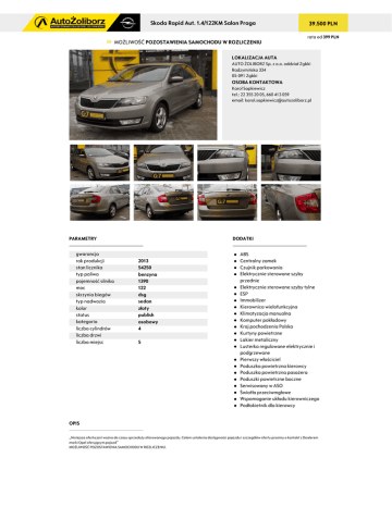 Skoda Rapid Aut. 1.4/122KM Salon Praga MOŻLIWOŚĆ POZOSTAWIENIA SAMOCHODU W ROZLICZENIU 39.500 PLN rata od 399 PLN LOKALIZACJA AUTA AUTO ŻOLIBORZ Sp. z o.o. oddział Ząbki Radzymińska 334 05-091 Ząbki OSOBA KONTAKTOWA Karol Sapkiewicz tel.: 22 355 20 05, 660 413 059 email: [email protected] PARAMETRY gwarancja rok produkcji stan licznika typ paliwa pojemność silnika moc skrzynia biegów typ nadwozia kolor status kategoria liczba cylindrów liczba drzwi liczba miejsc DODATKI 2013 54250 benzyna 1390 122 dsg sedan złoty publish osobowy 4 5 ABS Centralny zamek Czujnik parkowania Elektrycznie sterowane szyby przednie Elektrycznie sterowane szyby tylne ESP Immobilizer Kierownica wielofunkcyjna Klimatyzacja manualna Komputer pokładowy Kraj pochodzenia Polska Kurtyny powietrzne Lakier metaliczny Lusterka regulowane elektrycznie i podgrzewane Pierwszy właściciel Poduszka powietrzna kierowcy Poduszka powietrzna pasażera Poduszki powietrzne boczne Serwisowany w ASO Światła przeciwmgłowe Wspomaganie układu kierowniczego Podłokietnik dla kierowcy OPIS „Niniejsza oferta jest ważna do czasu sprzedaży oferowanego pojazdu. Celem ustalenia dostępności pojazdu i szczegółów oferty prosimy o kontakt z Dealerem marki Opel oferującym pojazd” MOŻLIWOŚĆ POZOSTAWIENIA SAMOCHODU W ROZLICZENIU.