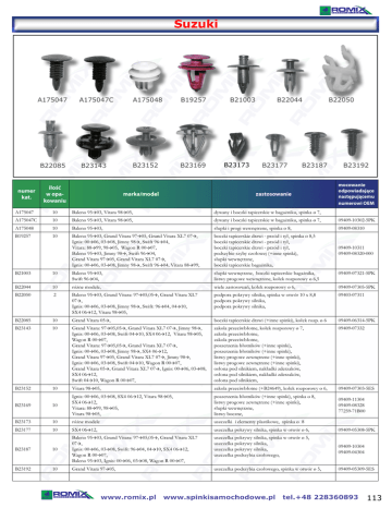 Suzuki A175047 B22085 numer kat. A175047C A175048 B19257 B23143 B23152 B23169 ilość w opakowaniu marka/model B21003 B23173 B22044 B23177 B23187 zastosowanie B22050 B23192 mocowanie odpowiadające następującemu numerowi OEM A175047 10 Baleno 95→03, Vitara 98→05, dywany i boczki tapicerskie w bagażniku, spinka ø 7, A175047C 10 Baleno 95→03, Vitara 98→05, dywany i boczki tapicerskie w bagażniku, spinka ø 7, 09409-10302-5PK A175048 10 Baleno 95→03, słupki i progi wewnętrzne, spinka ø 8, 09409-08310 B19257 10 Baleno 95→03, Grand Vitara 97→05, Grand Vitara XL7 07→, Ignis: 00→06, 03→08, Jimny 98→, Swift 96→04, Vitara: 88→99, 98→05, Wagon R 00→07, Baleno 95→03, Jimny 98→, Swift 96→04, Grand Vitara 97→05, Grand Vitara XL7 07→, Ignis: 00→06, 03→08, Jimny 98→, Swift 96→04, Vitara 88→99, boczki tapicerskie drzwi - przód i tył, spinka ø 8,5 boczki tapicerskie drzwi - przód i tył, boczki tapicerskie drzwi - przód i tył, podszybie szyby czołowej (+inne spinki), słupki wewnętrzne, boczki tapicerskie bagażnika, 09409-10311 09409-08320-000 Baleno 95→03, Swift 96→04, słupki wewnętrzne, boczki tapicerskie bagażnika, listwy progowe wewnętrzne, kołek rozporowy ø 6,5 09409-07321-5PK B21003 10 B22044 10 różne modele, wiele zastosowań, kołek rozporowy ø 6, 09409-07305-5PK B22050 2 Baleno 95→03, Grand Vitara: 97→05,05→, Grand Vitara XL7 07→, Ignis: 00→06, 03→08, Jimny 98→, Swift: 96→04, 04→10, SX4 06→12, Vitara 98→05, podpora pokrywy silnika, spinka w otwór 10 x 8,8 podpora pokrywy silnika, podpora pokrywy silnika, 09403-07311 B22085 10 Grand Vitara 05→, boczki tapicerskie drzwi (+inne spinki), kołek rozp. ø 6 09409-06314-5PK B23143 10 Grand Vitara: 97→05,05→, Grand Vitara XL7 07→, Jimny 98→, Ignis: 00→06, 03→08, Swift 04→10, SX4 06→12, Vitara 98→05, Wagon R 00→07, Grand Vitara: 97→05,05→, Grand Vitara XL7 07→, Ignis: 00→06, 03→08, Jimny 98→, SX4 06→12, Grand Vitara 97→05, Grand Vitara XL7 07→, Jimny 98→, Ignis: 00→06, 03→08, Swift 04→10, Wagon R 00→07, Grand Vitara 05→, Grand Vitara XL7 07→, Ignis: 00→06, 03→08, SX4 06→12, Swift 04→10, Wagon R 00→07, zakola przeciwbłotne, kołek rozporowy ø 7, zakola przeciwbłotne, zakola przeciwbłotne, poszerzenia błotników (+inne spinki), poszerzenia błotników (+inne spinki), listwy progowe zewnętrzne (+inne spinki), listwy progowe zewnętrzne (+inne spinki), osłona pod silnikiem, nakładki zderzaków, osłona pod silnikiem, nakładki zderzaków, osłona pod silnikiem, 09409-07332 B23152 10 Vitara 98→05, zakola przeciwbłotne (+B24649), kołek rozporowy ø 6, 09409-07303-5ES 10 Ignis: 00→06, 03→08, SX4 06→12, Vitara 98→05, SX4 06→12, Vitara: 88→99, 98→05, Vitara 98→05, poszerzenia błotników (+inne spinki), spinka ø 8, listwy progowe zewnętrzne (+inne spinki), słupki wewnętrzne, listwy boczne, 09409-11304 09409-08328 77259-71B00 B23173 10 różne modele uszczelki i elementy plastikowe, spinka ø 8 B23177 10 SX4 06→12, uszczelka pokrywy silnika, spinka w otwór ø 6, B23187 10 Baleno 95→03, Grand Vitara: 97→05,05→, Grand Vitara XL7 07→, Ignis: 00→06, 03→08, Swift: 96→04, 04→10, SX4 06→12, Wagon R 00→07, Baleno 95→03, Ignis: 00→06, 03→08, Wagon R 00→07, uszczelka pokrywy silnika, spinka w otwór ø 5, uszczelka pokrywy silnika, uszczelka pokrywy silnika, uszczelka podszybia czołowego, B23192 10 Grand Vitara 97→05, uszczelka podszybia czołowego, spinka w otwór ø 5, B23169 www.romix.pl www.spinkisamochodowe.pl 09409-05308-5PK 09409-10304 09409-04304 09409-05309-5ES tel.+48 228360893 113 Suzuki B23322 B24649 C10119 numer kat. C10120 ilość w opakowaniu B25274 C10075 C60363 C60640 marka/model C10077 C10076 C60670 C60669 zastosowanie mocowanie odpowiadające następującemu numerowi OEM B23322 2 Vitara: 88→99, podpora pokrywy silnika, spinka w otwór 9 x 9, 09409-07307-5PK B24649 10 Grand Vitara 05→, Grand Vitara XL7 07→, Vitara 98→05, nakładki zderzaków - przód i tył, kołek rozporowy ø 7,7 zakola przeciwbłotne, poszerzenia błotników, 09409-08308 B25274 10 Baleno 95→03, Grand Vitara: 97→05,05→, Grand Vitara XL7 07→, podsufitka i jej elementy, kołek rozporowy ø 6, wykładziny i boczki tapicerskie bagażnika, 09409-06322 C10075 10 Grand Vitara 05→, Grand Vitara XL7 07→, Ignis 03→08, Grand Vitara 05→, Swift 04→10, SX4 06→12, Grand Vitara 05→, Grand Vitara 05→, Swift 04→10, SX4 06→12, Grand Vitara XL7 07→, Swift 04→10, SX4 06→12, Swift 04→10, listwy progowe zewnętrzne (+inne spinki), spinka ø 9, nakładki progowe wewnętrzne, listwy boczne, (+inne spinki), boczki tapicerskie drzwi i bagażnika, słupki wewnętrzne, poszerzenia błotników, 09409-10312 C10076 10 Grand Vitara XL7 07→, Swift 04→10, Ignis 00→06, Ignis: 00→06, 03→08, boczki tapicerskie bagażnika, spinka ø 9, nakładki progowe wewnętrzne, podszybie czołowe (+inne spinki), 09409-08331 C10077 10 Grand Vitara XL7 07→, Ignis: 00→06, 03→08, Swift 04→10, Wagon R 00→07, Ignis 03→08, SX4 06→12, nakładki zderzaków, kołek rozporowy ø 8, nakładki zderzaków, osłony i osprzęt w komorze silnika, podszybie czołowe (+inne spinki), 09409-08327 C10119 10 Grand Vitara: 97→05,05→, Grand Vitara: 97→05,05→, Swift 04→10, SX4 06→12, Wagon R 00→07, Wagon R 00→07, poszerzenia błotników, spinka w otwór 8,5 x 8,5, listwy boczne, podszybie szyby czołowej (+inne spinki), nakładki zderzaków, 77553-65D10 C10120 10 Baleno 95→03, Swift 96→04, Grand Vitara 97→05, Grand Vitara: 97→05,05→, Grand Vitara XL7 07→, Jimny 98→, Swift: 96→04, 04→10, Vitara: 88→99, 98→05, Wagon R 00→07, Ignis 00→06, Ignis 00→06, Jimny 98→, Swift 96→04, Jimny 98→, Swift 04→10, Vitara 98→05, zakola przeciwbłotne, osłona pod silnikiem, nakładki progowe wewnętrzne, podszybie szyby czołowej (+in