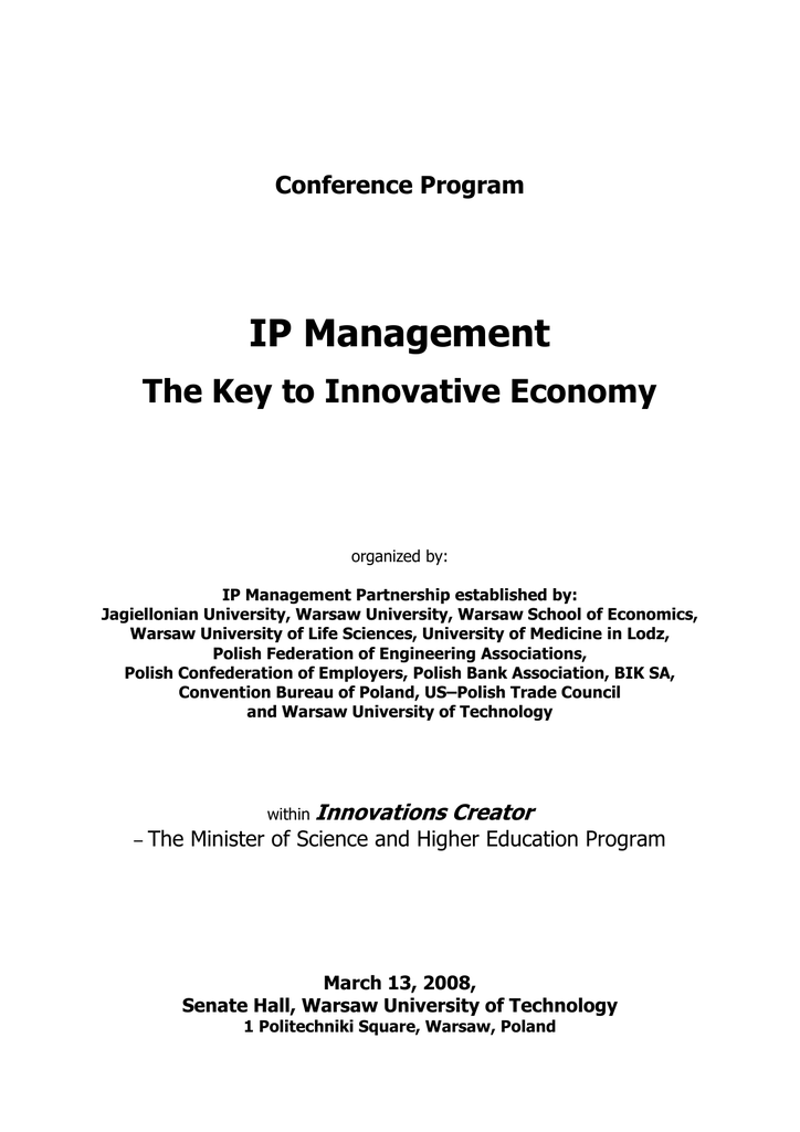 Conference Program March 11, 2008 IP Management The Key to Innovative Economy organized by: IP Management Partnership established by: Jagiellonian University, Warsaw University, Warsaw School of Economics, Warsaw University of Life Sciences, University of Medicine in Lodz, Polish Federation of Engineering Associations, Polish Confederation of Employers, Polish Bank Association, BIK SA, Convention Bureau of Poland, US–Polish Trade Council and Warsaw University of Technology within – Innovations Creator The Minister of Science and Higher Education Program March 13, 2008, Senate Hall, Warsaw University of Technology 1 Politechniki Square, Warsaw, Poland Programme Council: Chairman: Prof. Tadeusz Kulik – Steering Committee of IP Management Poland, Deputy Rector of Warsaw University of Technology Vice Chairman – Prof. Grzegorz Pawlicki – President of WUT Alumni Association Vice Chairman – Prof. Piotr D. Moncarz – Stanford University, Exponent, USPTC Secretary – Clay Bullwinkel – Stanford MBA, IP Communications, USPTC Secretary – Bogusław Węgliński – Coordinator of IP Management Poland Steering Committee of IP Management Poland: Prof. Ewa Okoń–Horodyńska – Jagiellonian University Prof. Marzenna Anna Weresa – Warsaw School of Economics Prof. Irena Ozimek – Warsaw University of Live Sciences Prof. Tadeusz Pietrucha –University of Medicine in Łódź Ewa Fedor – Confederation of Polish Employers Beata Ostrowska – Confederation of Polish Employers Arkadiusz Lewicki – Polish Bank Association Krzysztof Łebkowski – Polish Federation of Engineering Associations Members: Prof. Stanisław Mańkowski – Director of WUT Technology Transfer Centre Prof. Krzysztof Santarek – Dean of WUT Faculty of Production Engineering Dr Zbigniew Turowski – Director of WUT Business School Marta Kościółek – President of EKOINVEST Poland Jadwiga Pałka – President of Society of Managers, Inc. Stefan Assanowicz – President of Polish–Spanish Chamber of Commerce Antoni Dąbrowski – Chairman of Car Industry Suppliers Association Jacek Furga – Vice President of Banking Law and Information Centre Maciej Gierej – Director – Board Member of Mint of Poland – Precious Metals, Inc. Wiesław Kołodziejski – President of Mazovia Credit Insurance Fund Kazimierz Mart – Vice President of WUT Alumni Association Paweł Olczyk – Director – Board Member of Polish State Railways Krzysztof Paź – Board Member of WUT Alumni Association Jerzy Szewczyk – Treasurer of Vice Chairman Zbigniew Wojcieszek – Director of OFF-Art, Ltd. Dr. Henryk Wojtaś – CEO of KWH Bautechnologen AG Zurich Zbigniew Żurek – Vice President of Business Centre Club Organizing Committee: Chairman: Jerzy Baranowski – WUT Alumni Association Vice Chairman: Janusz Gast – IP Management Poland Vice Chairman: Krzysztof Świtalski – USPTC Secretary: Dr. Elżbieta Naumowicz – IP Management Poland Barbara Jopowicz – WUT Alumni Association Danuta Starzyńska – Polish Television Małgorzata Zielińska – EM Polska, Ltd. Adam Cymer – New Business Time Publishers Dr. Konrad Fiałkowski – Warsaw School of Economics Dr. Krzysztof Jaźwiński – Warsaw University Jacek Karczewski – LNS Ltd. Tadeusz Namedyński - Polish Federation of Engineering Associations Tomasz Tutak – WUT Alumni Association IP Management Poland 80 Koszykowa Str., suite 10 PL-02-002 Warsaw [email protected] www.FabrykaWynalazkow.pl Program 9.00 – 9.30 – registration, coffee 9.30 – 10.15 – opening remarks – chaired by Prof. Grzegorz Pawlicki – President of Warsaw University of Technology Alumni Association Prof. Tadeusz Kulik – Chairman of Partnership Steering Committee, Deputy Rector of Warsaw University of Technology Prof. Michał Kleiber – President of Polish Academy of Sciences Dr. Andrzej Smirnow – Chairman of Parliamentary Commission of Education, Science and Youth Mr. Marcin Korolec – Deputy Minister of the Economy Ms. Danuta Jabłońska – President of Polish Agency for Entrepreneurship Development Prof. Bogusław Smólski – Director of National Research and Development Centre Presentations and discussion contributions: 10.15 – 11.45 – Session I – chaired by Prof. Marzenna Anna Weresa – Head of World Economy Research Institute of Warsaw School of Economics – What is/where is the key to Innovative Economy in Poland? – Prof. Witold Orłowski – Head of Business School of Warsaw University of Technology – The Critical Role of Professional Venture Capital in Capitalizing on IP – Dr. Francis Skrobiszewski, Washington, D.C. – Financing technological enterprises in Poland – today and perspectives for tomorrow (Finansowanie technologicznych przedsiębiorstw w Polsce – stan obecny i perspektywy) – Krzysztof Pietraszkiewicz, President of Polish Bank Association – EBI offered Risk Sharing Financial Facility (supported by 7FP) and CIP Programme (Competitiveness and Innovation Framework Programme) financial instruments – Dr. Andrzej Siemaszko – National Contact Point for Research Programmes of EU – Poland – Between Trust and Legal Protection in VC Transactions – Dr. Rafał T. Stroiński – Warsaw University – Faculty of Law and Administration, Director of US-Polish Trade Council (representative in Poland), CMS Cameron McKenna Dariusz Greszta Sp. Kom. – 35 innovative companies in six month at NewConnect and other Warsaw Stock Exchange initiatives – Ludwik Sobolewski – President of Warsaw Stock Exchange, Inc. – Bio-Tech spin-off success story in less than 1 year – case study – Dr. Dariusz Śladowski – Scientific Director of EuroImplant Ltd. 11.45 – 12.30 – lunch 12.30 – 14.00 – Session II – chaired by Prof. Krzysztof Santarek – Dean of Faculty of Production Engineering of Warsaw University of Technology, Polish Federation of Engineering Associations Representative Up-to-date Technologies in Media – Prof. Marek Hołyński – Polis