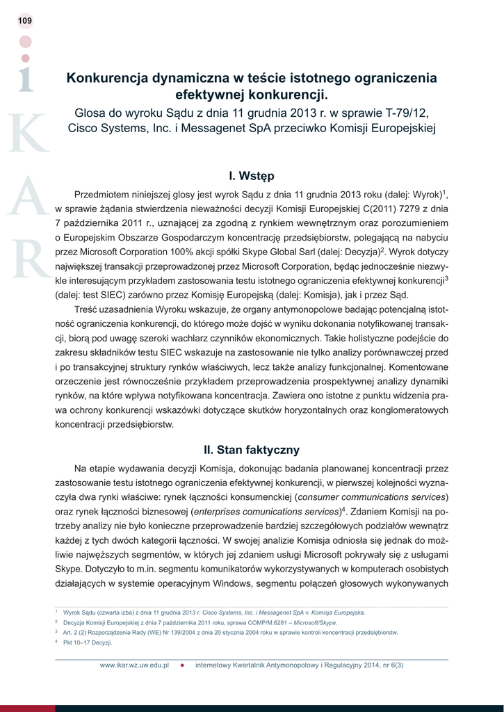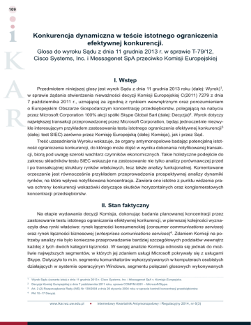 109 Konkurencja dynamiczna w teście istotnego ograniczenia efektywnej konkurencji. Glosa do wyroku Sądu z dnia 11 grudnia 2013 r. w sprawie T-79/12, Cisco Systems, Inc. i Messagenet SpA przeciwko Komisji Europejskiej I. Wstęp Przedmiotem niniejszej glosy jest wyrok Sądu z dnia 11 grudnia 2013 roku (dalej: Wyrok)1, w sprawie żądania stwierdzenia nieważności decyzji Komisji Europejskiej C(2011) 7279 z dnia 7 października 2011 r., uznającej za zgodną z rynkiem wewnętrznym oraz porozumieniem o Europejskim Obszarze Gospodarczym koncentrację przedsiębiorstw, polegającą na nabyciu przez Microsoft Corporation 100% akcji spółki Skype Global Sarl (dalej: Decyzja)2. Wyrok dotyczy największej transakcji przeprowadzonej przez Microsoft Corporation, będąc jednocześnie niezwykle interesującym przykładem zastosowania testu istotnego ograniczenia efektywnej konkurencji3 (dalej: test SIEC) zarówno przez Komisję Europejską (dalej: Komisja), jak i przez Sąd. Treść uzasadnienia Wyroku wskazuje, że organy antymonopolowe badając potencjalną istotność ograniczenia konkurencji, do którego może dojść w wyniku dokonania notyfikowanej transakcji, biorą pod uwagę szeroki wachlarz czynników ekonomicznych. Takie holistyczne podejście do zakresu składników testu SIEC wskazuje na zastosowanie nie tylko analizy porównawczej przed i po transakcyjnej struktury rynków właściwych, lecz także analizy funkcjonalnej. Komentowane orzeczenie jest równocześnie przykładem przeprowadzenia prospektywnej analizy dynamiki rynków, na które wpływa notyfikowana koncentracja. Zawiera ono istotne z punktu widzenia prawa ochrony konkurencji wskazówki dotyczące skutków horyzontalnych oraz konglomeratowych koncentracji przedsiębiorstw. II. Stan faktyczny Na etapie wydawania decyzji Komisja, dokonując badania planowanej koncentracji przez zastosowanie testu istotnego ograniczenia efektywnej konkurencji, w pierwszej kolejności wyznaczyła dwa rynki właściwe: rynek łączności konsumenckiej (consumer communications services) oraz rynek łączności biznesowej (enterprises comunications services)4. Zdaniem Komisji na potrzeby analizy nie było konieczne przeprowadzenie bardziej szczegółowych podziałów wewnątrz każdej z tych dwóch kategorii łączności. W swojej analizie Komisja odniosła się jednak do możliwie najwęższych segmentów, w których jej zdaniem usługi Microsoft pokrywały się z usługami Skype. Dotyczyło to m.in. segmentu komunikatorów wykorzystywanych w komputerach osobistych działających w systemie operacyjnym Windows, segmentu połączeń głosowych wykonywanych 1 Wyrok Sądu (czwarta izba) z dnia 11 grudnia 2013 r. Cisco Systems, Inc. i Messagenet SpA v. Komisja Europejska. 2 Decyzja Komisji Europejskiej z dnia 7 października 2011 roku, sprawa COMP/M.6281 – Microsoft/Skype. 3 Art. 2 (2) Rozporządzenia Rady (WE) Nr 139/2004 z dnia 20 stycznia 2004 roku w sprawie kontroli koncentracji przedsiębiorstw. 4 Pkt 10–17 Decyzji. www.ikar.wz.uw.edu.pl internetowy Kwartalnik Antymonopolowy i Regulacyjny 2014, nr 6(3) 110 Dariusz Aziewicz Konkurencja dynamiczna w teście istotnego ograniczenia efektywnej konkurencji przez komputery osobiste działających w systemie Windows i segmentu łączności wideo za pomocą tego samego rodzaju komputerów. Po przeprowadzeniu analizy Komisja uznała, że nawet w tych ścisłych segmentach transakcja nie budziła poważnych wątpliwości, co do zgodności z rynkiem wewnętrznym5. W szczególności, Komisja odniosła się do segmentu łączności wideo przez komputery osobiste, działające w systemie Windows (tzw. ścisły rynek), gdzie Microsoft po dokonaniu transakcji osiągnąłby udział w wysokości między 80 i 90%. Komisja stwierdziła, że na takim „ścisłym rynku” Microsoft będzie stale podlegał presji konkurencyjnej. W Decyzji przeanalizowano również potencjalne antykonkurencyjne skutki konglomeratowe na rynku usług łączności biznesowej, stwierdzając ich brak6. W tym aspekcie jedna z obaw dotyczyła możliwości, utworzenia preferencyjnego połączenia grupy klientów spółki Skype i grupy klientów korzystających z oprogramowania Lync, opracowanego przez Microsoft i przeznaczonego dla przedsiębiorstw7. Komisja wskazała, że nowy podmiot nie byłby zdolny ani skłonny do zastosowania tam strategii wykluczenia, a nawet gdyby tak się stało, jej antykonkurencyjne skutki były mało prawdopodobne8. W Decyzji przeanalizowano także czy koncentracja spowoduje skutki konglomeratowe na rynku łączności konsumenckiej, przy uwzględnieniu istotnej pozycji, z jakiej korzystały niektóre produkty spółki Microsoft (jak system Windows, przeglądarka Windows Internet Explorer oraz oprogramowanie Microsoft Office), na rynkach oprogramowania komputerowego. W tym zakresie Komisja uznała, że nowy podmiot byłby zdolny, ale nie byłby skłonny do wykorzystania swojej pozycji, poprzez pogorszenie interoperacyjności pomiędzy swoimi produktami a produktami konkurentów lub poprzez praktyki partnerskie czy też sprzedaż wiązaną9. W dniu 15 lutego 2012 roku Cisco Systems Inc. i Messagenet SpA, uczestniczące w postępowaniu w sprawie kontroli koncentracji Microsoft/Skype, wniosły do Sądu skargę na Decyzję. Skarżące spółki, wnosząc m.in. o stwierdzenie nieważności Decyzji, podniosły m.in. dwa zarzuty oczywistego błędu w ocenie, popełnionego przez Komisję przy zastosowaniu art. 2 i 6 rozporządzenia nr 139/2004, tj.: (i) zarzut dotyczący oceny horyzontalnych skutków koncentracji dla rynku komunikacji biznesowej, jakie miałoby ewentualne połączenie bazy użytkowników spółki Skype z usługami Lync oraz (ii) zarzut dotyczący możliwość wykorzystania przez Microsoft silnej pozycji na rynku łączności konsumenckiej, w szczególności łączności wideo jako dźwigni w celu zakłócenia warunków konkurencji na rynku łączności biznesowej (skutki konglomeratowe). III. Ustalenia